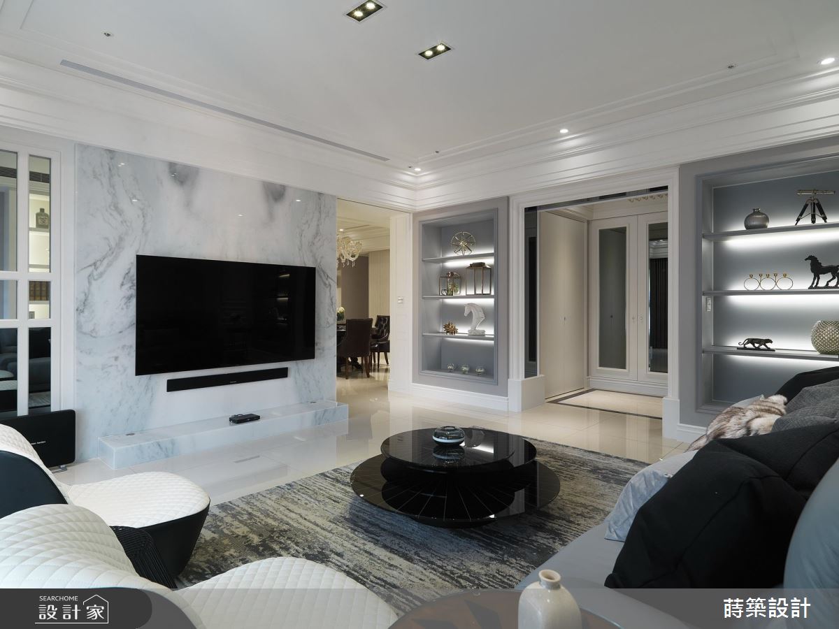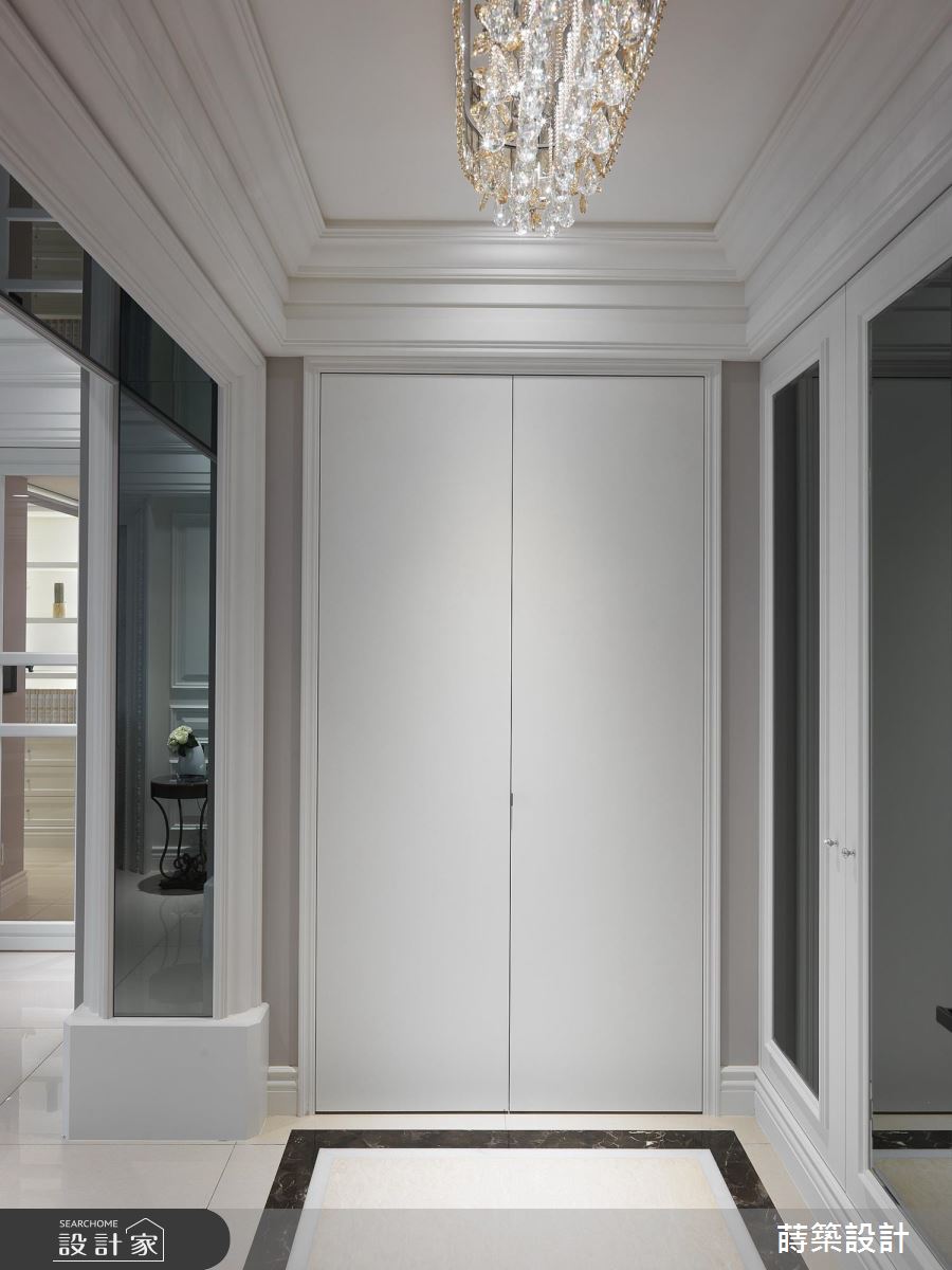 旋開大門、走進玄關,米色調的大理石鋪陳地坪,天花板藉由華麗的水晶吊燈,引入奢華氣息,兩側壁面則以白色鞋櫃、穿衣鏡為設計,鏡面的質材運用讓視覺更顯開闊、延伸。穿越貼附鏡面的門拱、來到公領域,玄關兩側以層板創造出展示空間,間接光源映照在陳列其中的藝術品,烘托精品藝術之美,同時形塑美學端景;客廳裡簡約中流露設計細節的沙發與座椅,加上雙層圓弧形的茶几擺設,傳遞優雅的生活步調;白色系大理石打造電視牆體,兩側搭以拉門與門扇分別通往餐廳與書房,展現流動的空間氛圍;沙發背牆以線板描繪出門拱造型,中央貼附印花壁紙,兩側以對稱的線板設計,交織出浪漫的古典情懷;書房空間裡創造一面書牆,虛實相兼的櫃體設計,替和諧的風格秩序注入些許變化,臨窗的臥榻處替屋主增添休閒的日常情境,若閱讀倦了,還能短暫休憩養神。