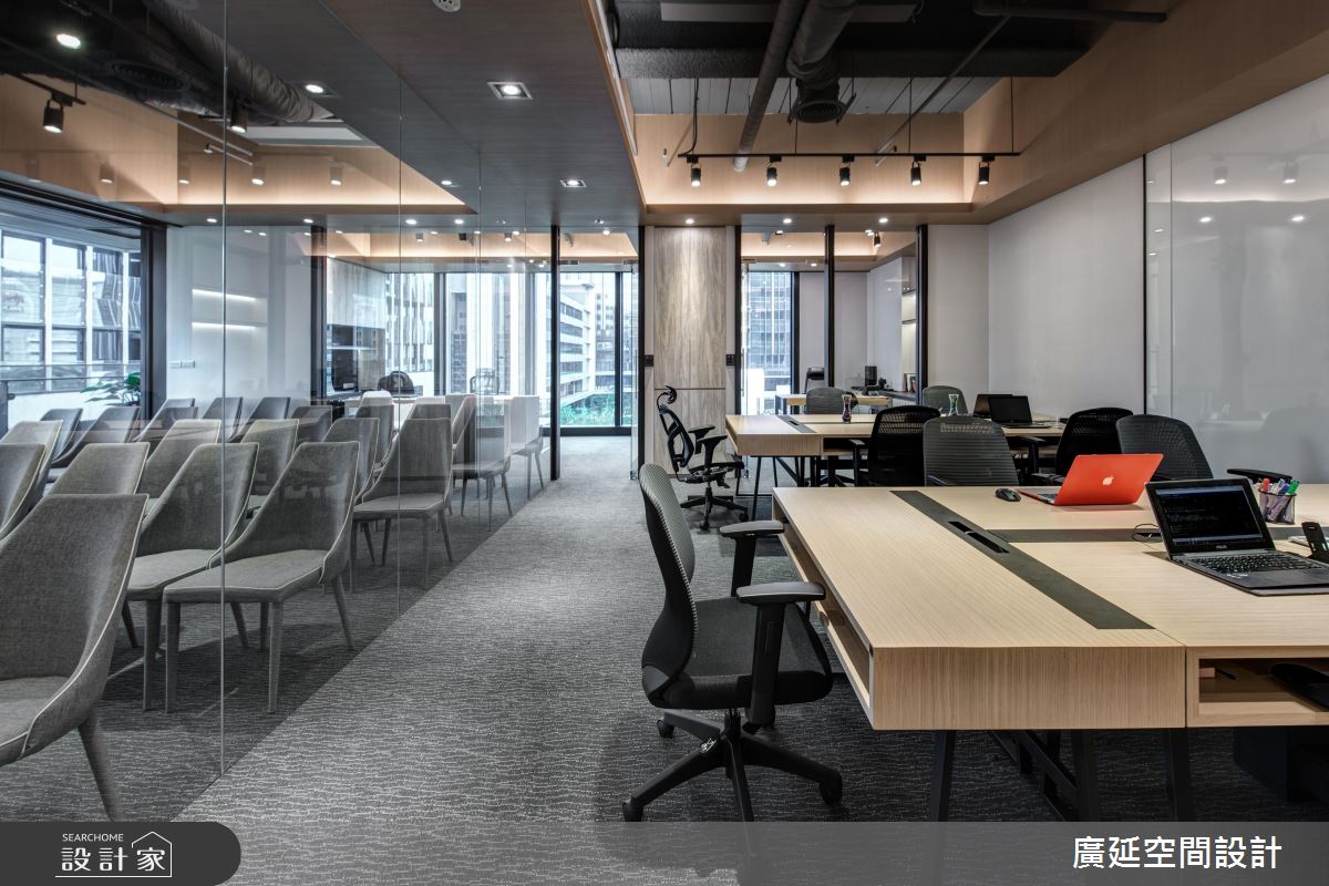 由於這個辦公室坐擁兩面採光的基地優勢,設計師取消制式辦公室隔間,採用全玻璃劃分大會議室、主管辦公室以及員工辦公區,延攬外部綠意藍天、創造明快風景。天花刻意部分不封頂,讓原始的空調、消防管線外露,搭配木皮與軌道燈,增添時髦的工業氣息。員工辦公區採用討論座位,搭配移動式白板,更能隨時進行小組會議。需要些微隱私性的主管辦公室,則採用獨立玻璃隔間進行區別。
