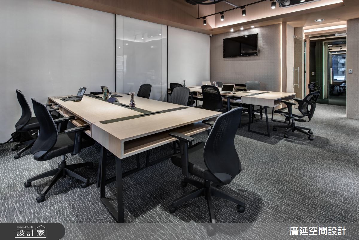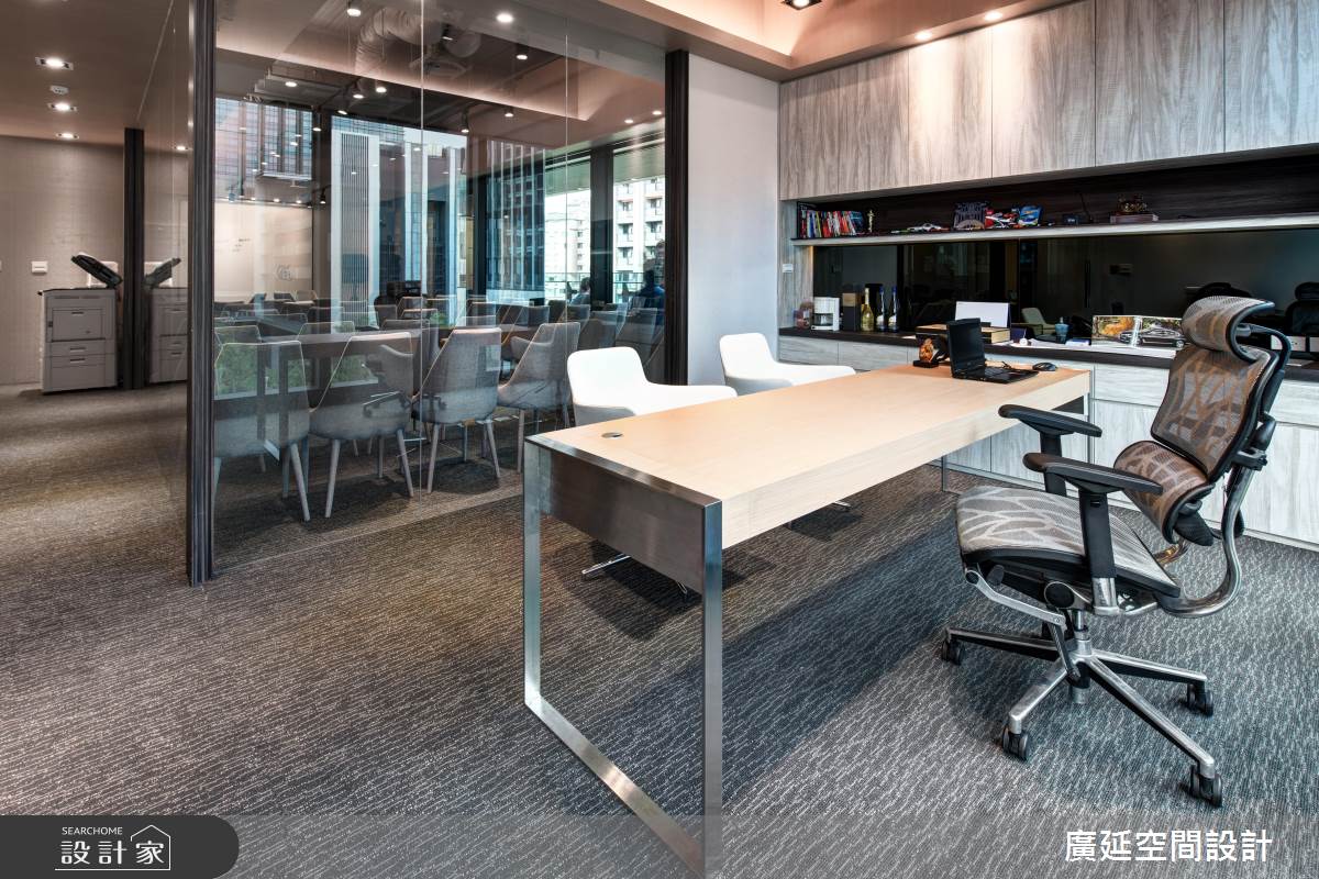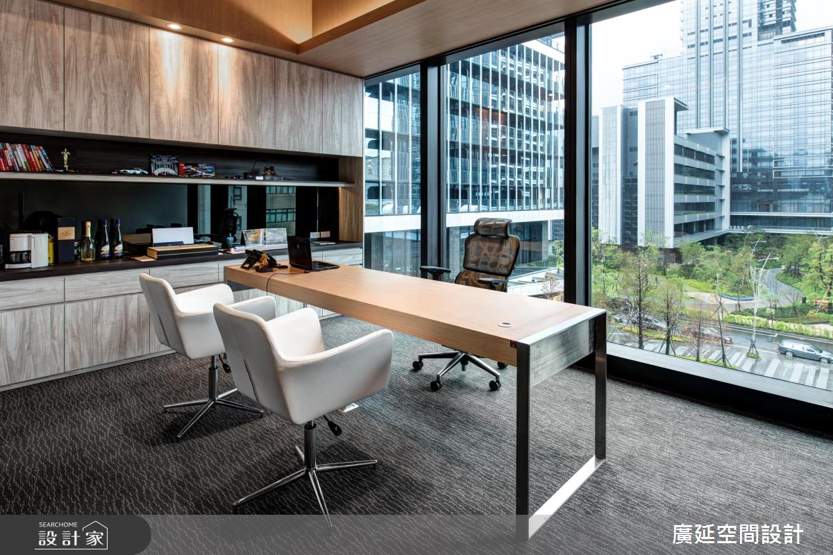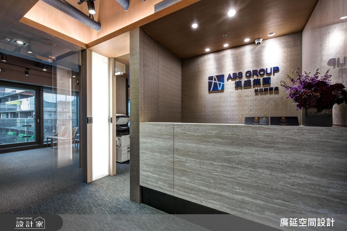 廣延空間設計為澳勝集團的台北辦事處進行空間規畫,善用新建大樓的 L 型採光面,為 40 坪空間帶來俐落、時尚的辦公氛圍。