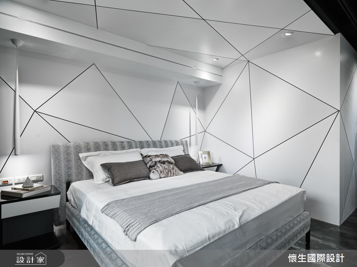 臥房壁面與天花板延續公領域的黑白幾何造型,不規則的拼接更營造了宛如身處太空梭的未來感。