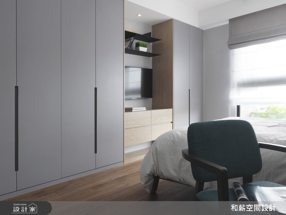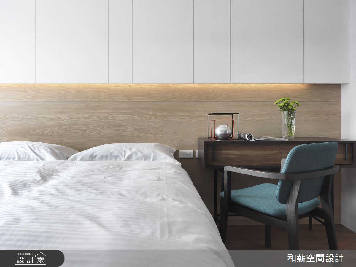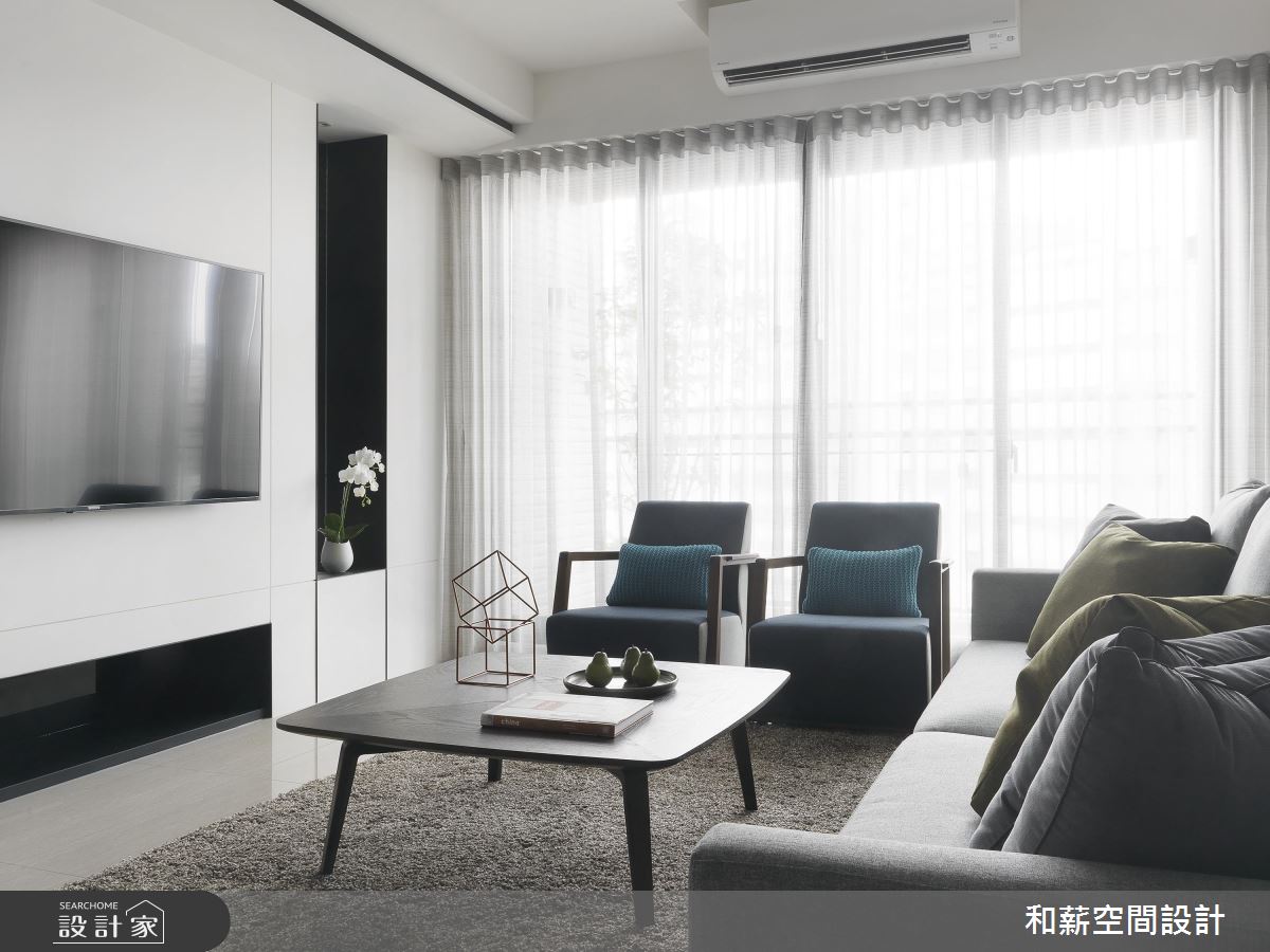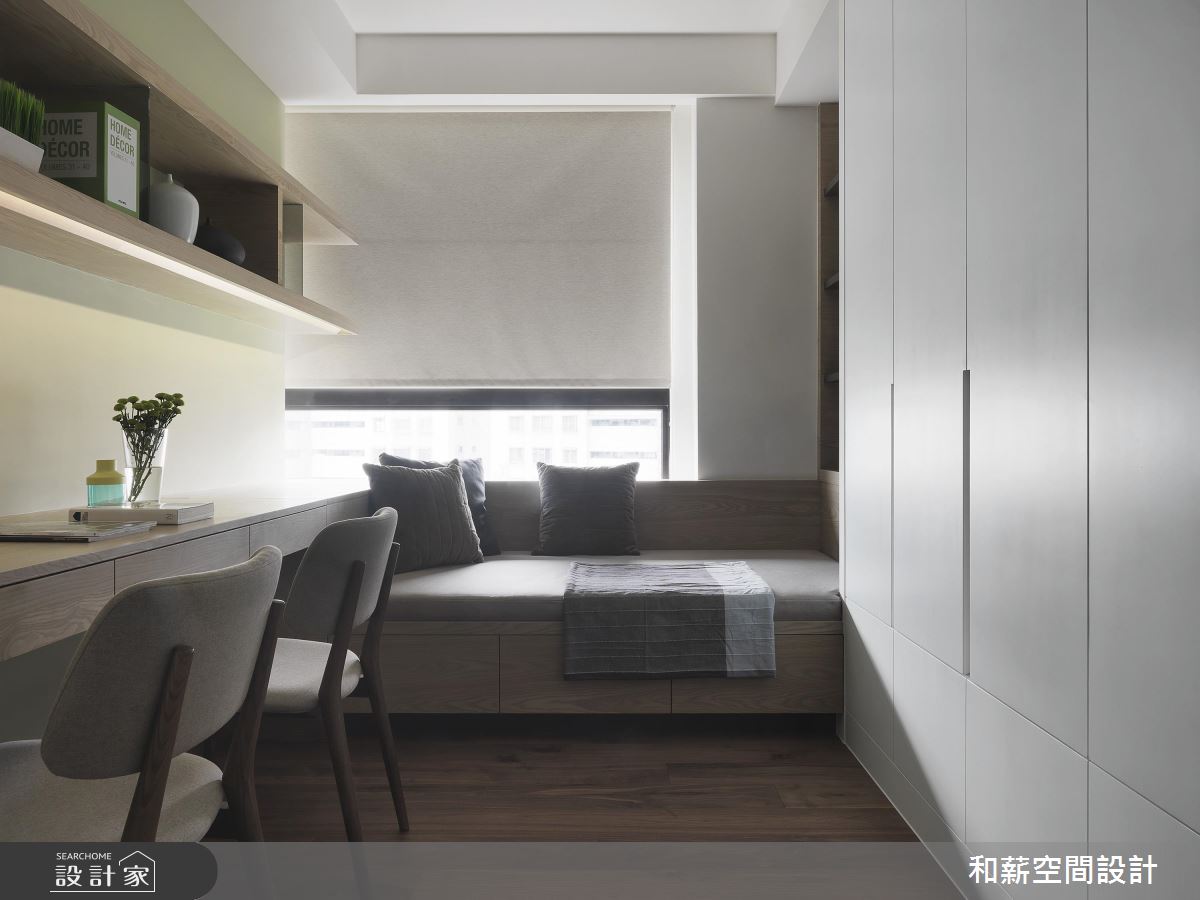 居家採以深淺色系木皮交錯搭配,營造視覺的細緻層次,再透過沙發抱枕等提點空間亮度,映襯大面積的窗光照拂,使廳區氛圍顯得簡潔而舒適,天花板則給予大面積留白,於電視牆選用黑色扁鐵擘劃流暢線性,型構白色主牆的立體層次,製造立面的延伸感;書房內,加入淺綠色增添視覺趣味,且特別於臨窗下方安排出臥榻區域,底座身兼收納櫃之用,讓場域不僅提供閱讀機能,也可做為臨時的多功能客房;主臥內,加入暖潤色系的烤漆衣櫃,搭配深色木地板沉澱心緒,將電視功能與櫃體加以整合,營造整體的溫馨與舒適!