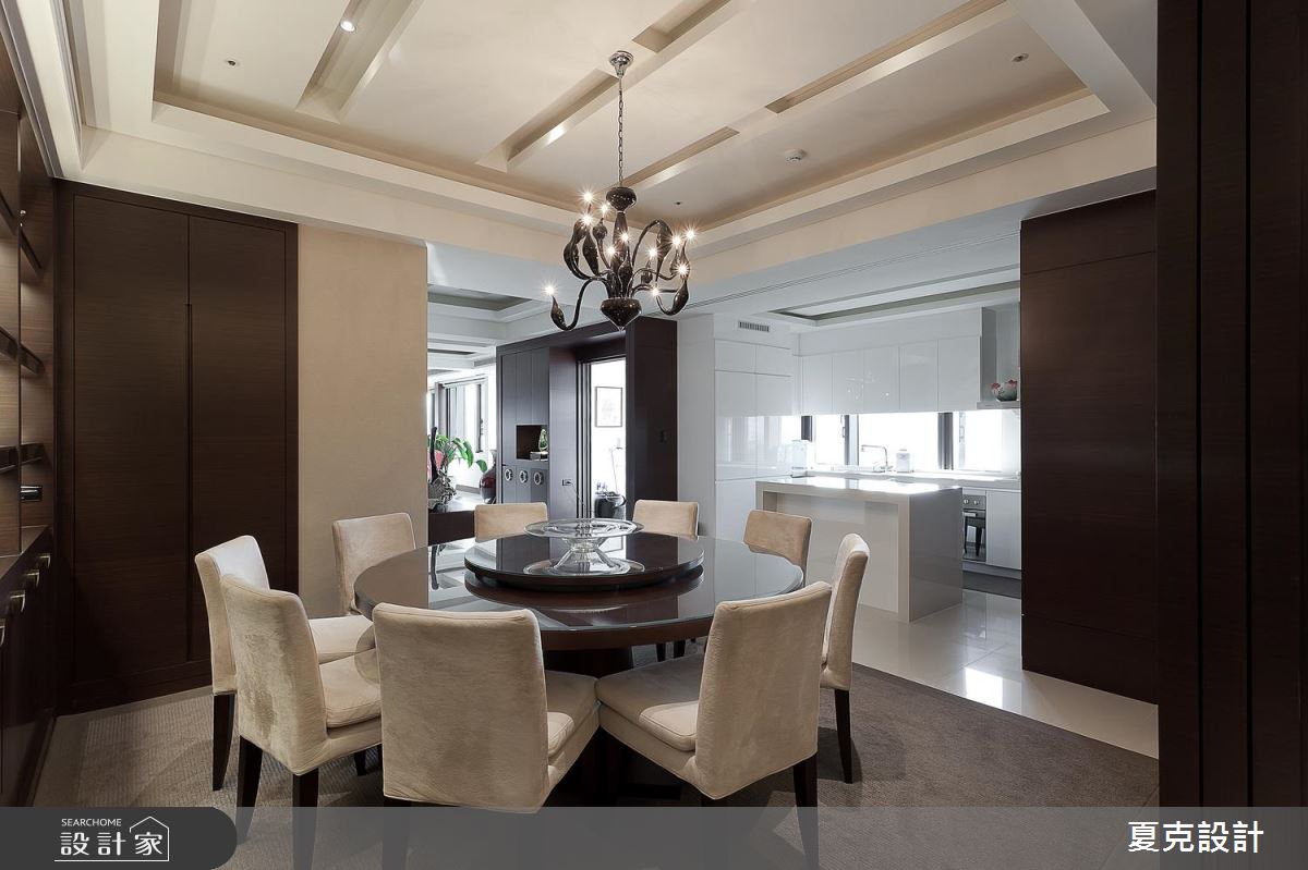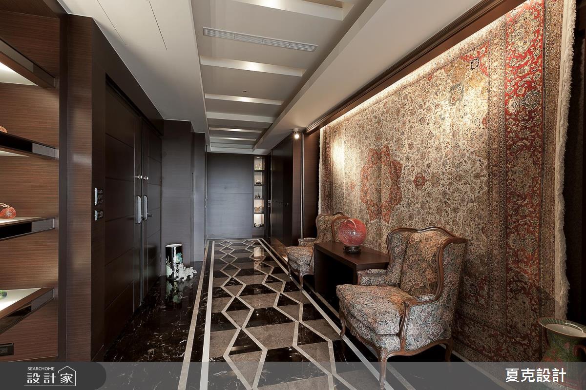 走進空間,擷取充滿幾何趣味的大理石鋪陳地坪,並於壁面貼飾花卉壁紙,巧妙讓兩張古典單椅與背景相呼應,表現不張揚的低調奢華,構築玄關處的不凡氣宇;公領域內,呈現方正大器的視野,擘劃貫連成氣的流暢動線,使每個角落皆可共沐於敞朗日光中,並採以木皮、石材增添質感,在採光映照下烘托恢弘氣韻;來到餐廳區,則透過清玻拉門的配置,讓餐廚相互串聯,達到放大空間感作用,搭配整道牆櫃所展示的剔透家飾,瞬間點亮視覺,活躍整體空間的表情,而天花所懸吊的質感吊燈,則釋放晶燦光暈,凝聚優雅的用餐氛圍;起居客廳則有如縮小版的公區客廳,展現溫婉舒適的氣息,延伸進入寢臥,可見到大面窗所導入的明亮視野,並以皮革包覆床頭,揮灑現時尚高雅的品味!