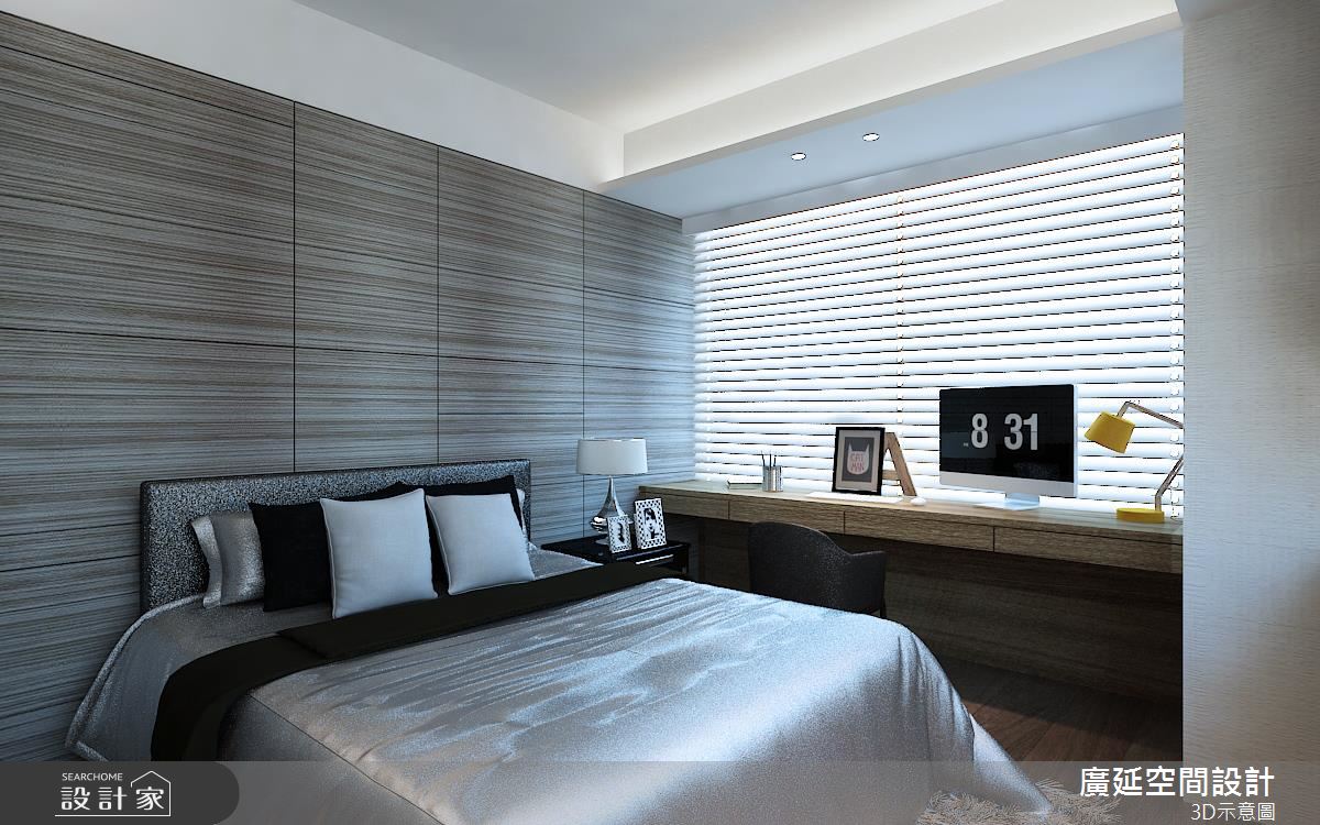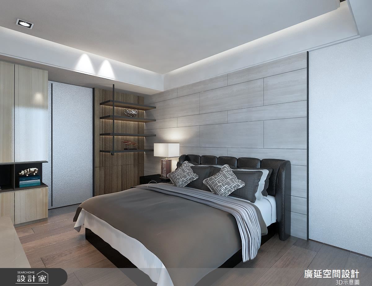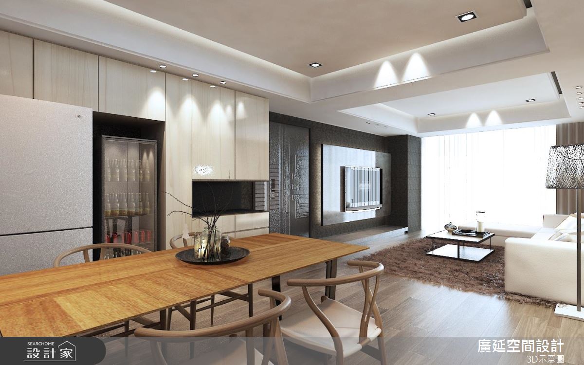 客廳區,以木地板、窗外日光引導無限暖意,並以一整面鮮明木紋沙發牆聚焦視覺,呼應北歐的自然氣息,搭配柔軟的白色 L 型沙發,鋪設可隨時坐臥的毛毯,讓客廳兼具多人聚會的功能,創造互動十足的生活情景,並保留天花板高度,簡化燈光的造型呈現,在俐落的架構中塑造敞朗視野;餐廳、廚房之間採用玻璃作隔間,即便拉上門,也能讓廚房與餐廳共享光線,且善用餐廳周邊的立面,整合電器收納機能,成功延伸廚房機能,增加實用而充裕的儲物量;臥房中,則運用櫃體鋪排,形成流暢的廊道動線,並保留櫃體局部透空,加以黑鐵做造型勾勒,替轉折處增添展示風情!