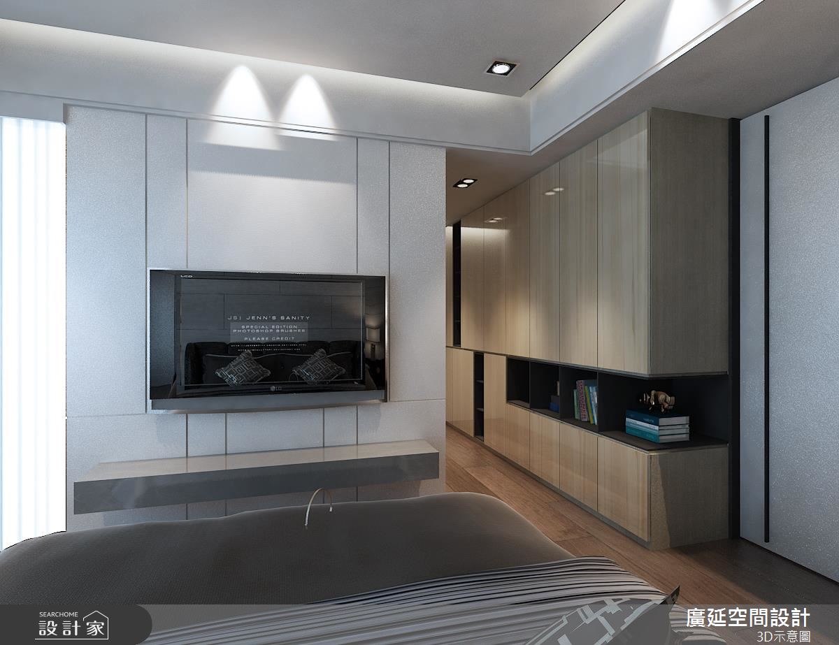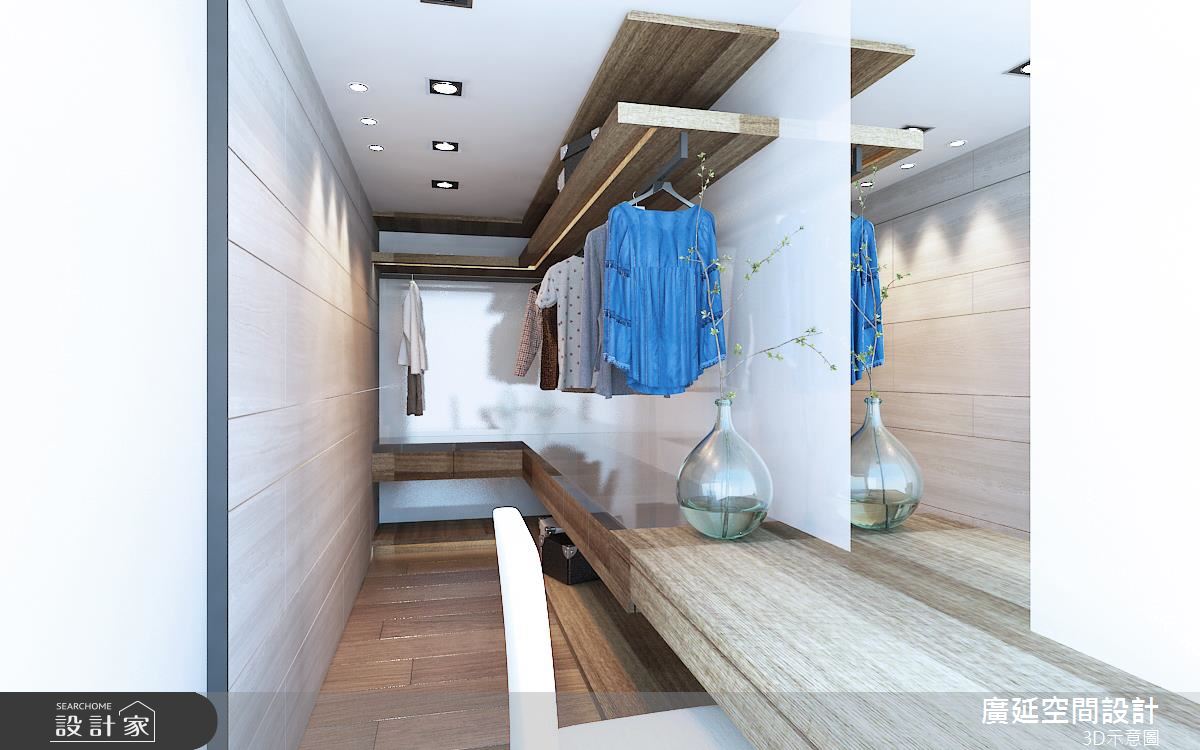 長型更衣室內,規劃 L 型檯面串聯更寬闊的使用平檯,同時利用多達四層的設計強化收納量,讓精品、衣物、鞋、包都能妥善分類,呈現齊整有序的美感!