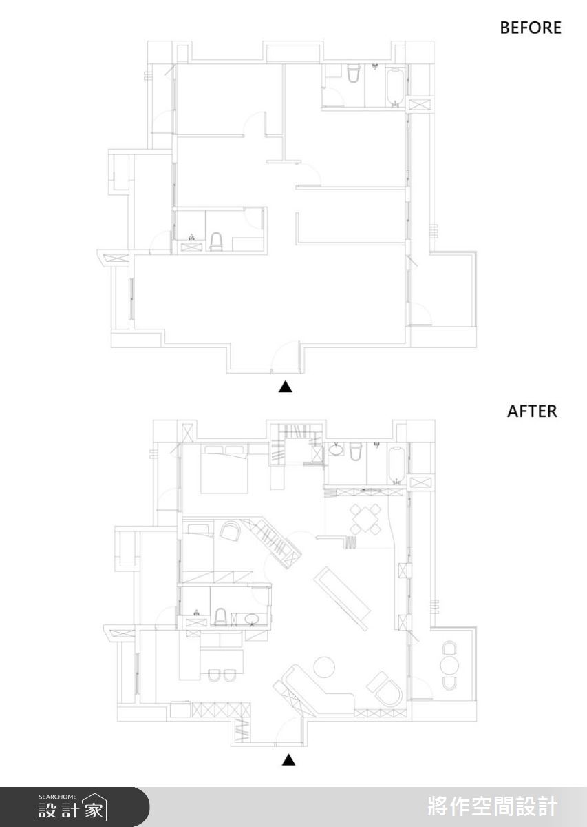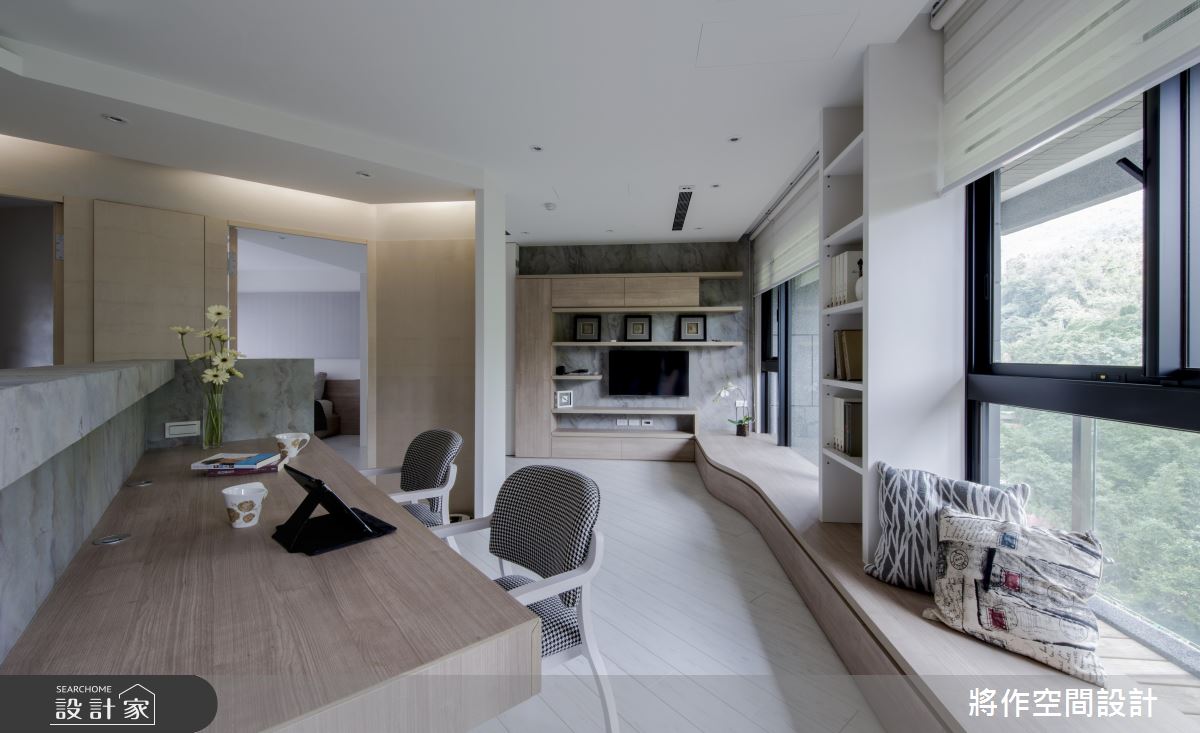 為了與戶外的山林綠意相呼應,室內多使用天然質樸的建材,搭佐大地色系的揮灑,締造裡外合一的自然氛圍,並突破格局框架,讓電視牆以獨特角度坐立於客廳中央,劃出流暢的動線脈絡,透過格局的開放串聯,讓使用者無論置身於何處,都能觀覽到優美的山林景色;電視牆斜後側,則是多功能的臥榻區兼書房,可作為屋主禪修打坐的地方,在機能櫃體及舒適臥榻的分布下,開啟無限悠閒的靜謐感受;廚房則維持在原始位置,讓餐廳以開放型式存在,營造充滿互動感的使用情境,串起感情上的聯繫;主臥則巧妙往後推移,經由此重劃後,讓臥室內也可接收到書房的綠意視角,促成更開闊的空間感,並保有場域留白,將衣物集中於收納更衣室內,睡眠區則回歸簡樸,落實純粹的生活質地!
