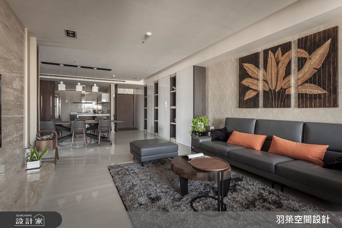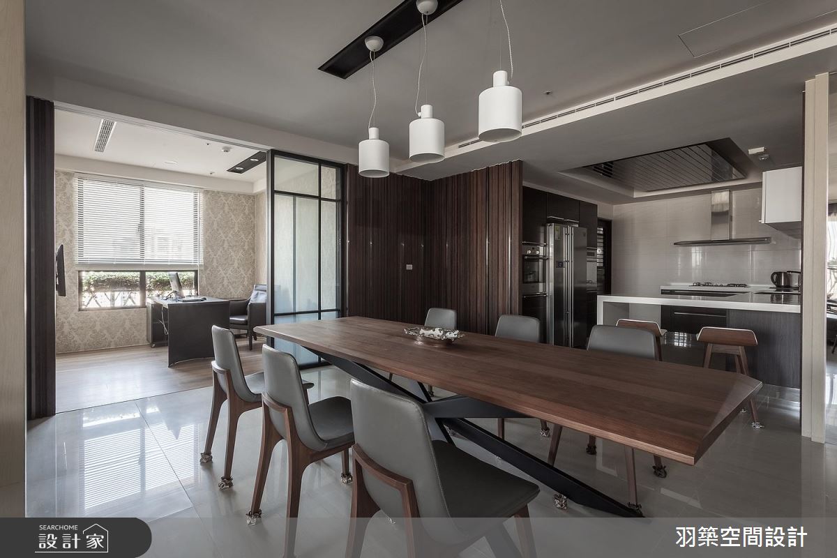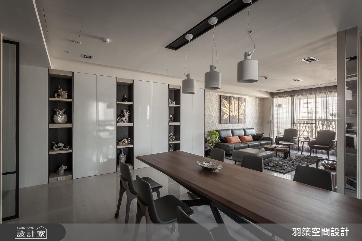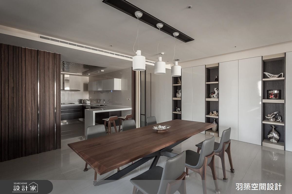 入口處,配置延伸加長的玄關櫃,讓收納量更為充足,並加入局部展示功能,可用以穿插屋主珍藏藝品,打造優美兼實用的陳列空間,不只開啟具品味的入口氣氛,也塑造餐廳區的一面美麗立面;全室色彩則給予淡雅基底,少了絢麗色調干擾,回歸樸實的生活底蘊,電視主牆採用淺色大理石砌造,呼應著沙發背牆的細緻壁紙背景,以及精美的掛畫聚焦,展現整體架構的深刻層次;加長型的餐桌則符合迎賓團聚需求,透過沉穩的木質基底,與壁材產生和諧呼應,且透過與餐廳、廚房之間的開放串聯,以及書房門片的通透設計,讓空間感更為放大,採光也因此獲得流通,促成敞亮的餐區景致!