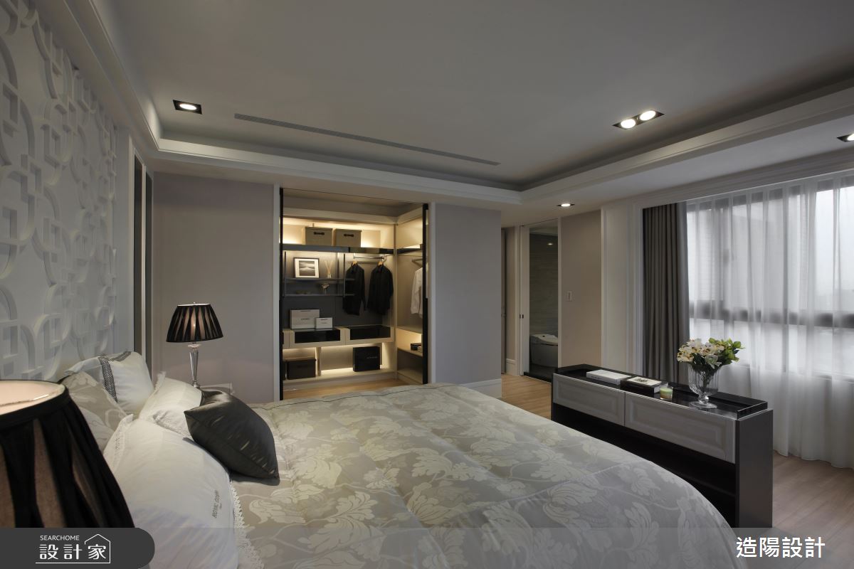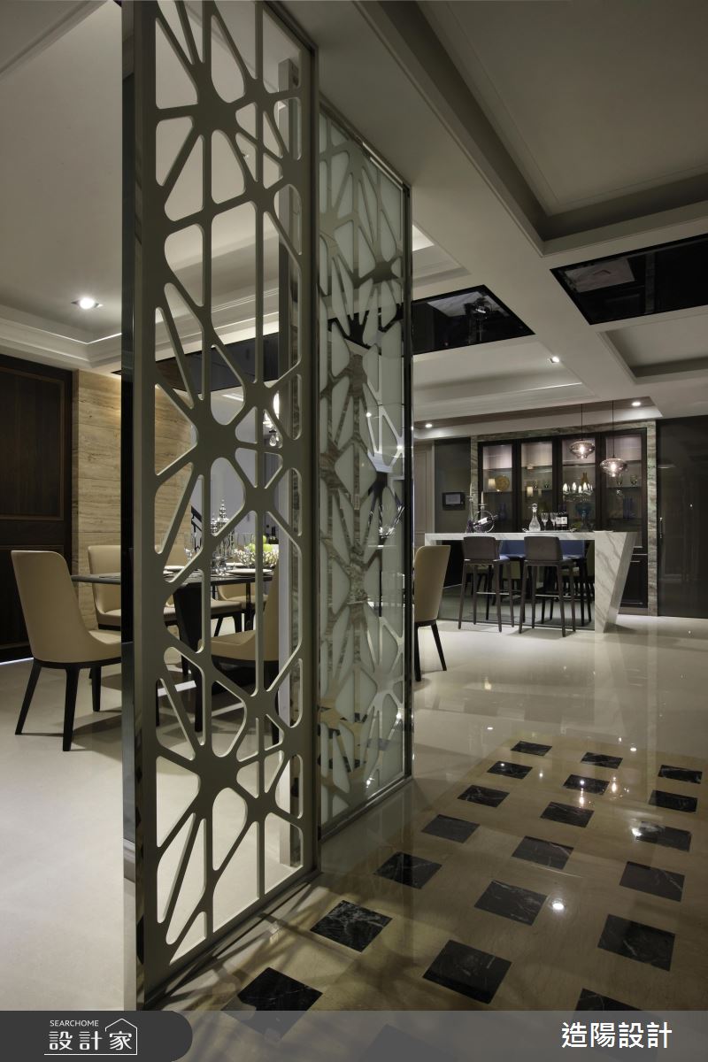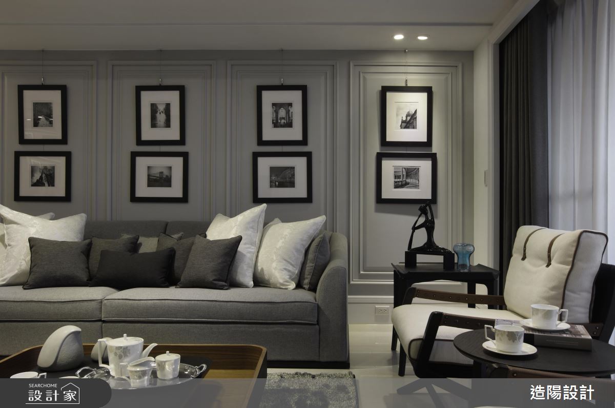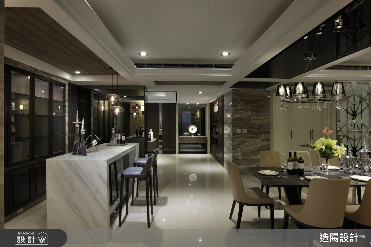 公領域內,將客廳、餐廳與吧檯開放串聯,並引用大理石作為壁材,於天花、壁櫃等處妝點細緻線板,搭配低調吊燈、現代感家具等,打造絕佳的混搭風貌;客廳沙發背牆則採以灰色為背景,給予線板分割,並掛上簡約的黑白攝影作品,與其相對的電視牆,選用米黃色系大理石為底,配上一幅大型抽象畫作,讓客廳呈現細膩人文的藝術表情;沿著樓梯而上,可來到起居場域,此區延續公共區域現代、古典的混搭風格,鋪陳木質地板型塑溫煦暖度,創造屬於家人之間的絕佳互動場所;主臥,運用幾何雕花裝飾立體床頭,兩側陳列古典造型床頭燈,彰顯獨有的簡約氣質,次臥房內,則給予大面積的木材鋪敘,輔以鐵件與皮質座椅,建構出質樸而自在的生活感!