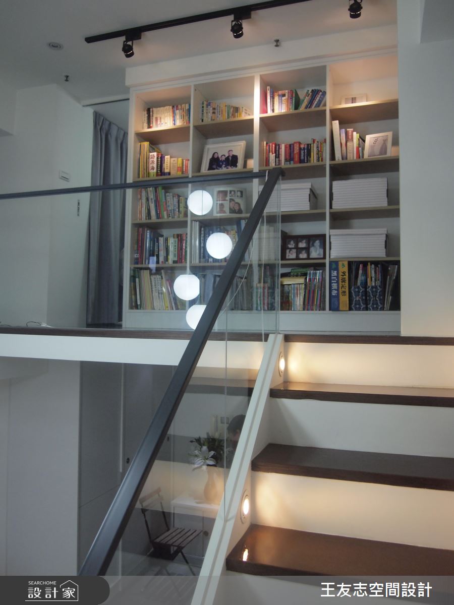 玄關處以白、淺紫色調作為風格開場,感受靜謐、優雅的空間氣息。挑高的客廳空間裡,天花板藉由垂掛幾盞高低錯落的圓形燈飾,替簡約的室內增添變化;隨著戶外自然光的接引入室,伴隨玻璃質材的隔間方式,視覺展線穿透、延伸之意;善用階梯側面,轉化為電視牆之用,斜切立面的安排,更流暢導引空間動線,加上階梯面搭佐嵌燈照明,當夜晚熄燈後,成為明亮的空間指引,也讓晚歸的家人更安心;藉由一、二樓將公私領域完美分開,二樓主要規劃主臥、開放式書房的空間,一上樓梯就能看見一整面書牆,可愜意坐下來閱讀;經過隔柵造型的立面,則為主臥室,在有限的空間裡,利用通透材質的界定,讓領域機能更顯完整。