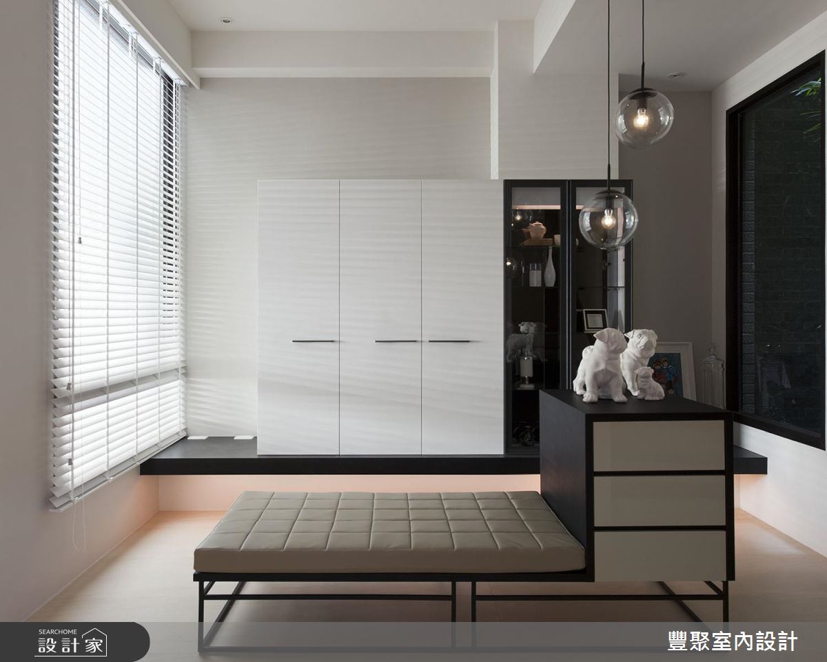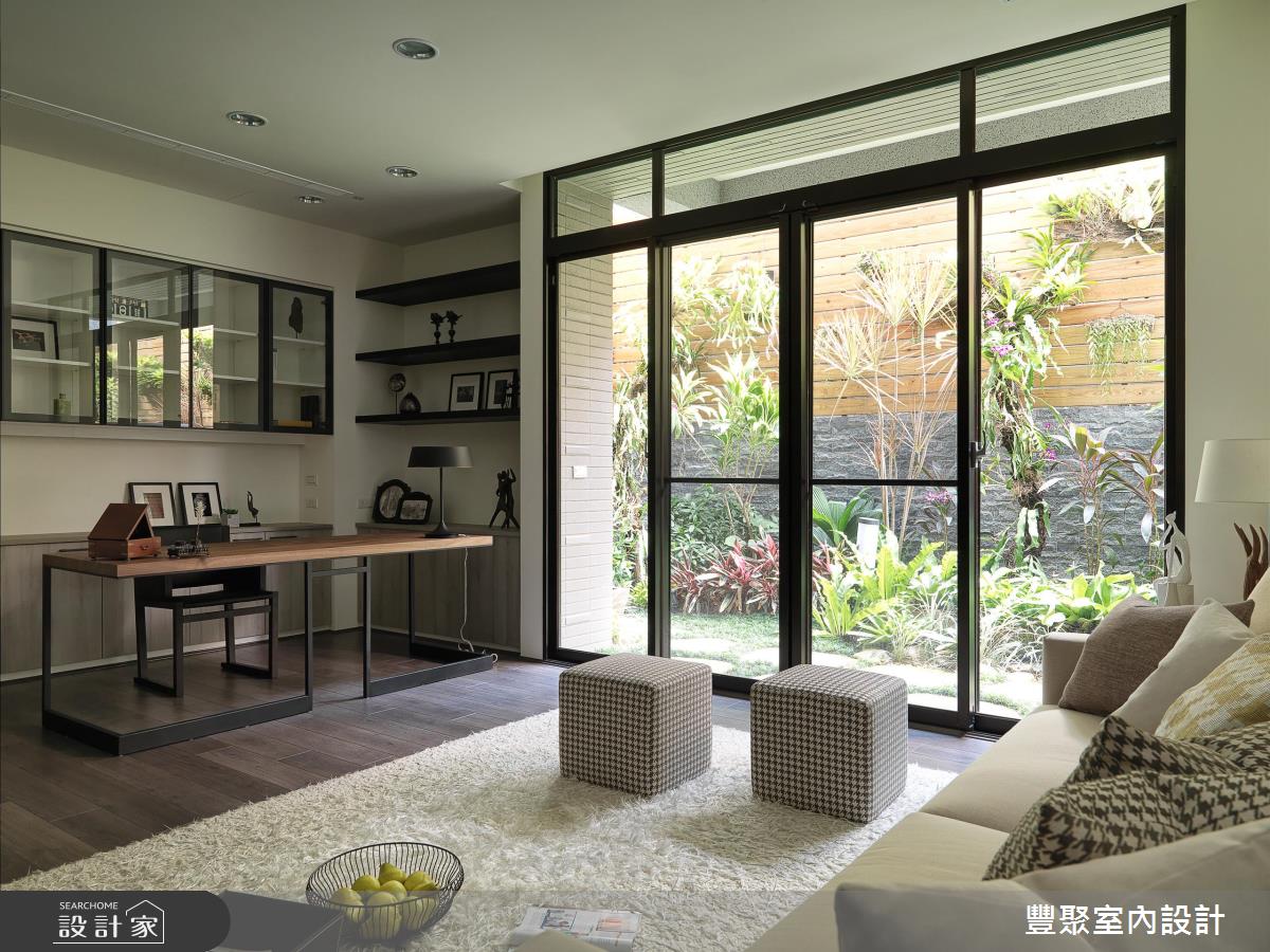 自然光隨窗引入室內,替玄關營造出明亮視感,玻璃展示櫃內擺設風格物件,挹注人文情懷,還特別特別訂製一張穿鞋椅,強化生活的實用性,而細緻的腳架線條搭配格紋的皮革坐墊,更添優雅迷人。整體空間裡,天花板與壁面皆以白色鋪陳,營造出畫布般的留白方式,挑選鐵件、木紋等冷暖相兼的材質運用,替居家氛圍增加溫暖氣息,而深色的線條遊走於室內,更描繪出明快的視覺層次;淺色大理石成為電視牆造型,刻意將尺寸內縮以爭取更多空間給公領域,藉此烘托戶外造景的自然生氣;將電視平台與家具刻意降低高度,讓客廳更顯寬敞開闊;沙發後方為大面窗景,利用玻璃質材的隔間手法,襯托出樹枝姿態的戶外風光,成為空間裡一幅巨形的藝術畫作,讓景融於室內,化為情境,同時也是室內空間的一部分,內外皆景。