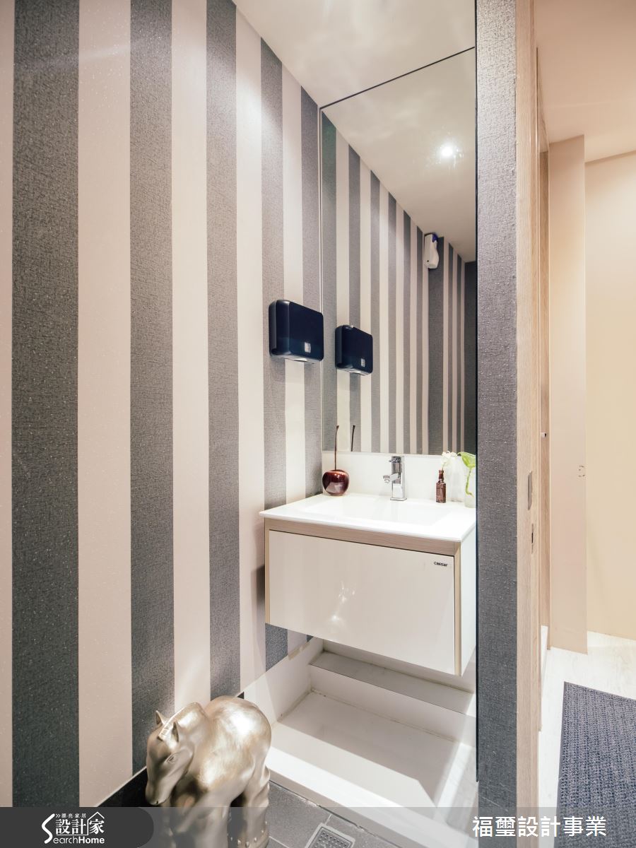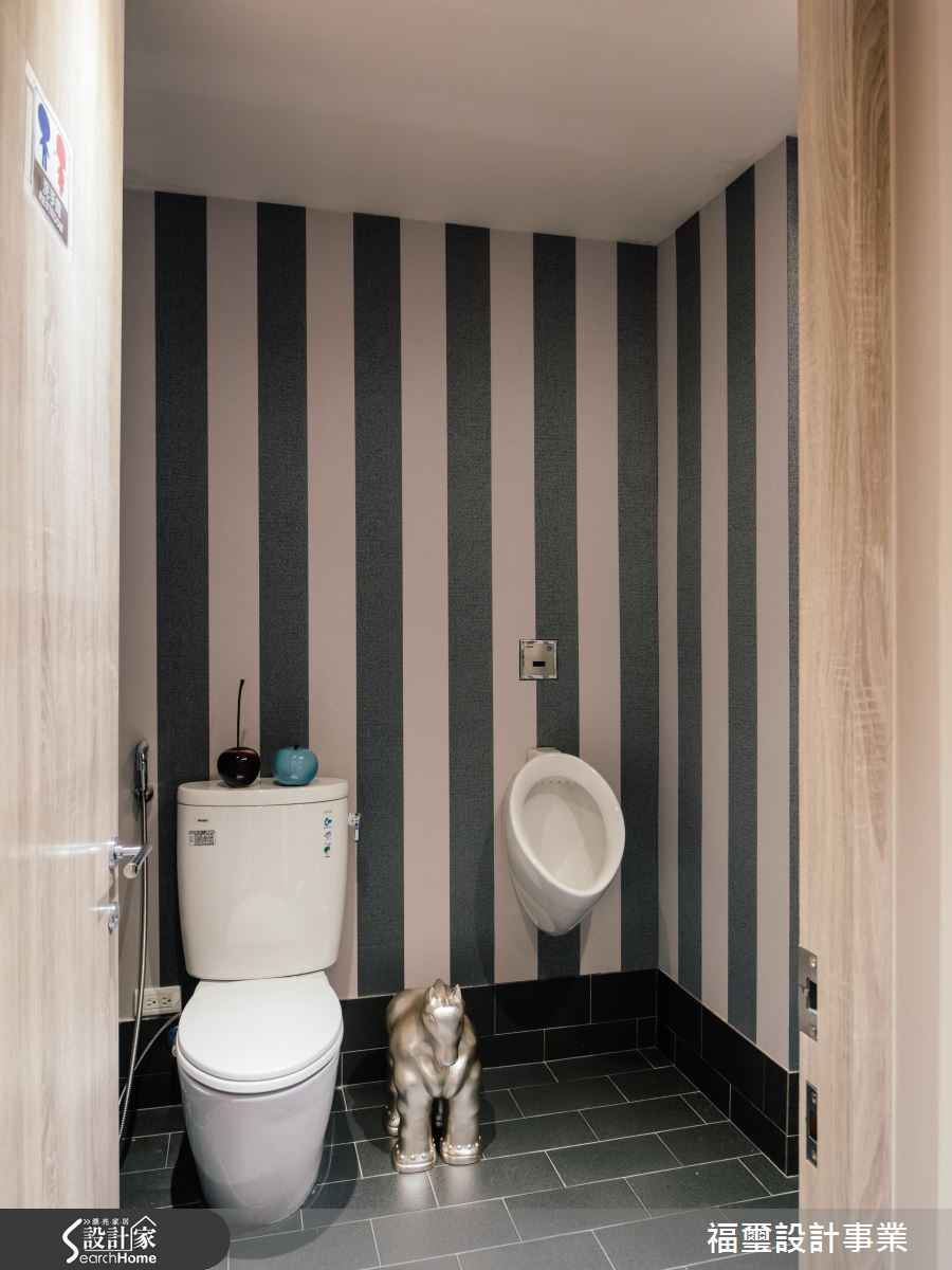 洗手間有別於廳區的木紋肌理,改以線條、磚材鋪述年輕氛圍,搭配金屬飾品的妝點,使空間顯得活潑生動,充滿旅店般的異國風情!