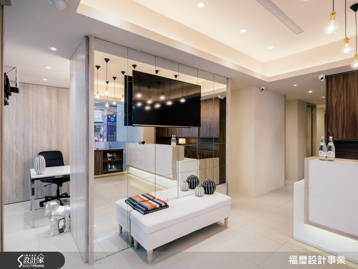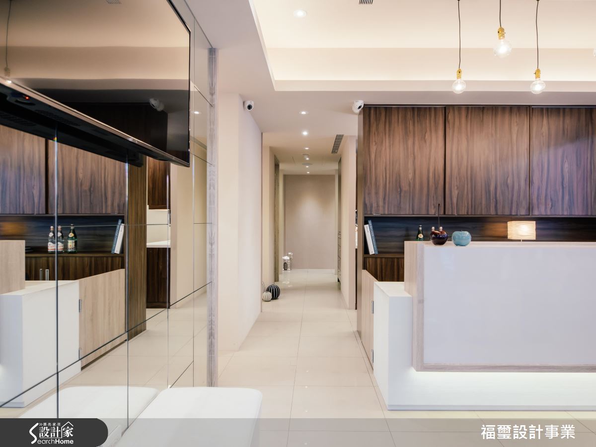 門面外,可見霧面與清玻璃的拼接規劃,在材質變化中兼具透光及隱私效果,且讓人可由外往內隱約望見內部裝潢,未入診所即可感受到診所的清新活力;室內,則給予簡約優雅的配置,於入口大廳天花懸吊多盞造型吊燈,打造視覺亮點,運用光暈渲染環境,讓空間盈滿溫和與平靜,同時融入天然木皮,採以深淺木色鋪述全室,帶出平衡的色彩層次,且合宜分佈櫃體、量體等,擘劃優雅俐落的線條,導引流暢的動線表情,烘托完整而不單調的豐富情境,接待大廳的電視牆則選用鏡面元素妝點,不僅挹注時尚氣質,更達到視覺擴展的延伸作用,搭配著質感座椅陳列,形成自成一格的等候專區,讓人倍感放鬆!