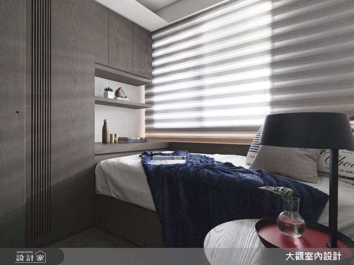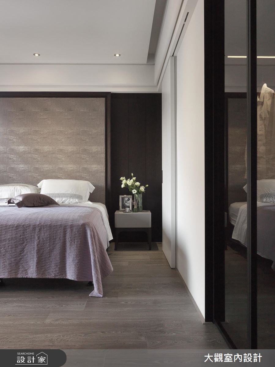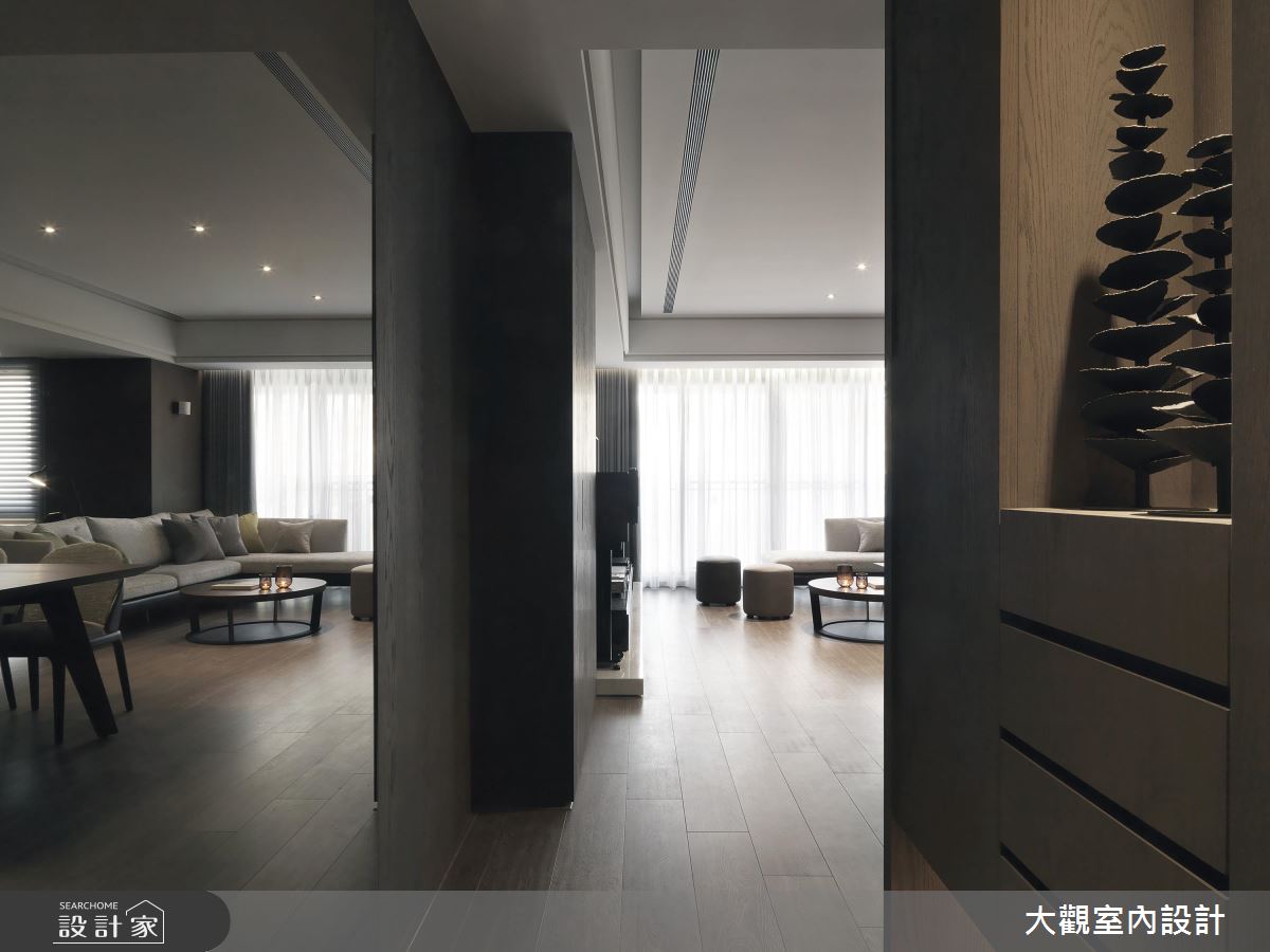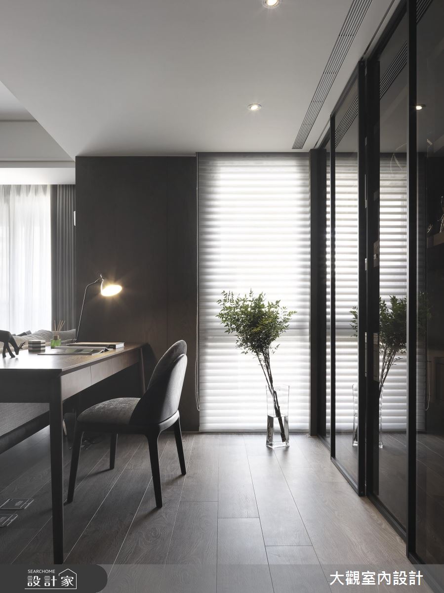 走進室內,大量的深色木質延伸至牆面、地坪的使用,營造出沉靜、溫潤的居家氛圍,設計師透過開放式設計,讓比例原本不大的公共空間,可以一次滿足客廳、餐廳、書房和吧檯功能的願望。書房後方的展示收納櫃結合玻璃門片,既可達到收藏品、書籍的展示功能,也能具有防止塵埃沾染的效果,平時清潔上更加方便。主臥室富有獨立盥洗空間及更衣空間,並運用通透的玻璃隔間、門片,延伸空間穿透感,使私領域機能更加完整而豐富。