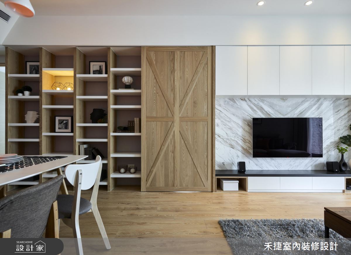 本案必須解決的問題有二,一是噪音問題、二是畸零空間。設計師首先將鄰近快速道路的牆面採用木絲水泥板等吸音材質加厚,並增設氣密窗;接著在客廳設計大面積櫃體拉齊電視牆,成功矯正屋案兩側不方正的缺點。設計師依據屋主的喜好與需求,利用開放設計串連客、餐廳空間,並大量運用木質元素,創造溫潤、明亮的公領域感受。超耐磨木地板沿長邊鋪設,並巧妙將大理石與文化石分別設定為電視牆以及沙發背牆建材,成功延伸視覺尺度、放大空間感受。設計師另外打造一多功能書房,除了未來可作為次臥、客房、閱讀機能皆合宜,玻璃隔間更能導引光線。