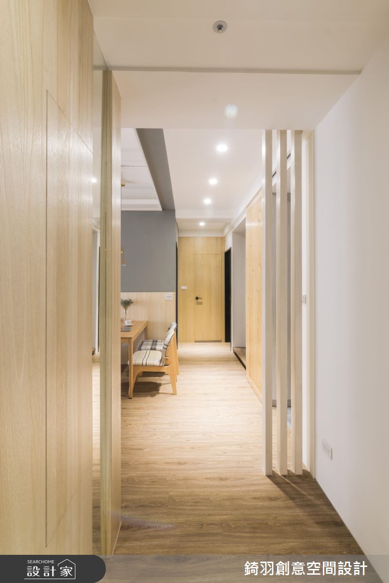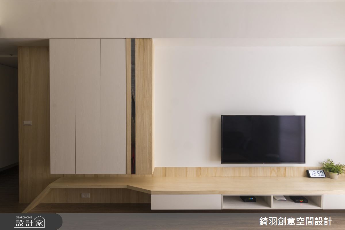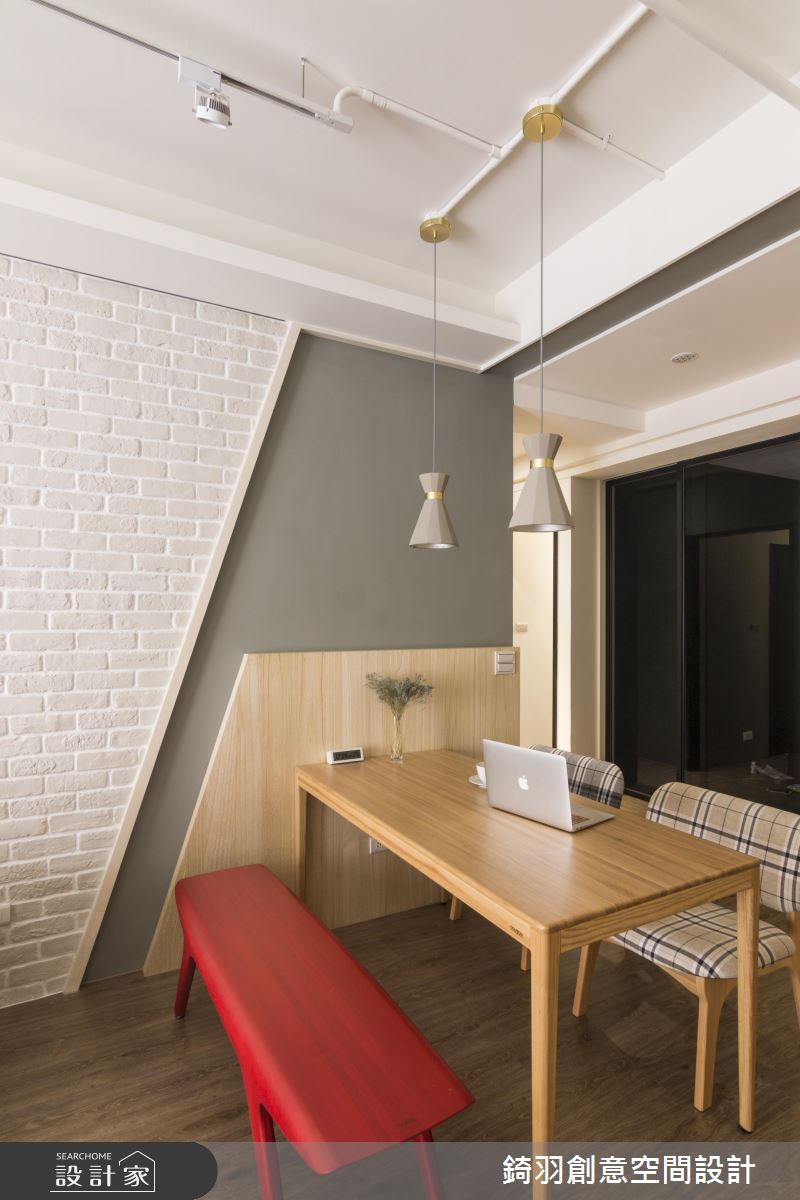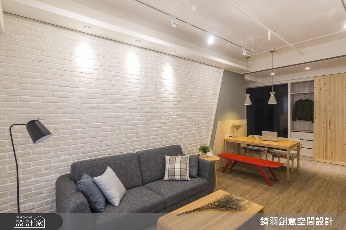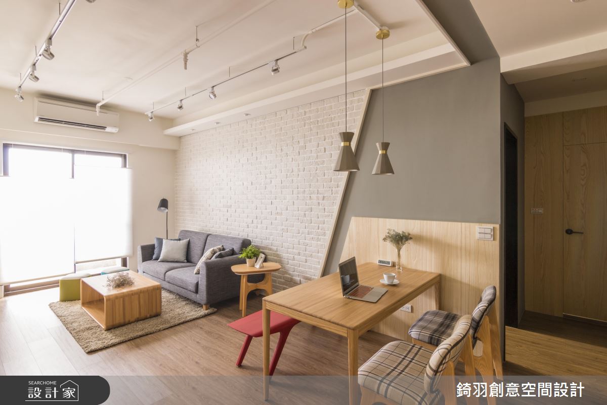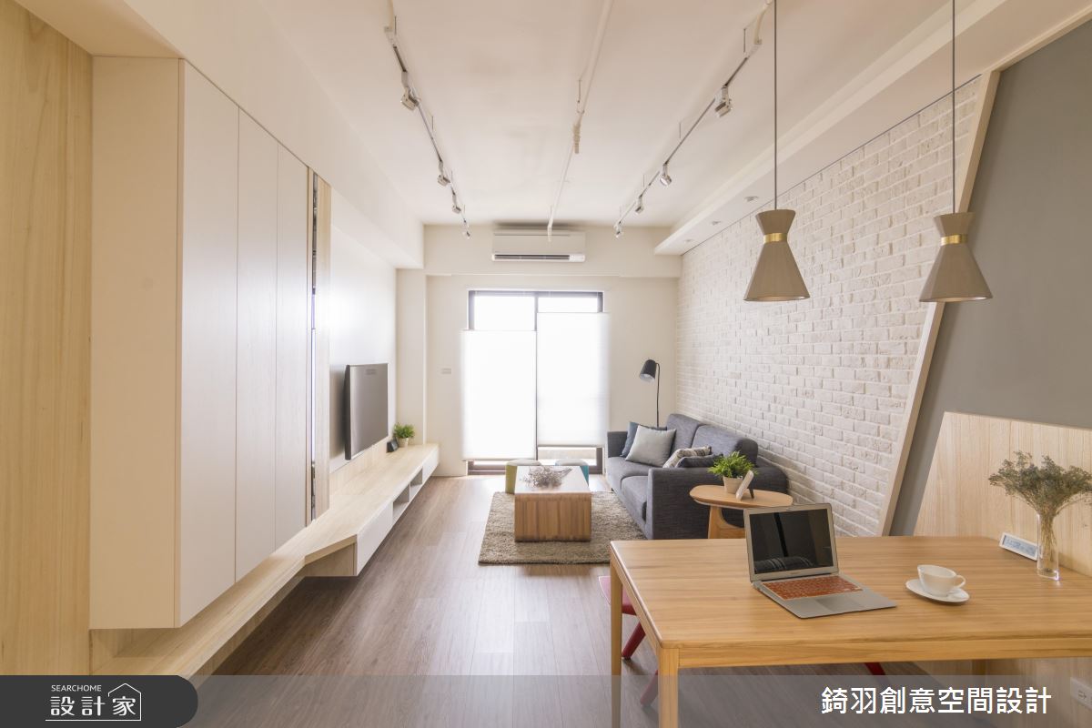 旋開大門走進室內,充滿原木質感與潔白視線交織出清新無印風的氣息,沉澱紛擾的外在世界,身心全面療癒。軌道燈遊走在天花板,體現最自然的生活態度,大樑結構下方整併電視牆與收納機能,白色的壁面銜接讓電視牆有放大之效,展現舒心寬敞的遼闊感受;文化石鋪陳沙發背牆,隨著嵌燈照明的開啟,增添明亮度且醞釀動人的生活氛圍;藉由斜切線條劃分出壁面色彩與質材的變化,將客廳與餐桌領域巧妙界定出來,餐廳牆面延伸至天花板造型,烘托出領域定位,而餐桌上方飾以兩盞水泥質感的灰色吊燈,活潑的設計呈現妝點出迷人且玩味生活;餐廳後方藉由實木拉門的彈性運用,左側為衣櫃收納區,右側是廚房領域,若想烹調時,可觀上拉門杜絕油煙蔓延至公領域,真得是兼具實用與美觀的優質設計!