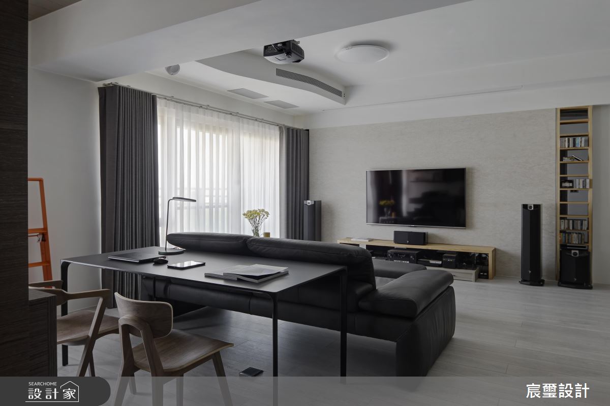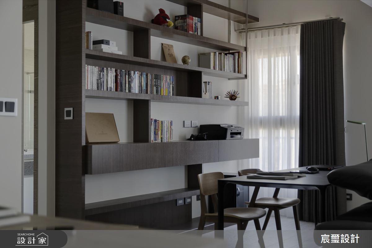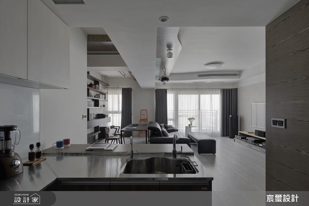 公領域給予開放式格局,在留白視野、明媚日光的營佈之下,沐浴一室敞亮,並以淺色石材鋪陳電視牆,形成與木紋和諧層次,敘寫細緻的建材肌理,天花板亦可見律動的流線修飾,化解冷氣出風口的突兀存在,並增添格局線條的變化趣味;書房則納入客廳一部分,透過開放設定型塑生活中的交流互動,書桌後方的展示收納牆,則打造出一道簡約端景,帶出安定沉穩的畫面;同時安置開放廚房及輕食吧檯,讓用餐型式多了更多可能,呈現互動共享的情景;寢臥內,則選擇光感的灰色壁紙,營造出有如水泥粉光的質感印象,並悉心安排生活機能、妥善安置拉門位置,讓每一道起居機能皆充分到位!