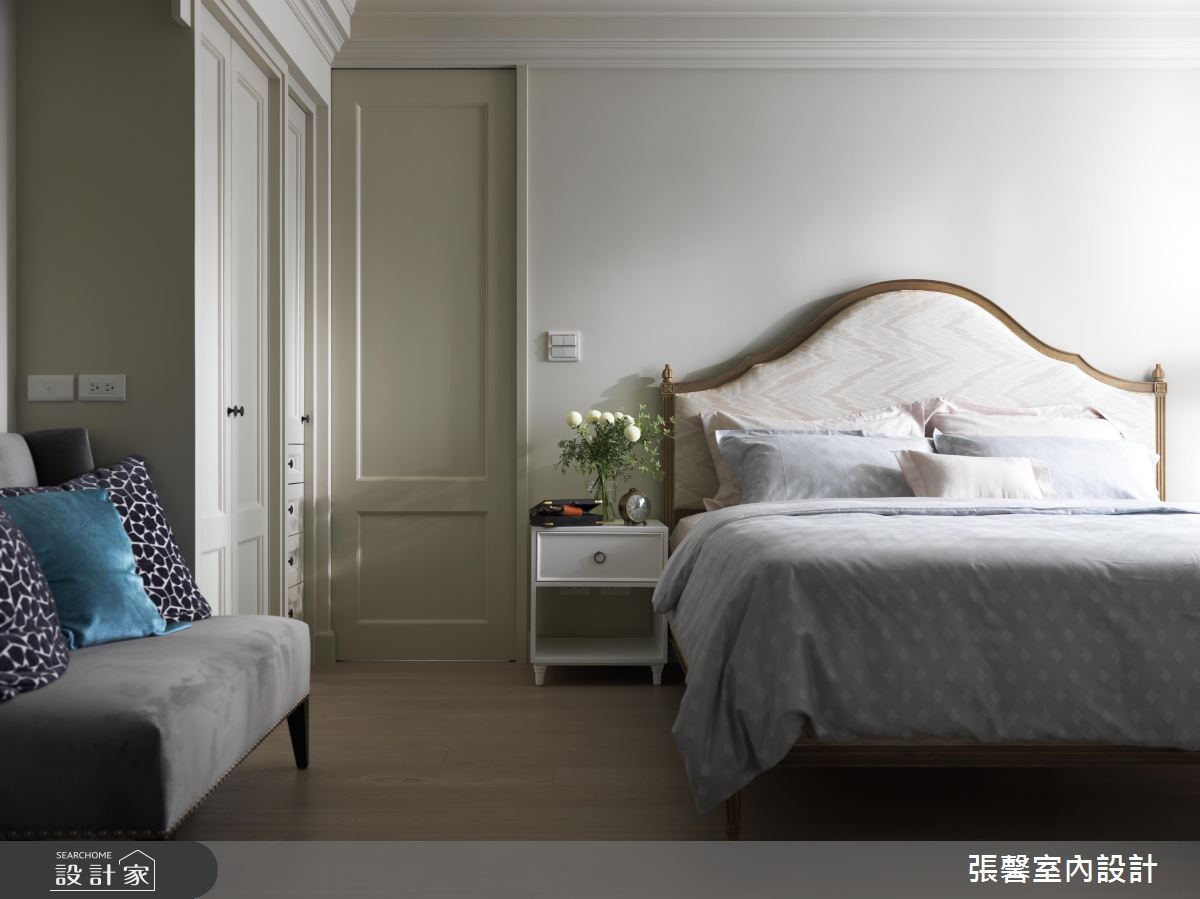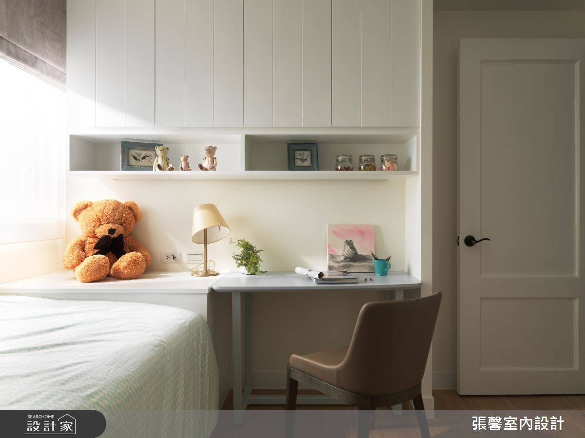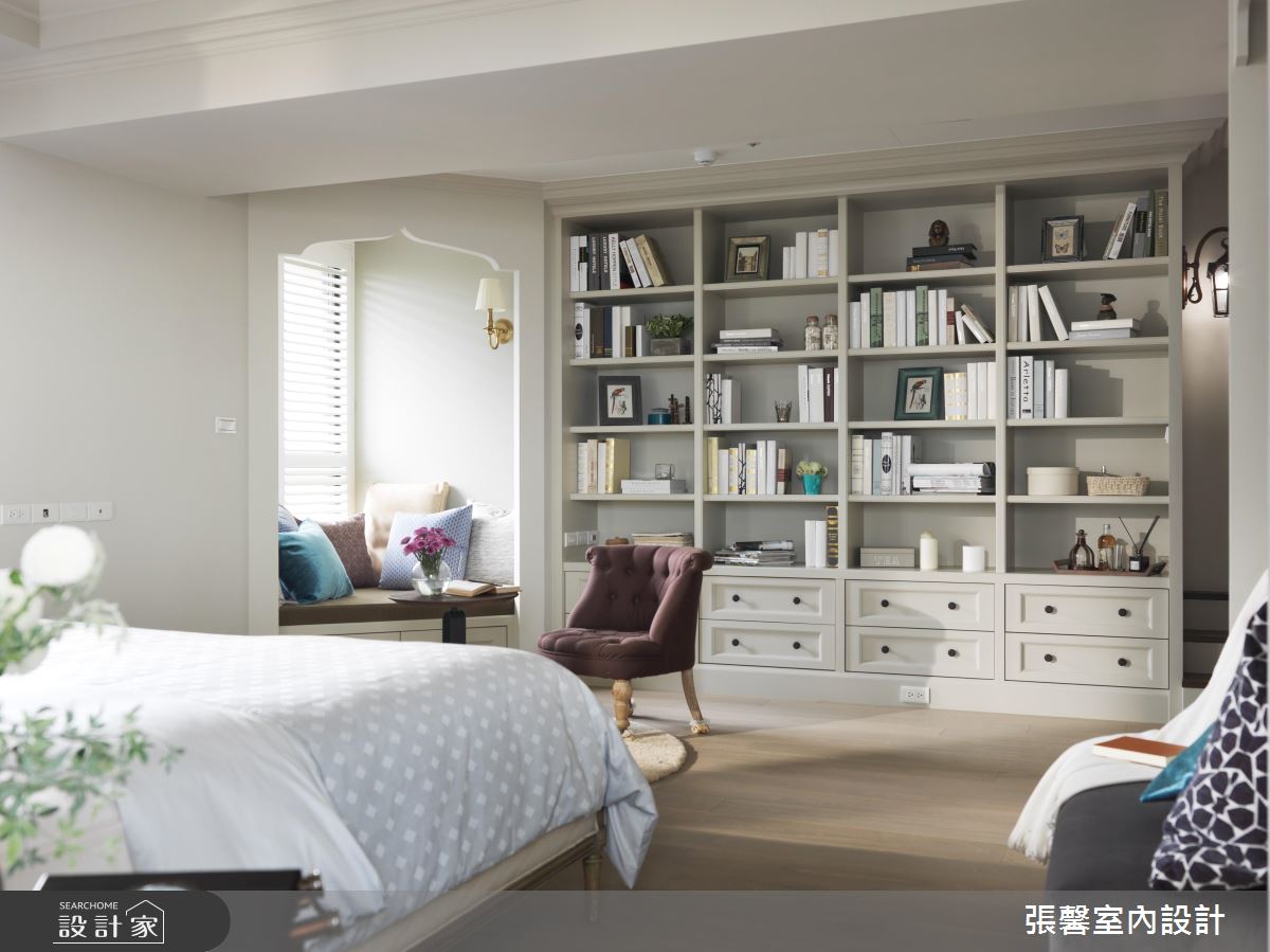 在寬敞的主臥空間裡,打造一整面開放書櫃,臨窗畸零地成為溫馨的臥榻區,是享受兩人時光的幸福角落。