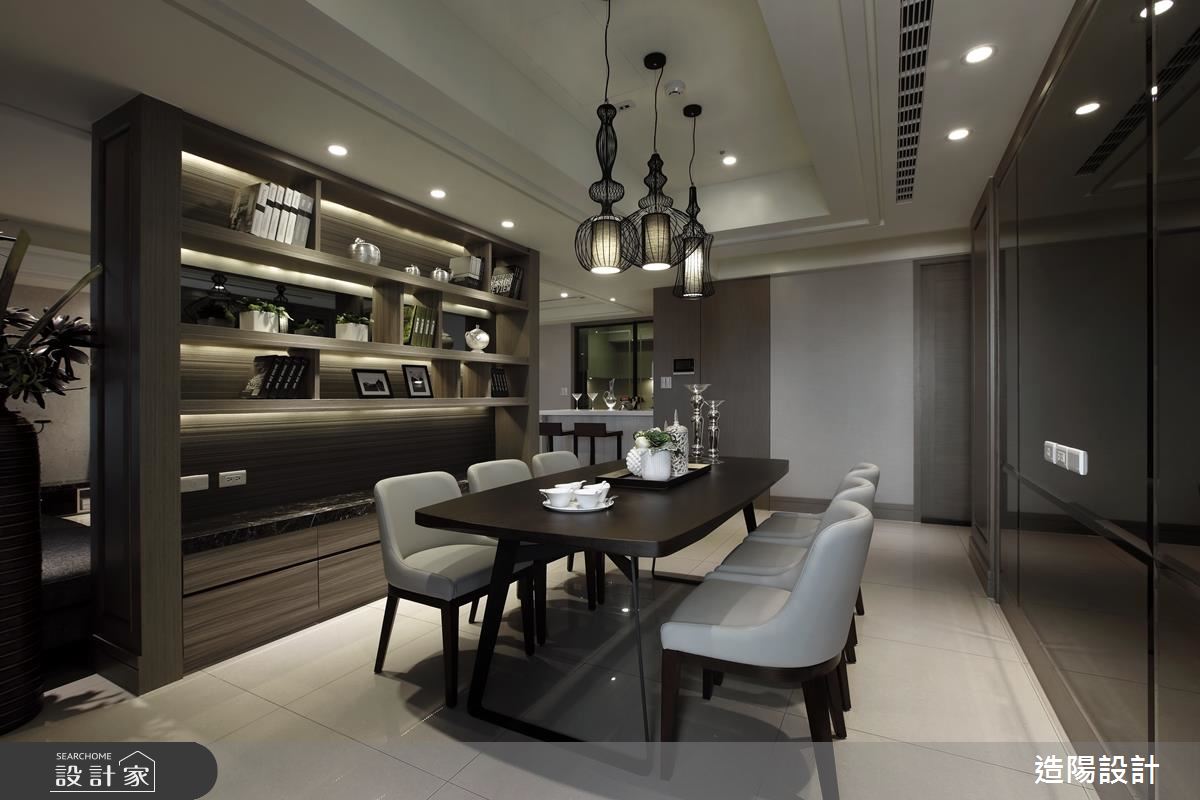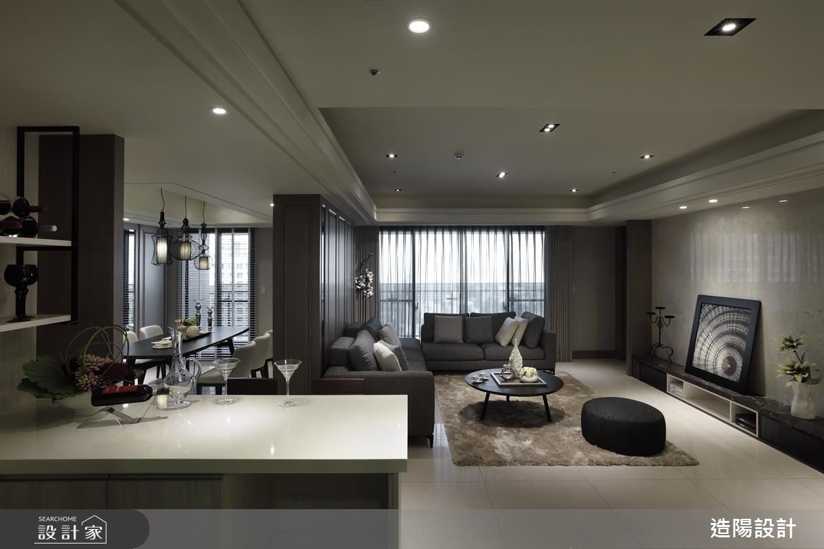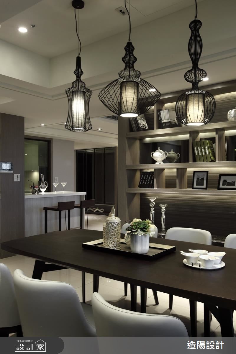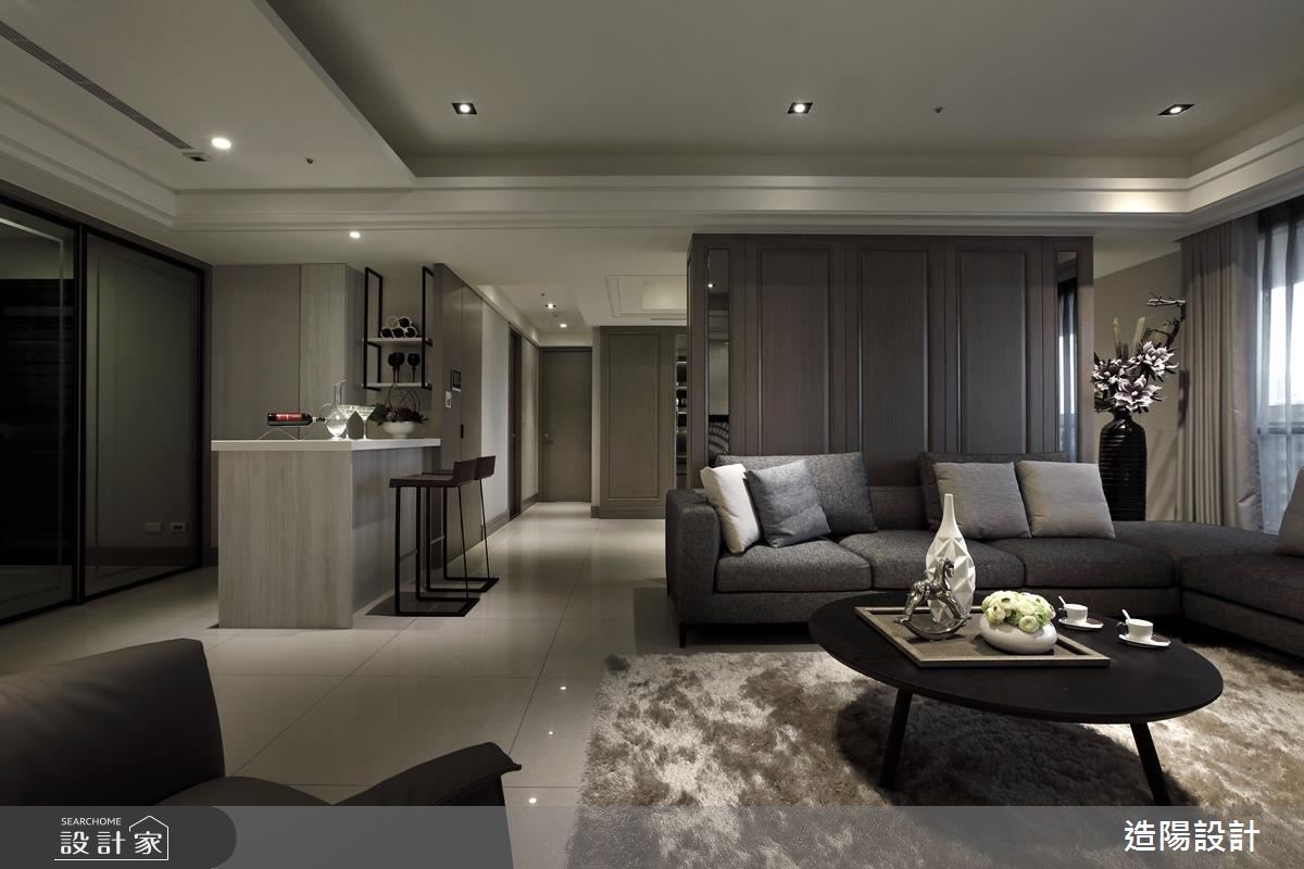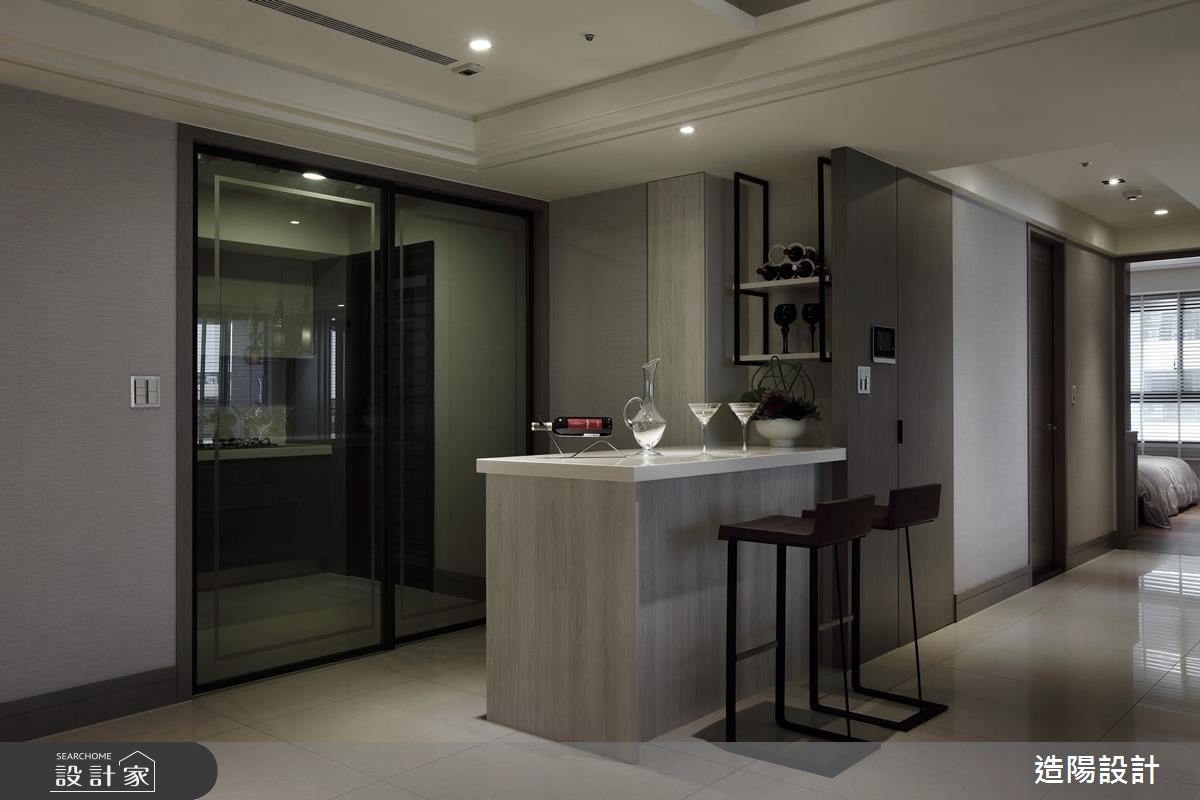 從大門步入玄關,以鏡面設計延伸場域視覺深度,並於櫃體門片妝點框型紋理,帶出面材的細緻度,客廳則以畫作聚焦視覺,並規劃開放的展示平檯,加入時尚藝品、植栽妝點,將古典元素揉合至現代底蘊之中,詮釋時尚的空間風情,沙發背牆則加入古典線板與灰鏡框設,並將此道牆設為與後方餐廳區域的界定,導引流暢的使用動線,來到餐廳,沙發背牆的後方成了展示亮點,搭襯吊燈聚焦視覺,點亮溫暖優雅的用餐氛圍,而特別設計的開放式吧檯區,更替生活添注良好的互動模式,形成一處可輕食、小酌的絕佳地帶!