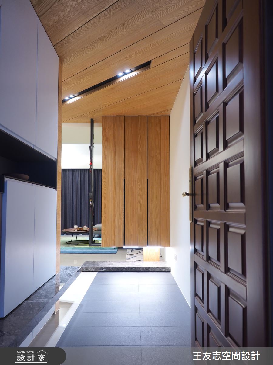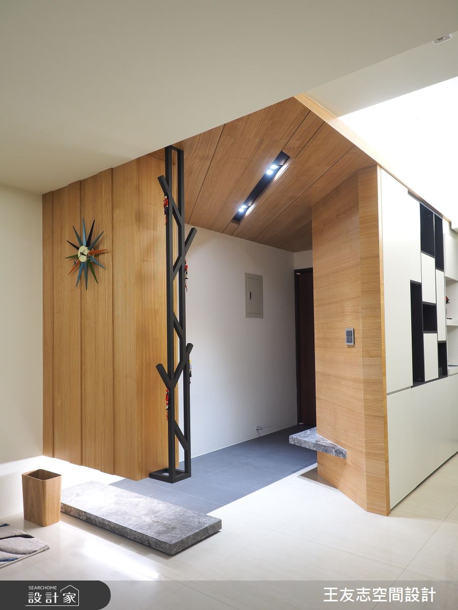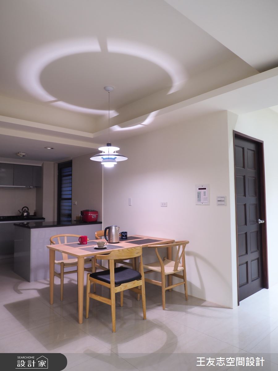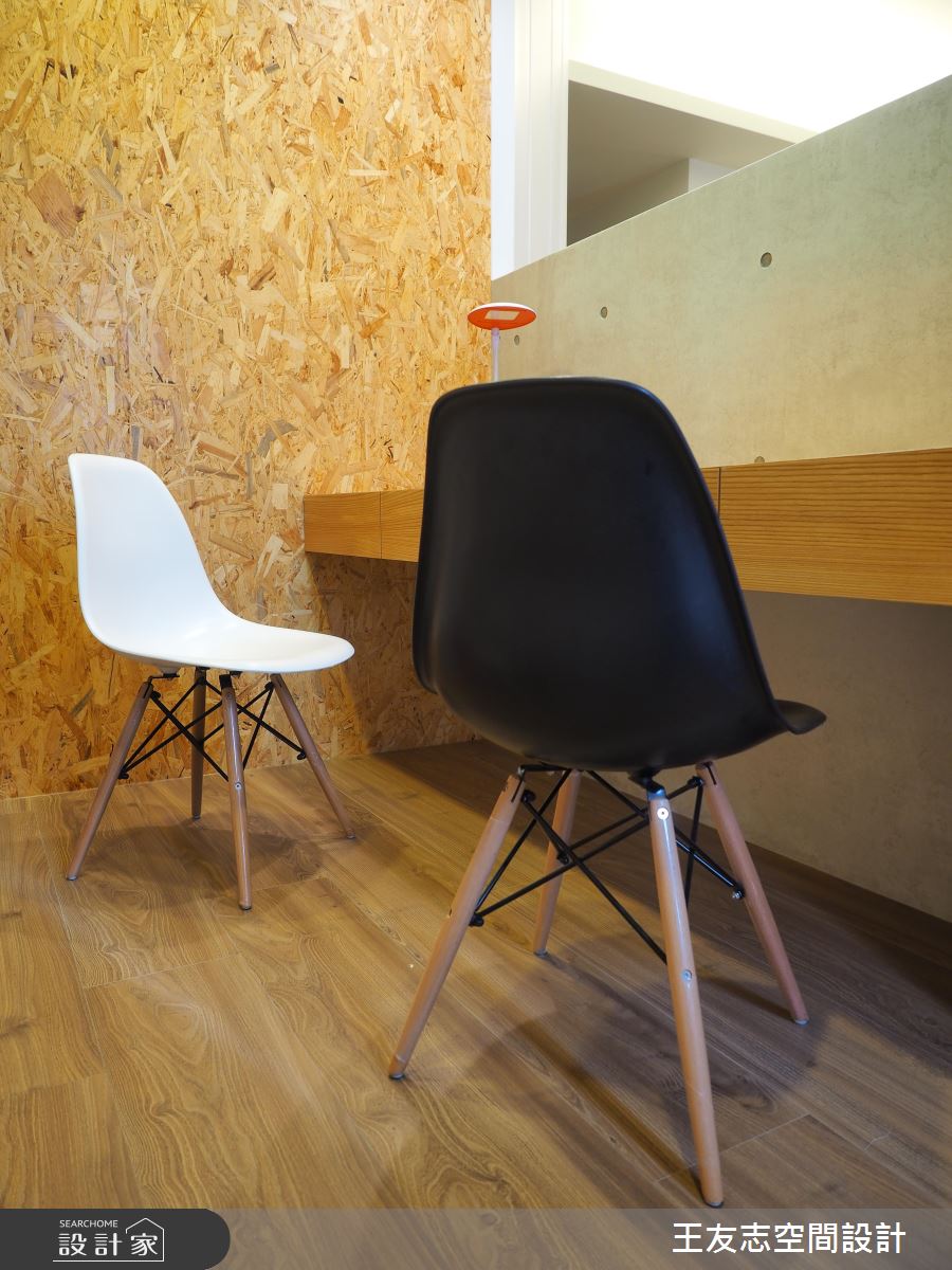 深色地坪鋪敘玄關領域,天花板以木紋肌理鋪陳,美化大樑結構可能帶來的壓迫,原木質感持續蔓延壁面與鞋櫃,櫃體以懸空的方式呈現,輕盈無壓的視覺營造,詮釋愜意、自在的居家氛圍。客廳裡藉由多色的地毯、抱枕,妝點出淡雅、繽紛的視覺變化,呼應北歐風富有兼容並蓄的文化內涵,同時凸顯個人的生活品味;電視牆以實木貼皮呈現,細膩的分割線描繪出立體視感,嵌燈照明輕灑壁面,形塑藝術般的漸層光影效果;客廳轉角的壁面特別漆上仿清水模塗料,樸實的質材肌理與觸感,替整體居家環境注入生命力;開放的室內隔局裡,餐、廚房剛好安排在空間的角落,讓公領域更顯開闊,原木餐桌椅的擺設呼應北歐生活,搭佐天花板的蝶形吊燈,展現經典的設計風範。
