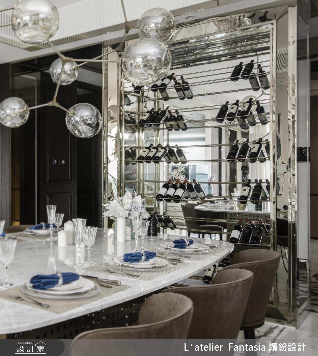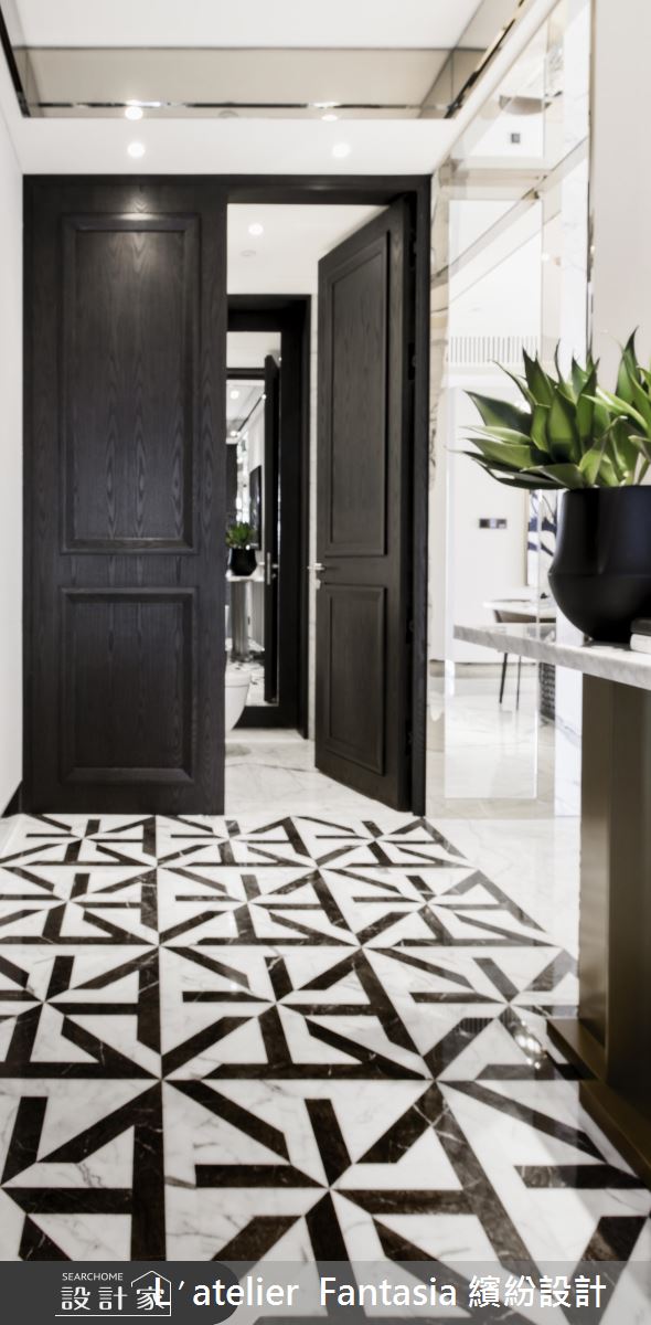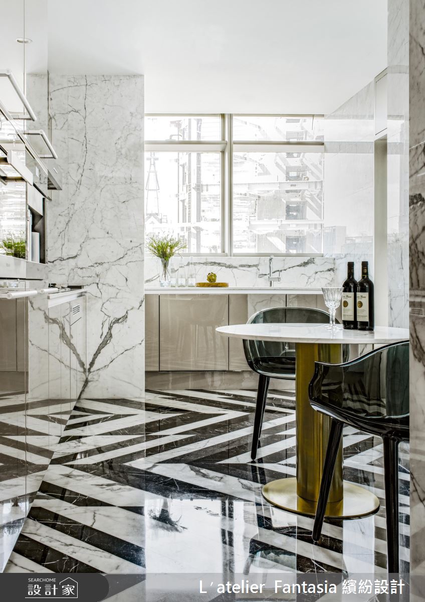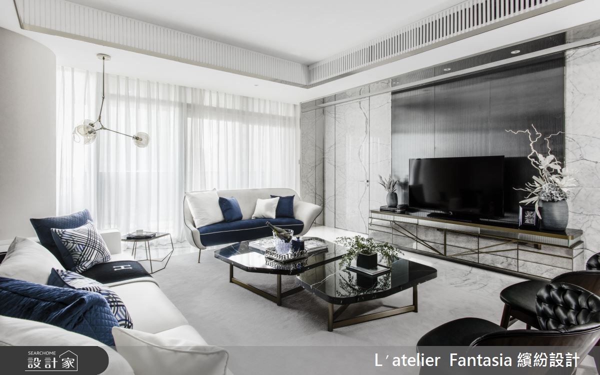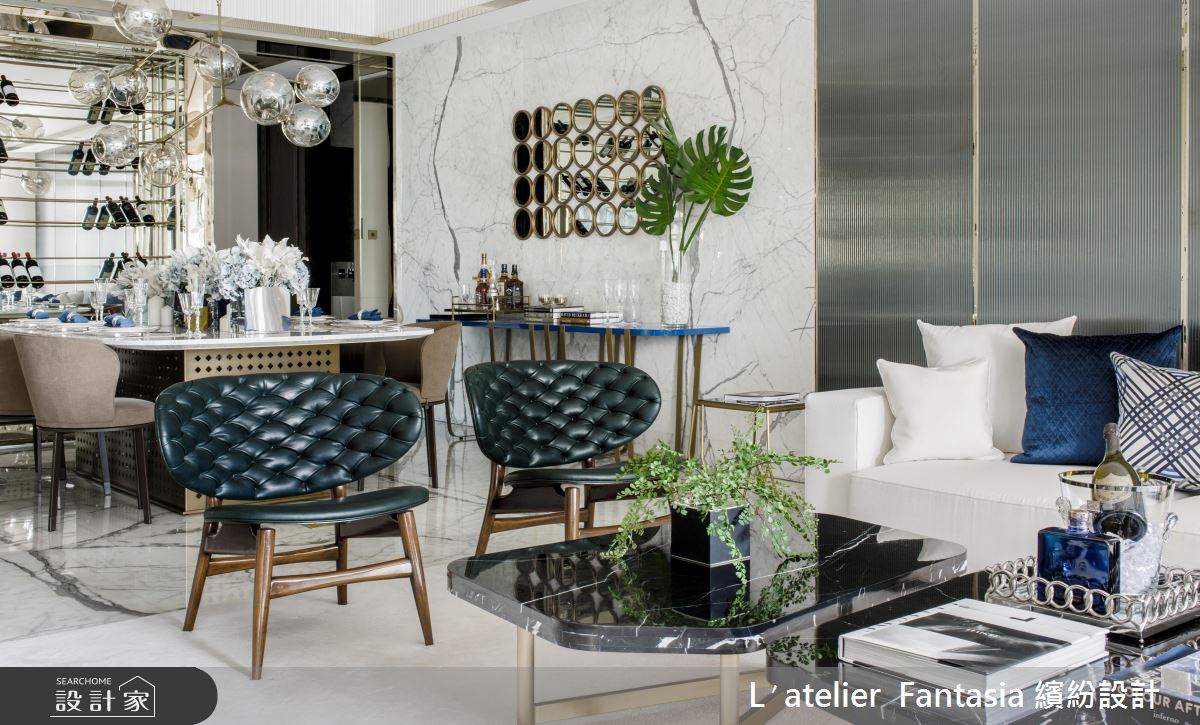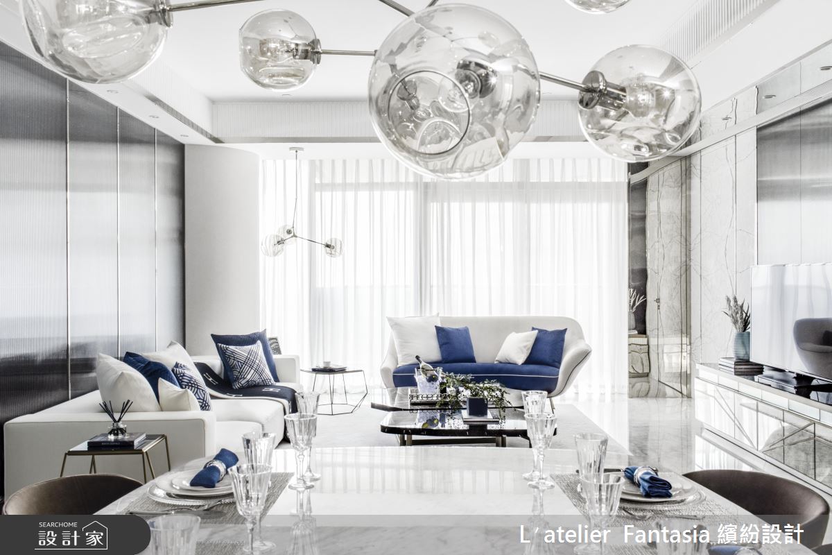 經由設計師評估後,分析了屋案的優點與缺點分別是面對河岸,有著無邊水景;但就比例而言客廳寬度距離過小,且有大樑橫亙。因此設計師利用拱門接壤虛化大樑壓迫,主臥入口處改以暗門設計巧妙延伸電視牆長度。原格局由於開門見客廳,因此設計師以「二進式」玄關將客廳與廚房分別設置於左右兩側,長虹玻璃同時兼具玄關端景與餐廳酒架展示,營造了唯美的光影感受。本案以奢華大器為定調,玄關即可從米字型拼花大理石嗅出這樣的氣息;進入公領域,以開放式設計串連客、餐廳。整體公共空間以純白大理石與鍍鈦打造前衛的黑白感受,點綴金屬、植栽與寶石藍色調,創造時髦的異國氣息。