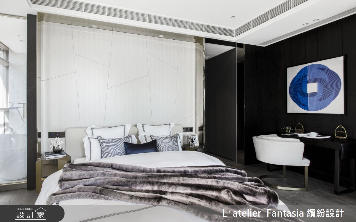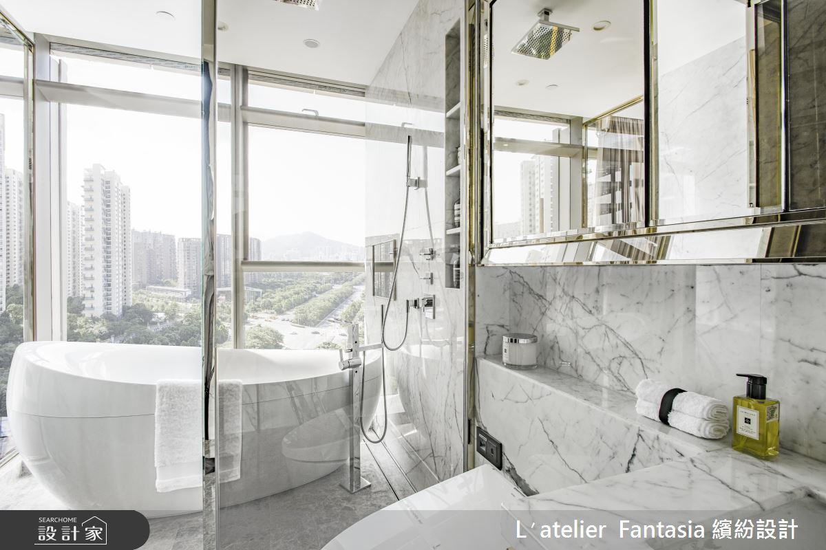 主臥讓床尾面窗,此安排能讓屋主取得最好視野,搭配黑白牆面與幾何設計,主浴同樣有大面積採光,大理石材與金屬細節搭配獨立浴缸,奢華享受深圳市景。