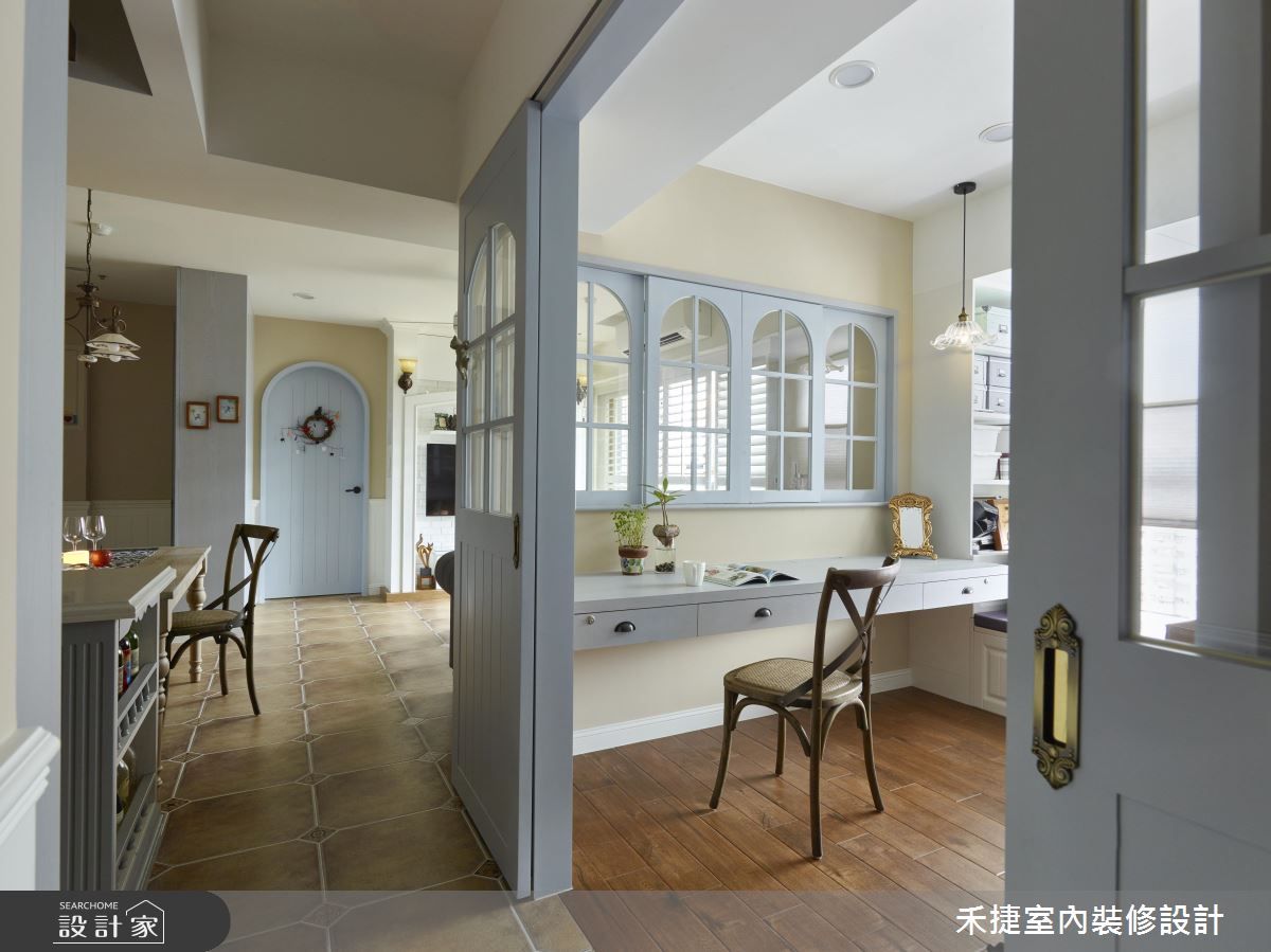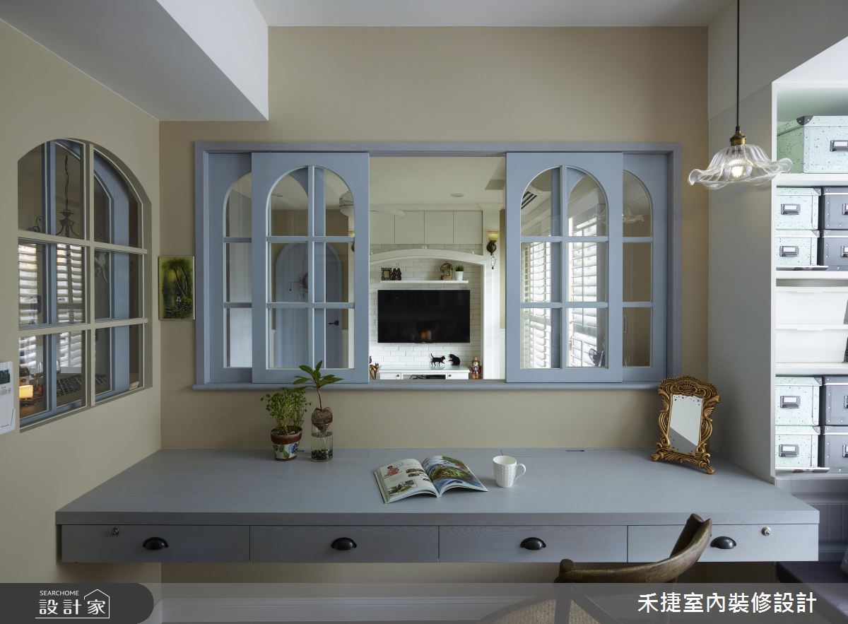 客廳和書房之間運用室內窗設計,可以兼具開放、隱私等功能性,加強家人的生活互動,而歐式風格的窗戶造型,也成為家中的一道風景亮點!
