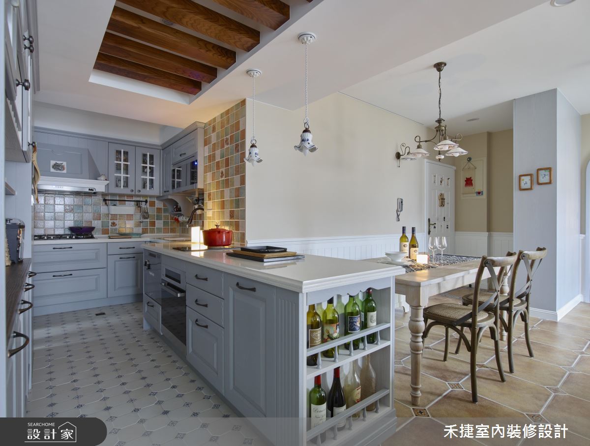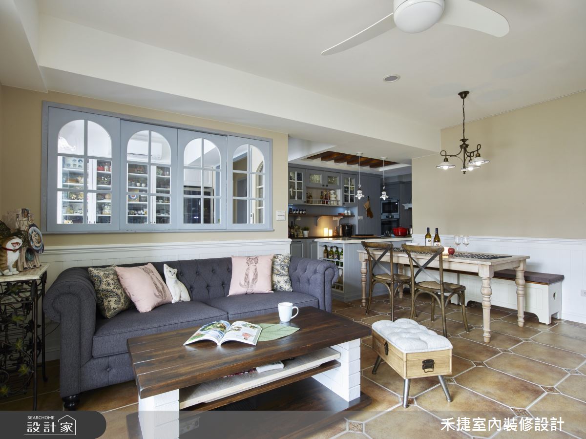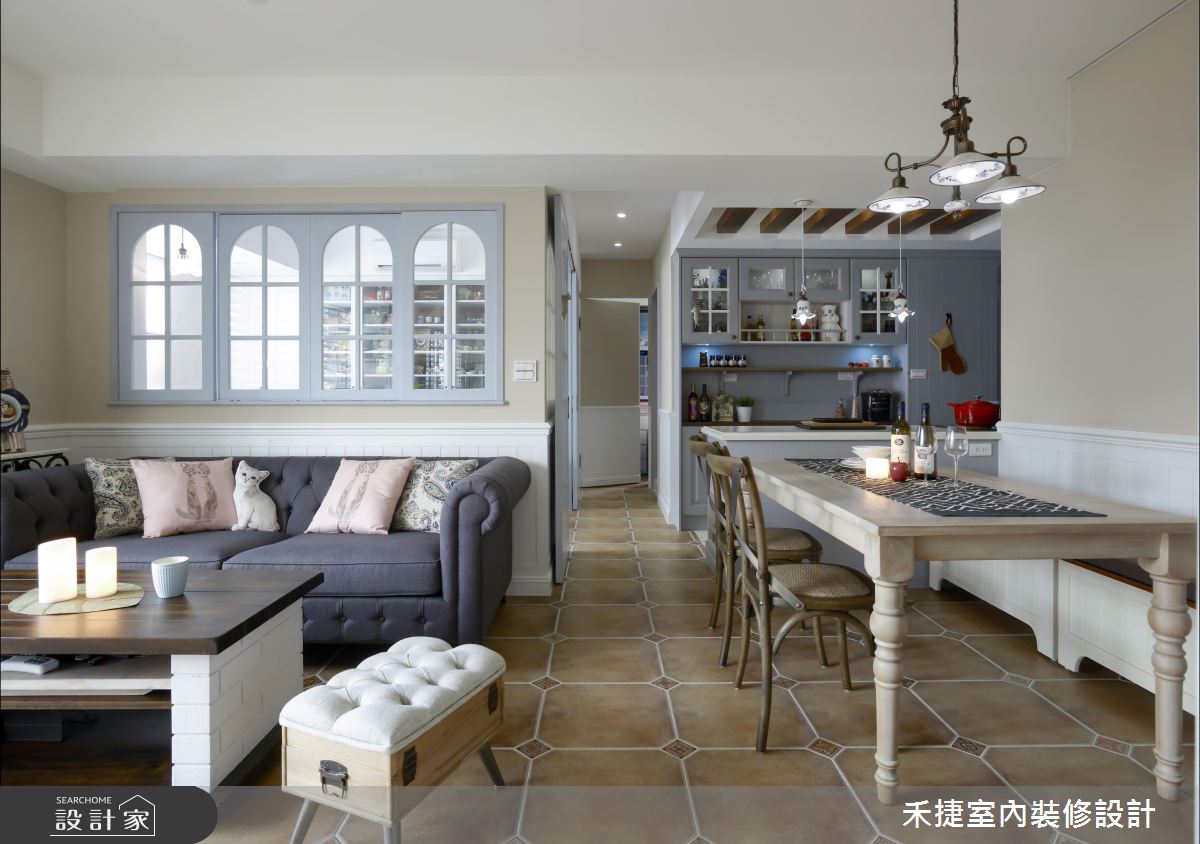 女主人喜愛鄉村風,而職業為廚師的男屋主,希望 23.5 坪的住家,在裝潢後可以有一處大廚房,設計師除了為男主人打造寬敞的開放式廚房,也利用壁爐造型的電視牆、線板等元素,以及溫和的灰藍、藤色,塑造出屬於夫妻兩人的幸福鄉村風部屋!