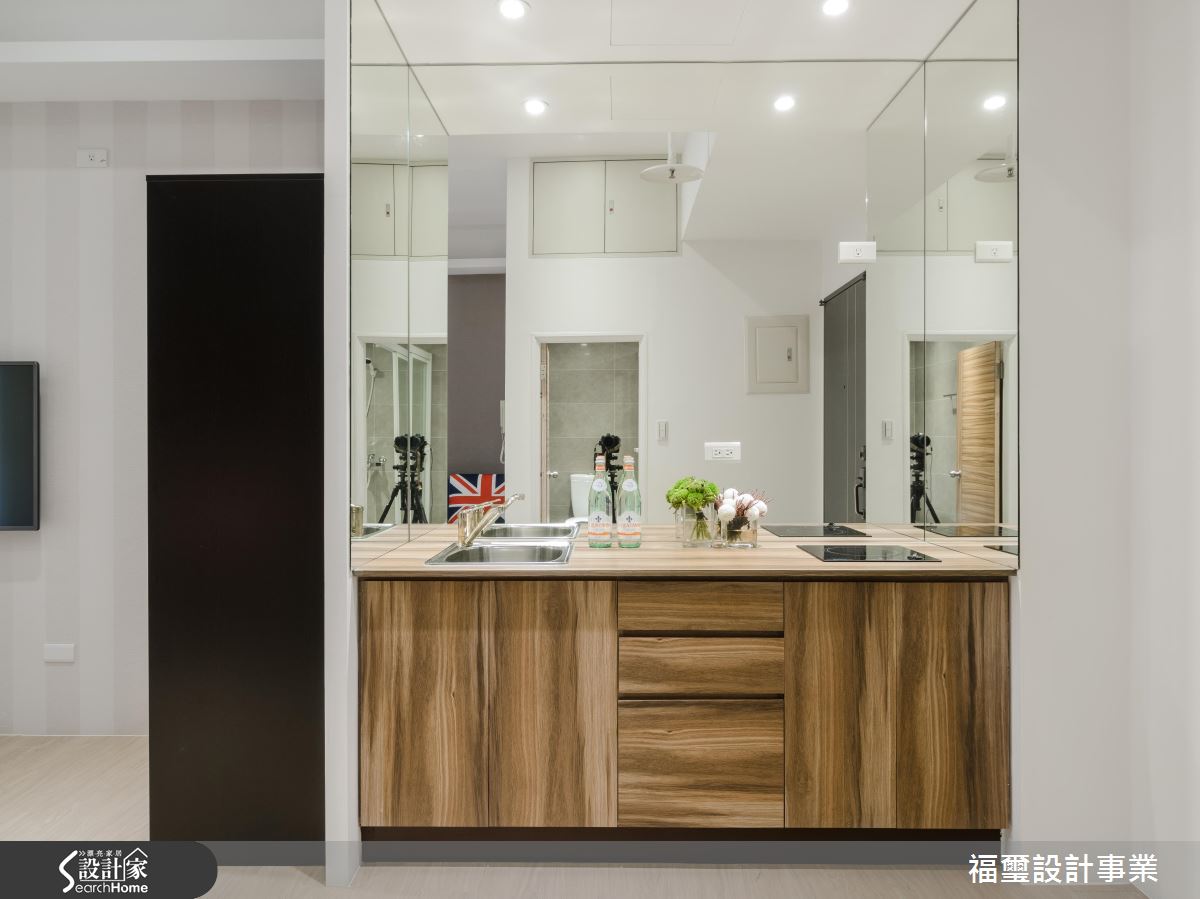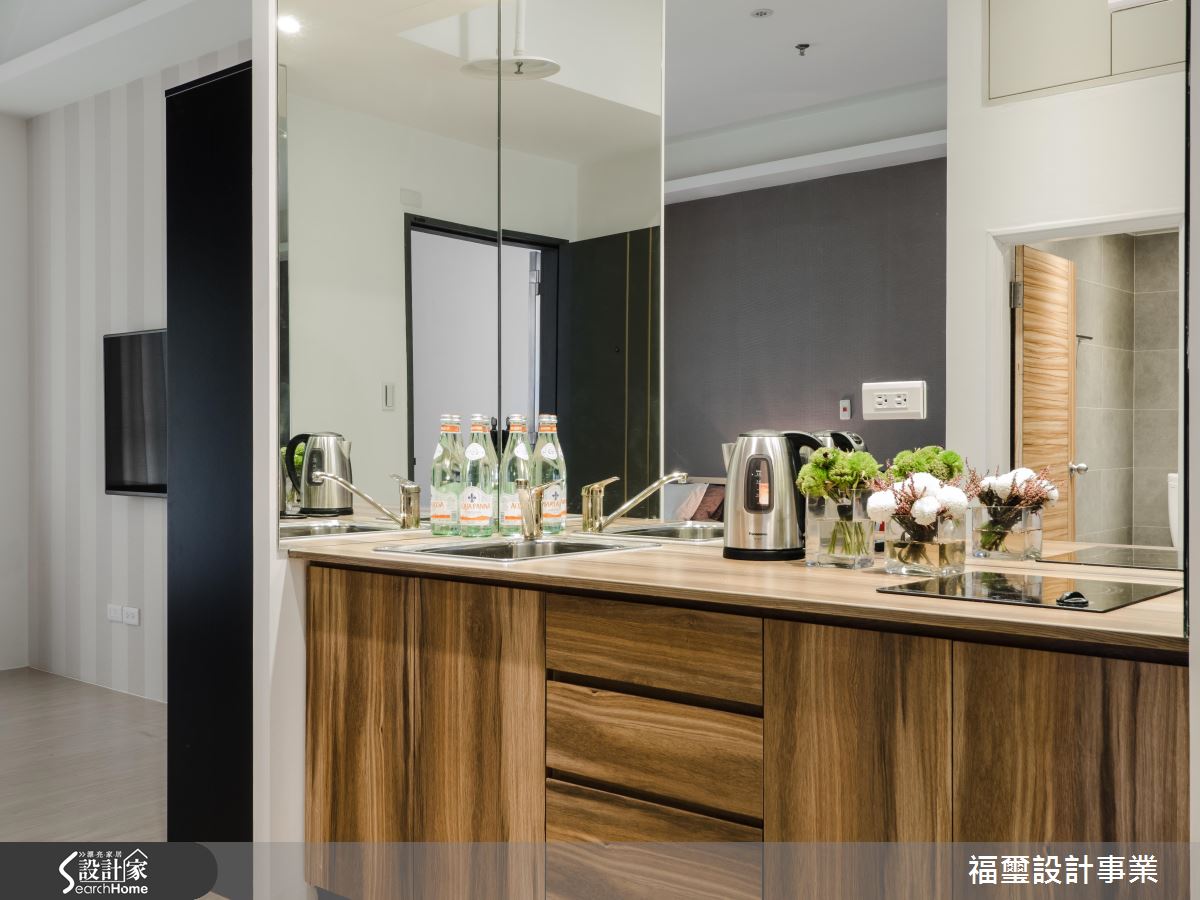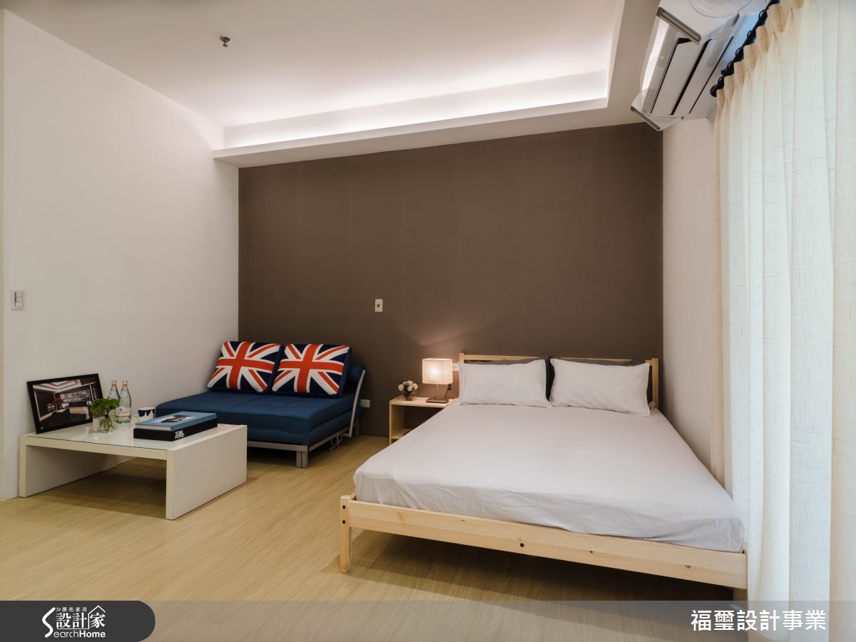 設計師採白色作為空間主調,透過窗戶導入明亮陽光,使小坪數不致狹隘,可達到挑高的視感,且不在室內設計多餘隔間,保留開敞留白,營造不顯雜亂的感受,且順勢讓輕巧的活動家具型構焦點,讓空間可隨時由屋主依循需求做變化;同時巧妙以大面積深咖啡色鋪陳床頭,與白色主調形成深刻對比,凝聚個性魅力;廚房流理檯則給予大片鏡面與收納機能,再融入深刻木紋,塑造清新表情,同時兼具洗手檯功能,讓此角落集結多元機能,塑造ㄇ字型的多功能角落;衛浴,注入了乾濕分離設計,讓使用情境更為便利,牆面則鋪述淺灰色的磚面,締造簡約清爽的質感!