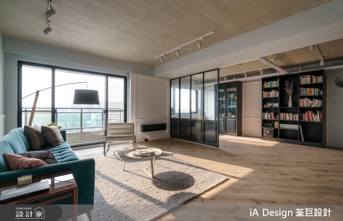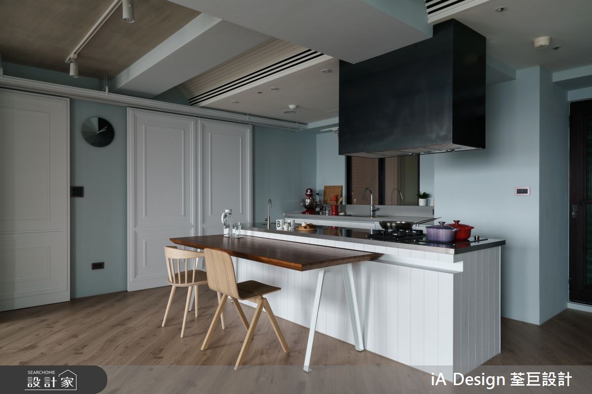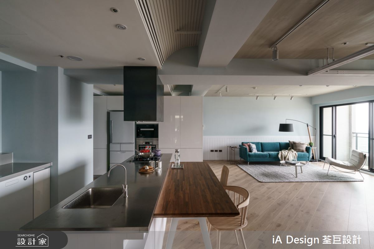 設計師透過彈性隔間規劃,讓公領域可全然開放,串起每一道光線和視線,並捨棄常見的沙發與電視牆相對格局,量身訂製符合使用習慣的動線,於客廳對面安排一間多功能房,透過清玻拉門做為輕透的分水嶺,使多功能房可作為書房或瑜珈室使用,而當拉門完全屏蔽時,書房亦可變身成客房,讓每個生活主題都自由不受拘束;風格上,則給予清一色的純白,搭襯自然採光及繽紛軟件創造亮點,演繹活潑氛圍,天花板則巧妙鋪敘木紋質感,與木地坪相互對應,凝聚溫潤的生活暖意,且運用開放手法規劃餐廳,將餐桌結合中島吧檯,營造悠閒的用餐氣氛!