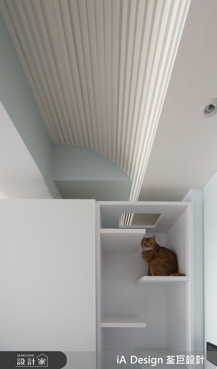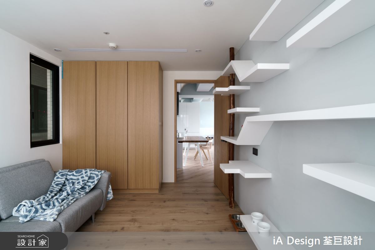 為了貼近愛貓的習性,設計師除了盡可能讓出居家走道外,更規劃一間專屬房間,於牆面嵌製許多層板跳檯,屋主五隻貓可隨心所欲在此活動!