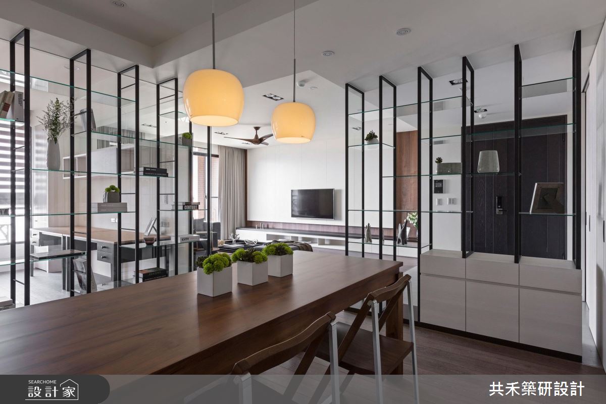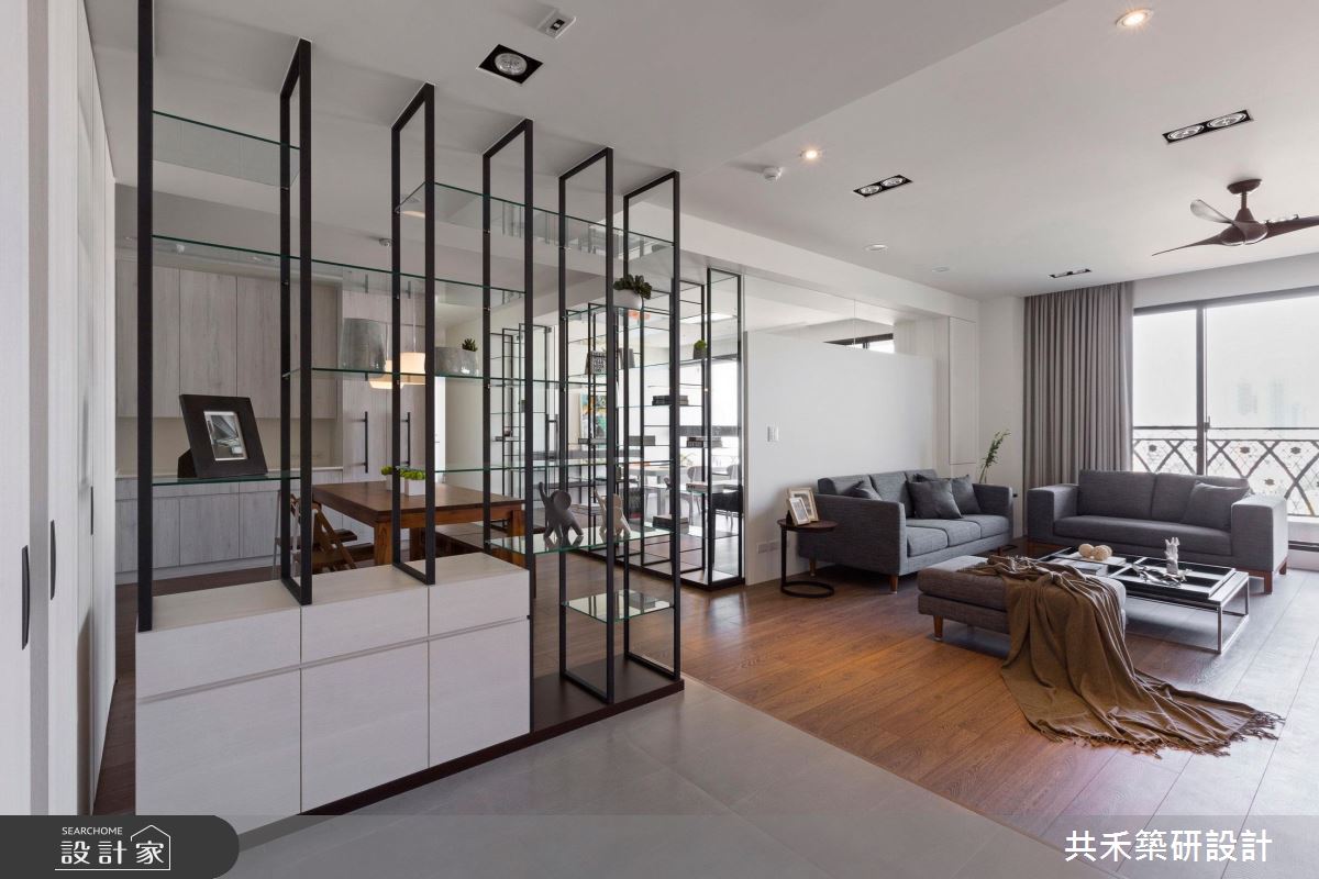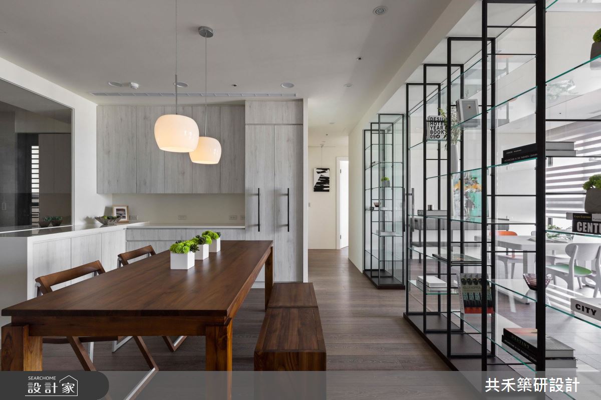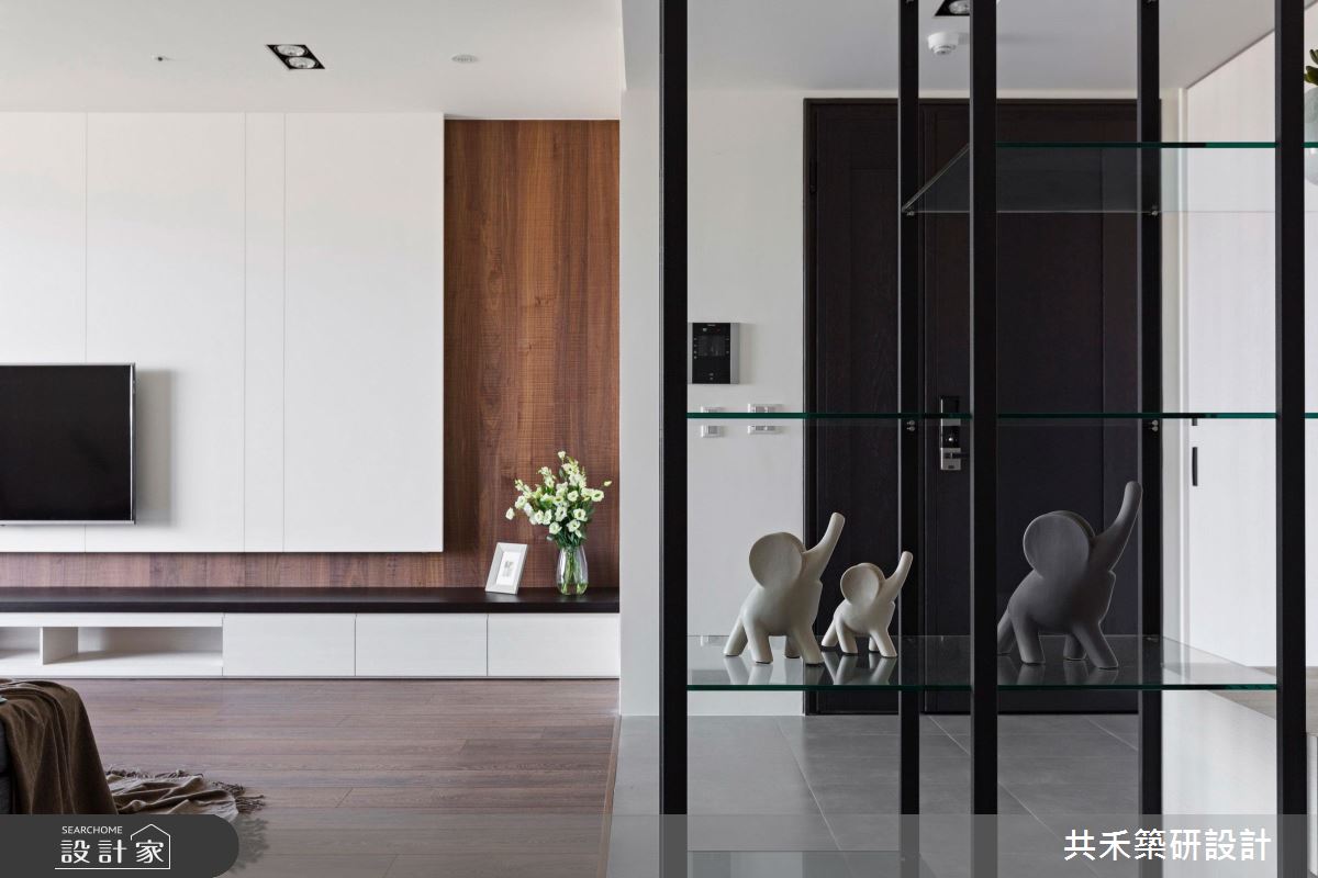 玄關以灰色調舖陳地坪,與原木質感飾底的公領域界定開來,前方藉由玻璃開放櫃的擺設,讓餐桌與玄關有所劃分,避免開門見灶的風水疑慮,同時強化收納需求。公領域全面沉浸在陽光的洗禮,電視牆以白、木紋色塊堆疊出漸層美感,沙發與單椅覆以灰色系布料,加上金屬線條勾勒的茶几,植入低調的人文美學;明亮的戶外光線從書房窗戶引入,無刻意打造隔間牆做為公領域之分水嶺,僅以開放的玻璃層架圍塑領域,餐廳與廚房之間也以玻璃門片打造,穿透質材的安排,讓光線深度走進餐廚區,享用佳餚與烹調的領域充滿明亮、乾淨的自然氣息,深色原木的餐桌椅替現代私宅挹注一份溫暖,同時傳遞家的動人溫度。