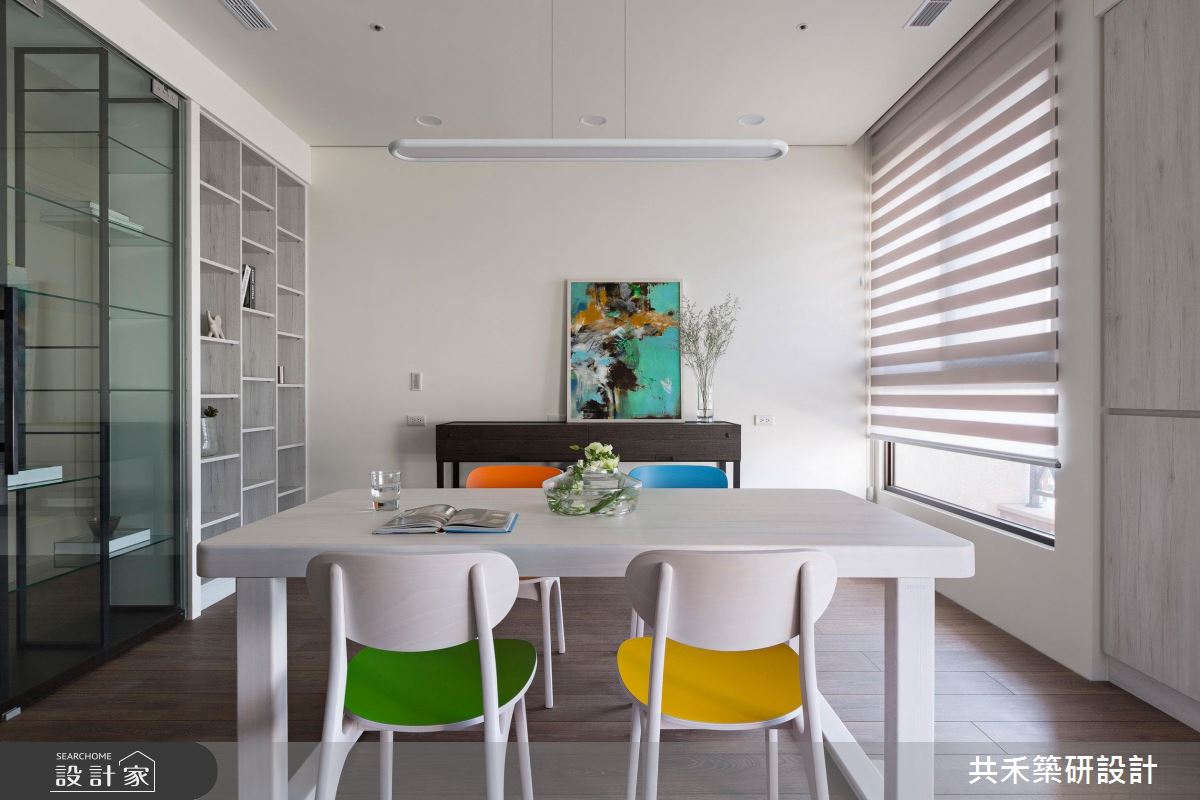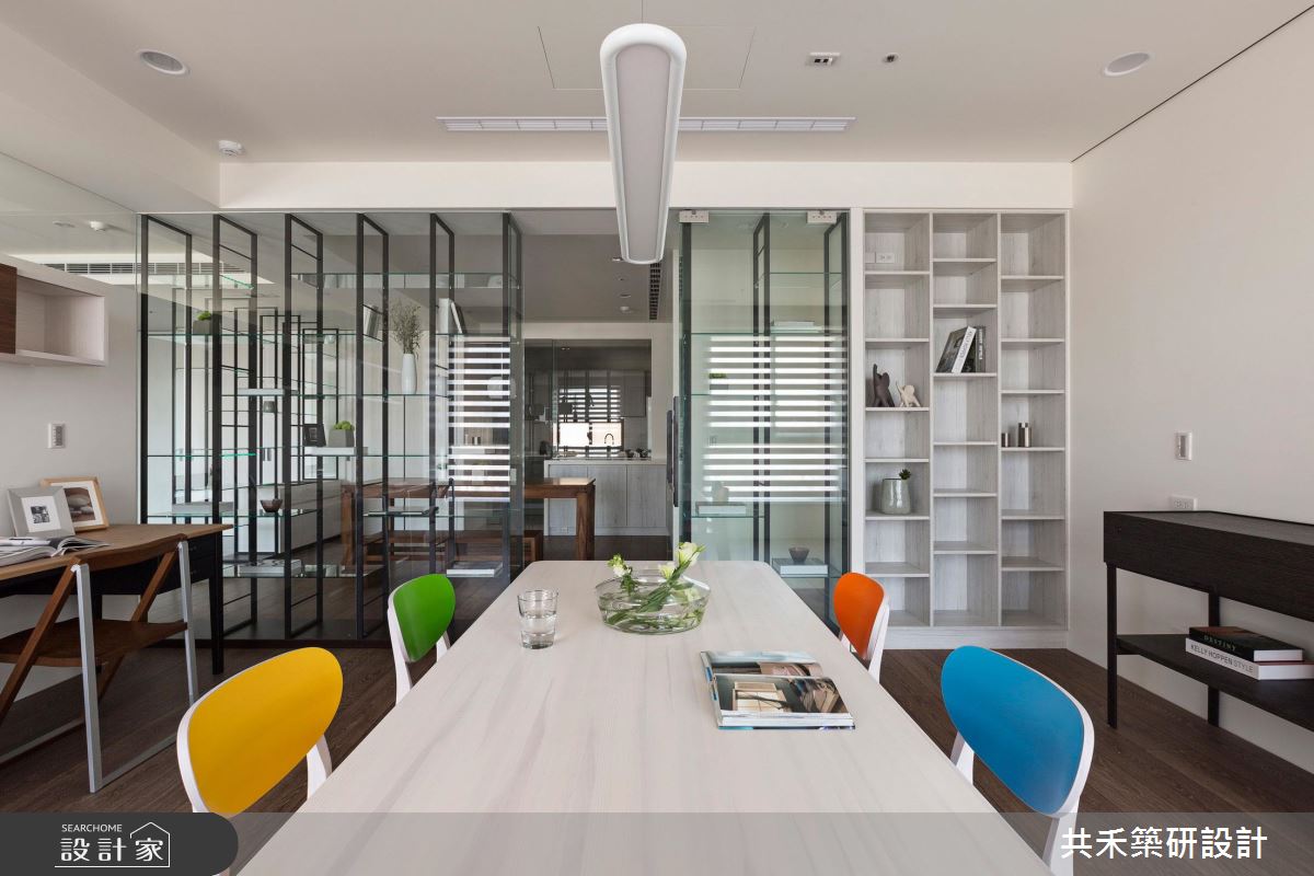 由於家裡的小孩喜愛閱讀,因此打造大量的書櫃藉此收藏,而以玻璃開放櫃做為展現的手法,讓收納機能同時做為隔間與展示美學之用,讓生活感自然妝點居家空間。