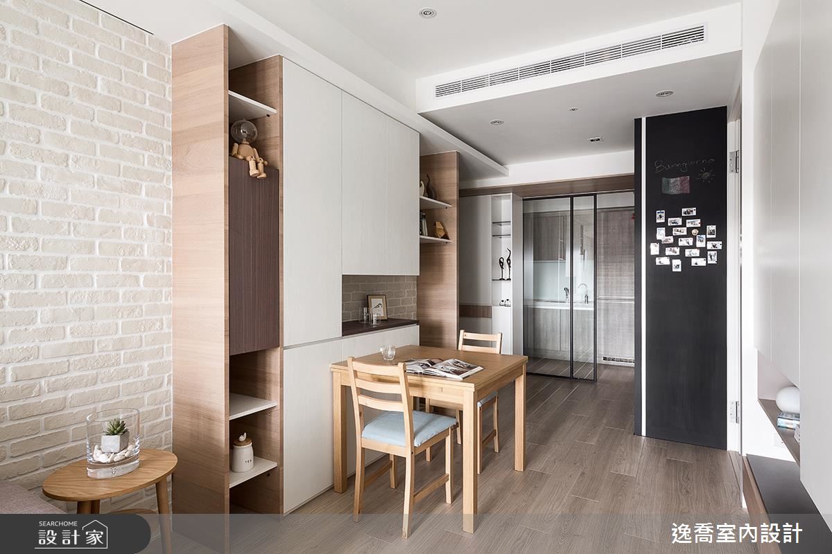 玄關旁原有建商附的開放式吧檯,設計師在了解屋主需求後,將吧檯空間改為大型的鞋櫃和收納櫃,滿足屋主的收納期待,而玄關天花板處也利用木皮做出造型設計,並延伸至下方牆面結合門片,完美隱藏盥洗區直對大門的突兀感,一旁牆面則刷上磁性黑板造型漆,讓夫妻倆可以記錄生活中的點點滴滴。因原本屋子偏向長型,設計師巧妙運用空間深度,加入長向線條延伸,以及大面積的文化石牆連貫,一併串連客廳和餐廳,帶來空間放大的效果。廚房外部則加設鐵件玻璃門片,不僅可以阻擋油煙,也為位在居家後段的廚房,引進更充裕的光線和增加空間穿透性。因應屋主的現階段需求和生活習慣,設計師調整主臥及次臥格局比例,為主臥室增設了更大的收納空間,也不會影響次臥的舒適度。