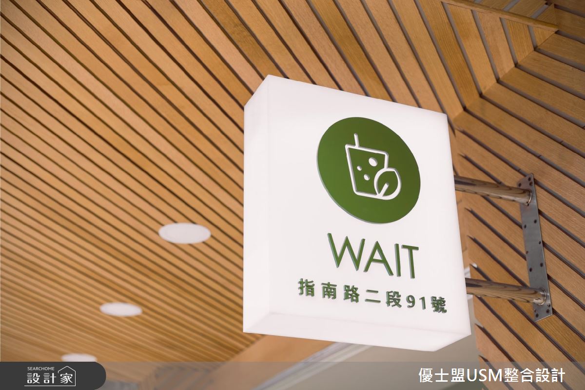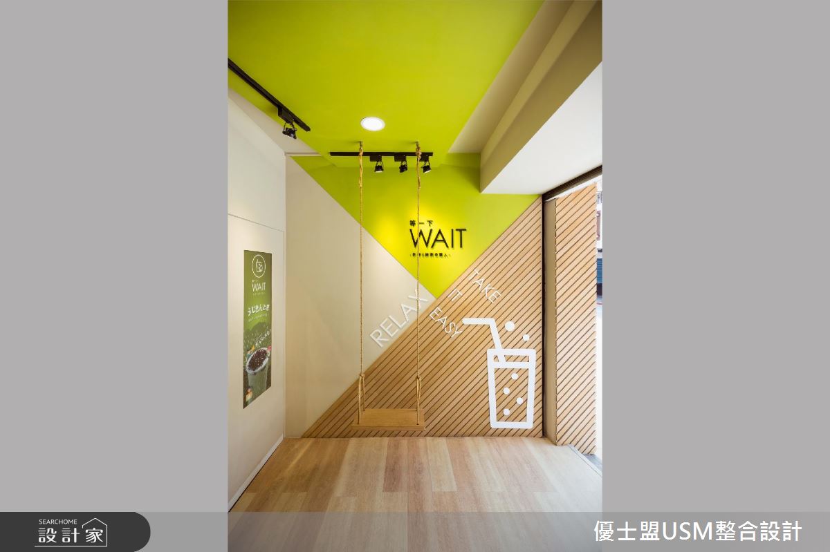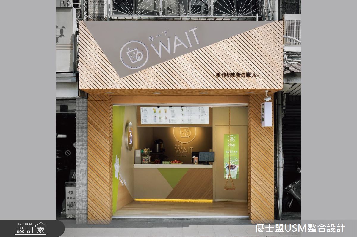 店面外觀以大量的木作質材堆疊,以斜切面設計成為壁面與天花板的獨特造型,細膩線調堆疊出漸層與活潑的感受。上方屋簷造型處,還特別以襯以灰色調、褶線邊角的傾斜三角形區塊,壓上店面LOGO名稱,打破中規中矩的安排,讓牆面流露出豐富的美學色彩;色塊堆疊中營造出和諧之美,同時感受一抹趣味性,讓到店的客人們身心得以被療癒,加上空間中運用大量的木色,溫馨自然的氣息油然而生。室內以灰、綠以及大地色系舖寫空間調性,展現日系雅緻的迷人特色,更藉由清新綠色調,烘托出「等一下」飲料店的招牌飲料──抹茶,清亮的視覺配色更挹注滿滿的活力;色塊的堆疊運用,搭佐壁面上文字與圖騰點綴,簡約之中展現細膩的設計功力,加上一旁搭建的木製鞦韆,讓人們一邊等待飲料的過程中,還可以一邊玩起盪鞦韆,饒富趣味。