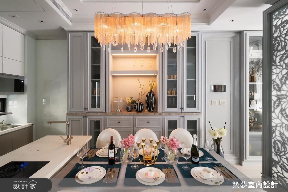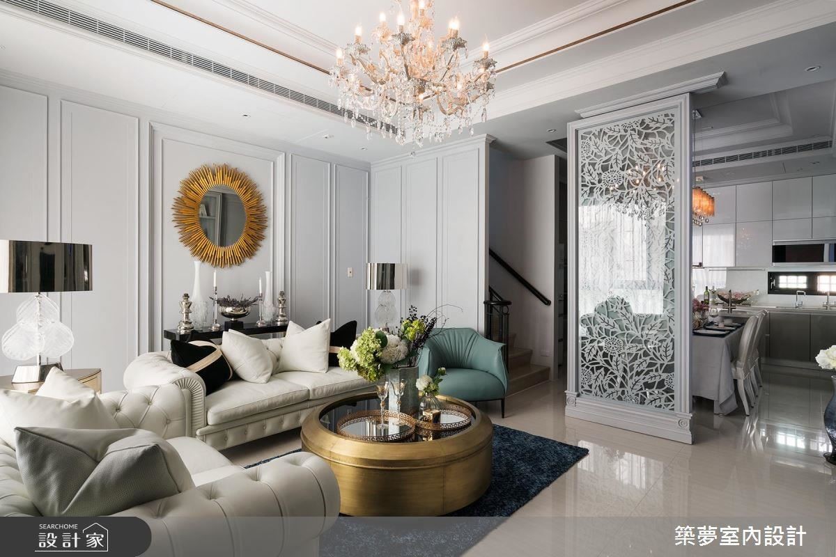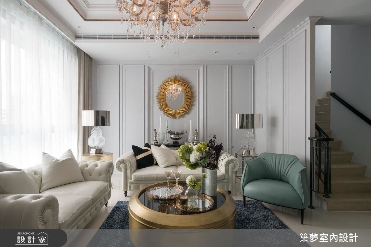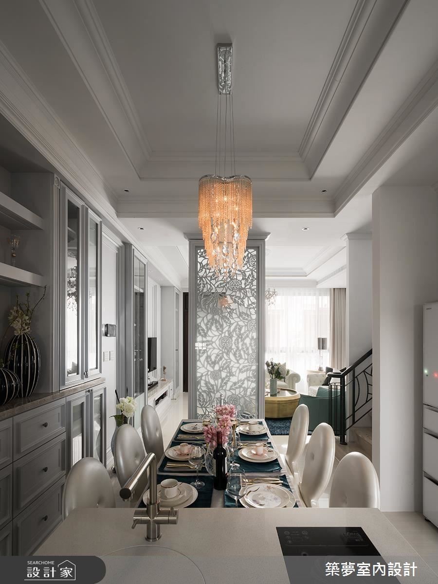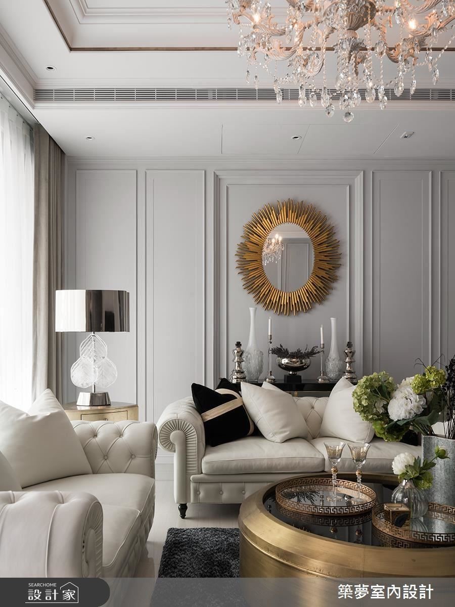 在多層次的線板之中,嵌入纖細的鍍鈦材質,巧妙地在古典語彙中,納入現代元素,帶灰色調的白,搭配霧金的鏡子、古銅色茶几,讓空間不經意地流露出復古的效果,連水晶吊燈也以低調色澤呈現歷史感,將鋒芒收斂,達到藏風納氣的效果。