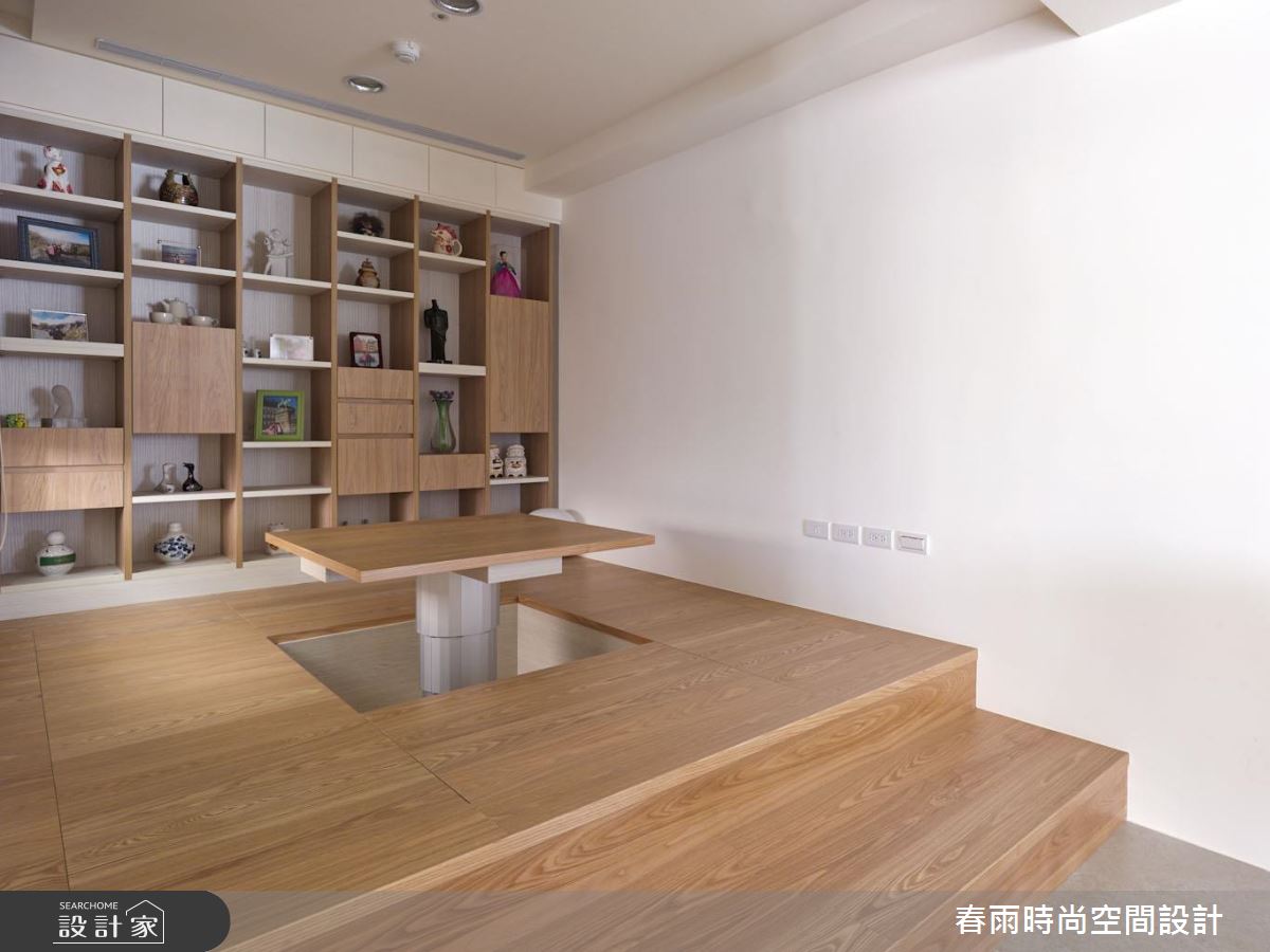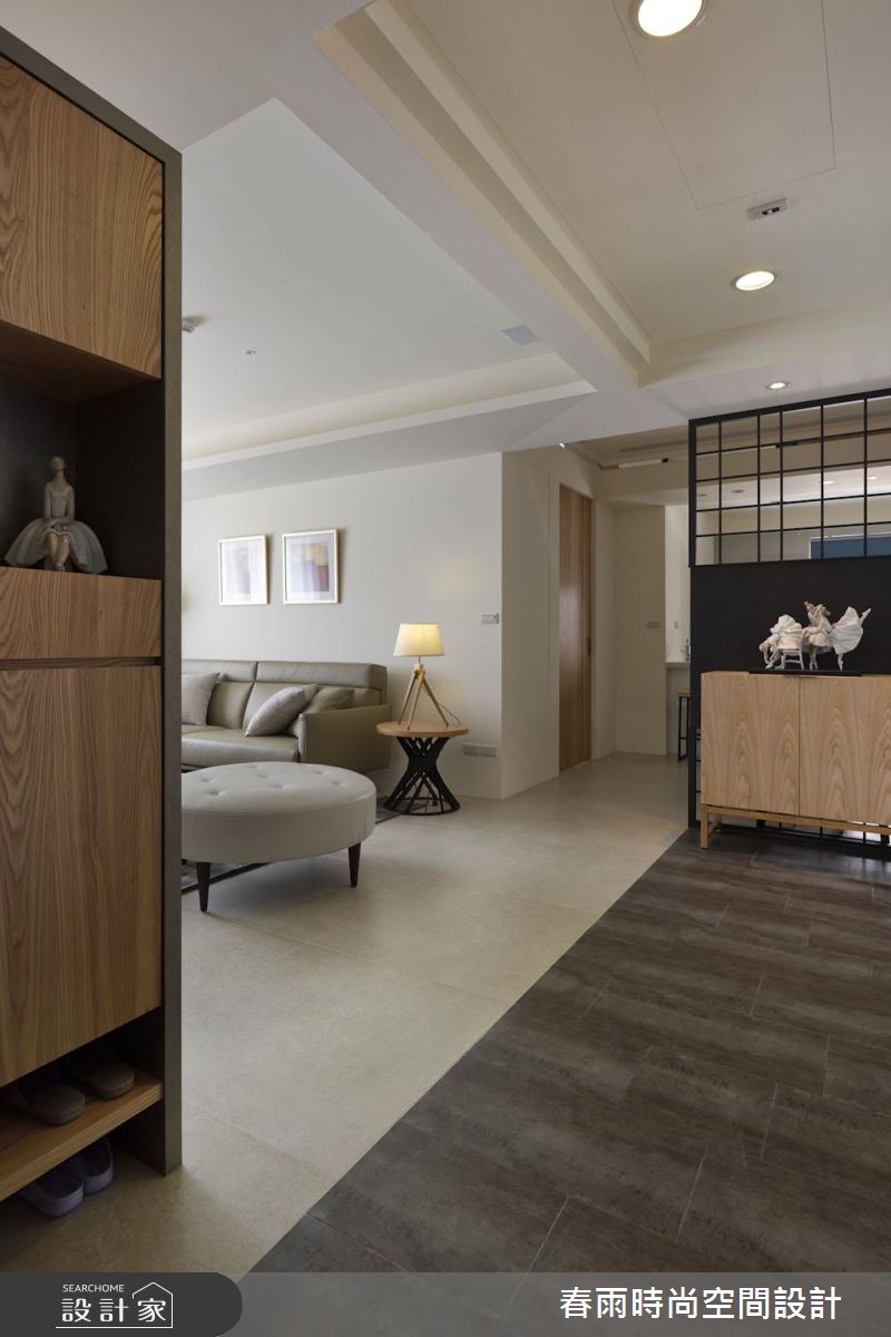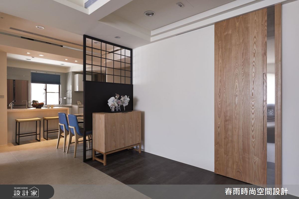 設計師將格局劃為前後兩個對角線,將客廳、餐廚與多功能區域分開,並將玄關及客浴利用地坪材質進行內外區別。首先,外部鞋櫃以一個優雅的弧度與木皮電視牆接壤,更與收納櫃結合,左右兩側分別巧妙構成收納與展示的作用。接著設計師利用木質拉門修飾了客浴入口,並為餐廚空間增設了鐵件屏隔,抹除開門見灶的風水忌諱。設計師在一字型廚房與餐桌之間規劃了吧台,成為兩個場域的鏈結,而後方的多功能開放和室則在地坪下設置升降桌,隨需求扮演閱讀與休憩等角色。臥房善用樑下畸零地作為床頭櫃用途,搭配五金成為易開、易取用的輕鬆好設計。