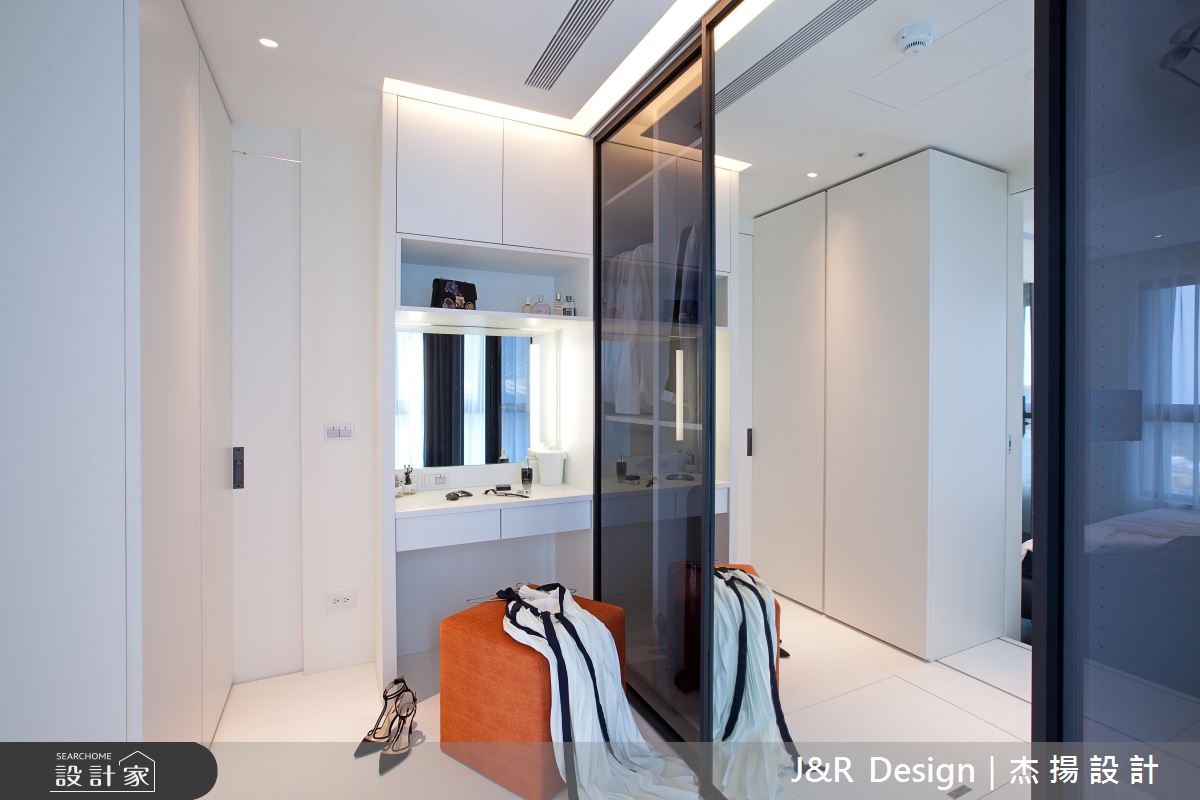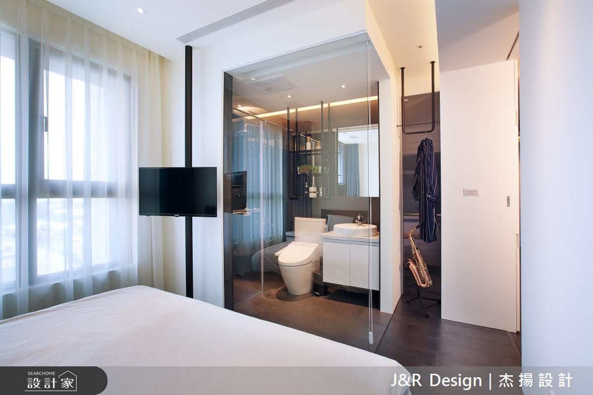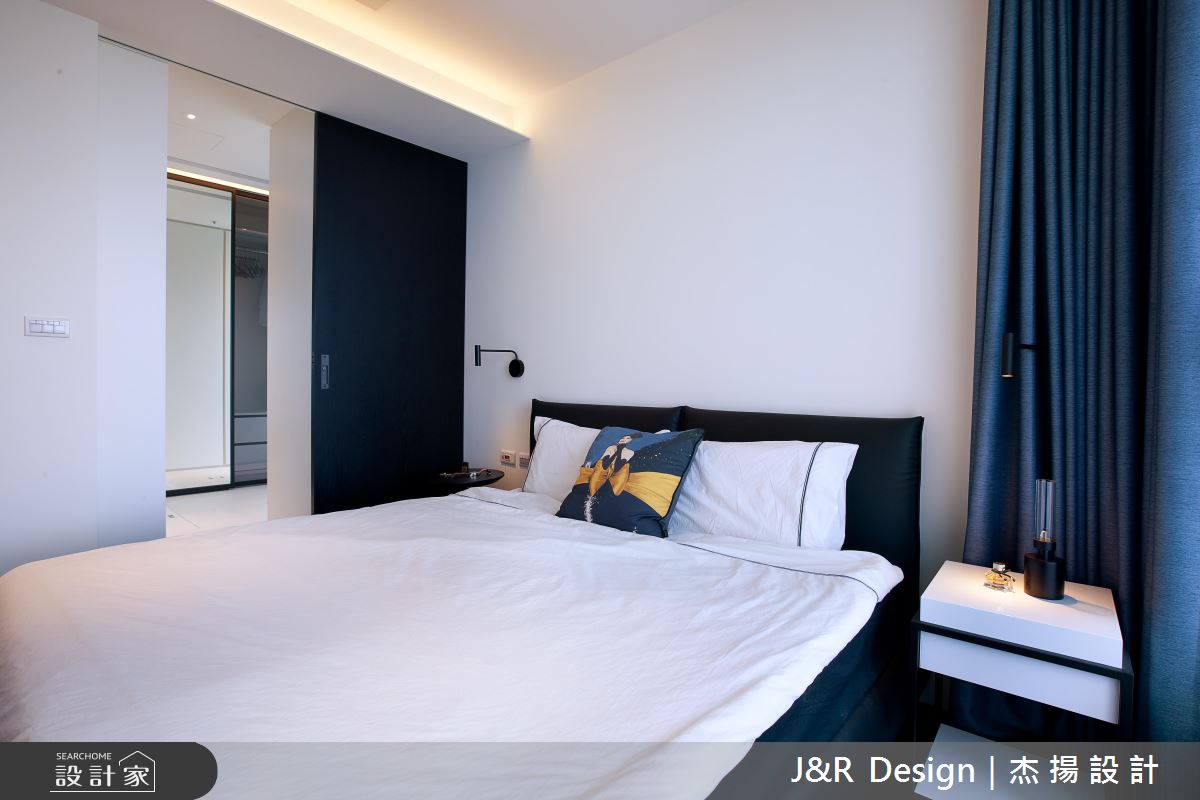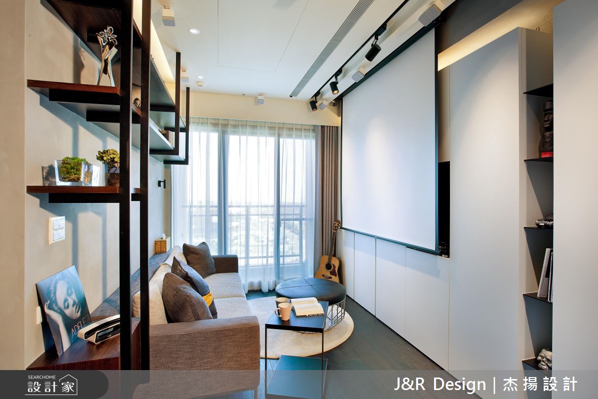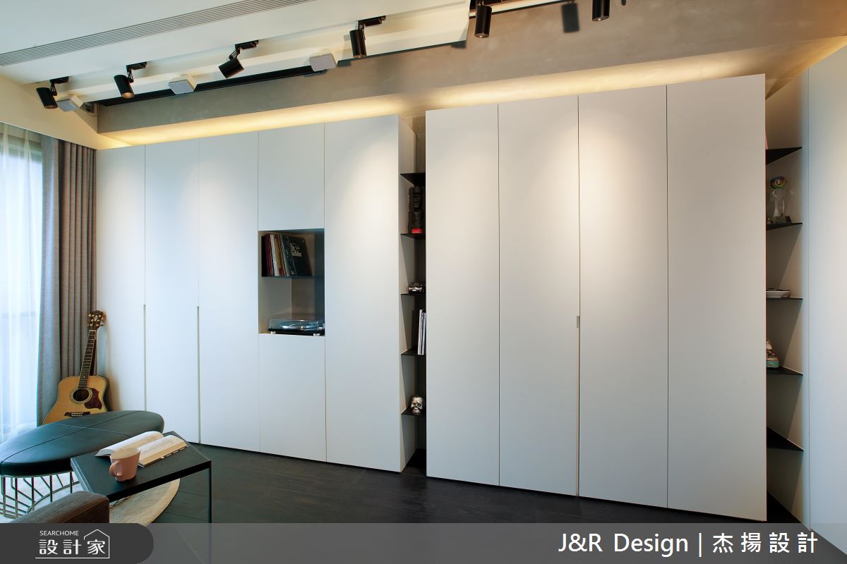 設計師突破傳統的客廳定義,透過獨特設計建構廳區人文視野,於客廳規劃全面的高深收納櫃,並加入局部開放設計,打造兩列開放書櫃,中段則做出內凹的唱片機空間,打造俐落而富有機能的客廳主牆,電視螢幕則以投影布幕取而代之,隨時轉換成家庭劇院的模式,同時依循空間尺度打造牆面木作層架,將餐桌與客廳沙發牆一體串聯,型塑極富個性的展示風景;客房則為身兼更衣房的兩用空間,採用活動衣櫃設計創造多元行進動線,當作更衣室時可從主臥房進入,當作客房時,則藉由活動衣櫃封閉主臥通道,在創意佈局中,貼近生活中各種使用情境;主臥與主浴之間更選用清玻當作隔間,不僅締造場域對話的互動趣味感,也讓空間視野獲得雙倍延伸!