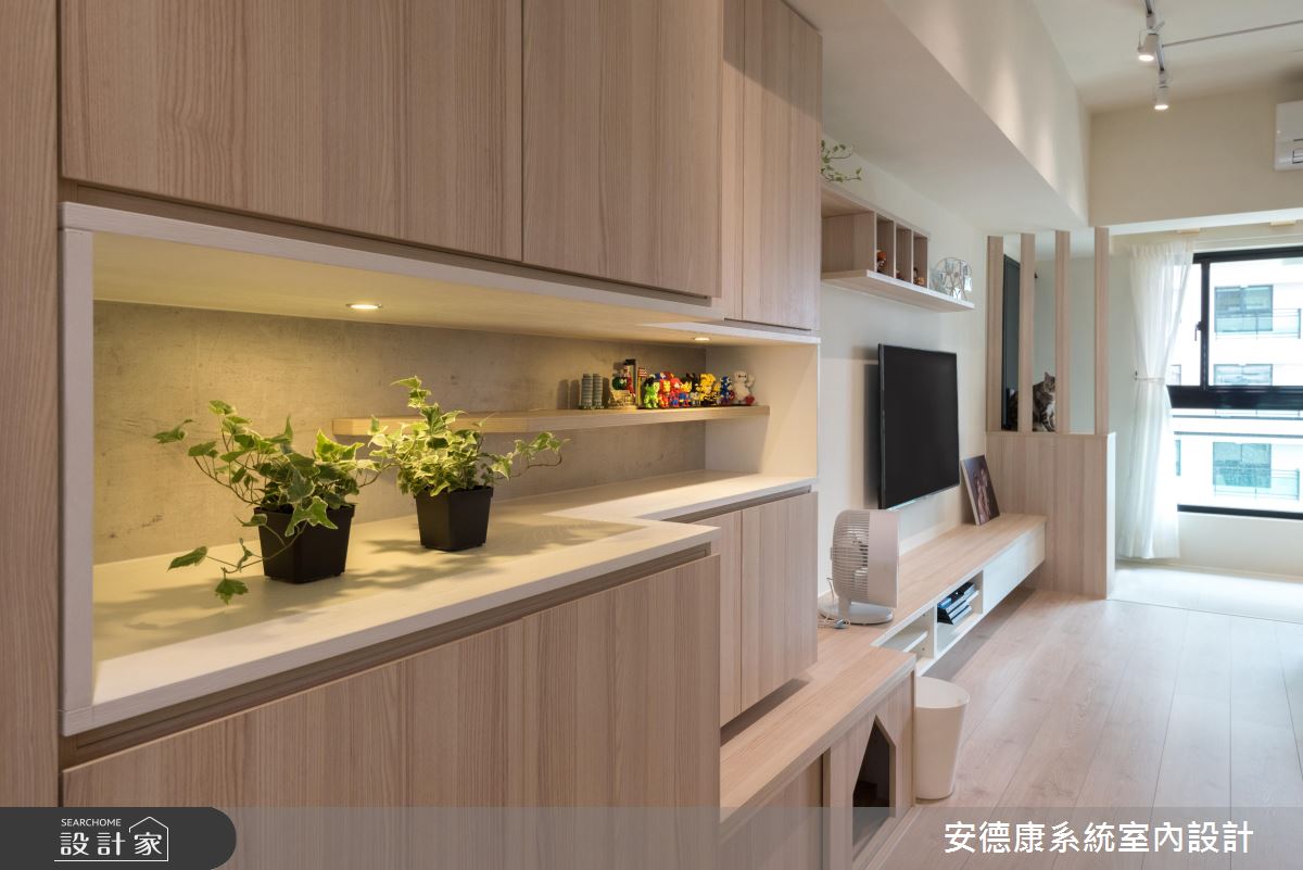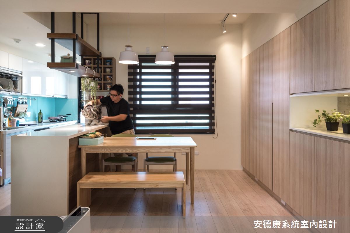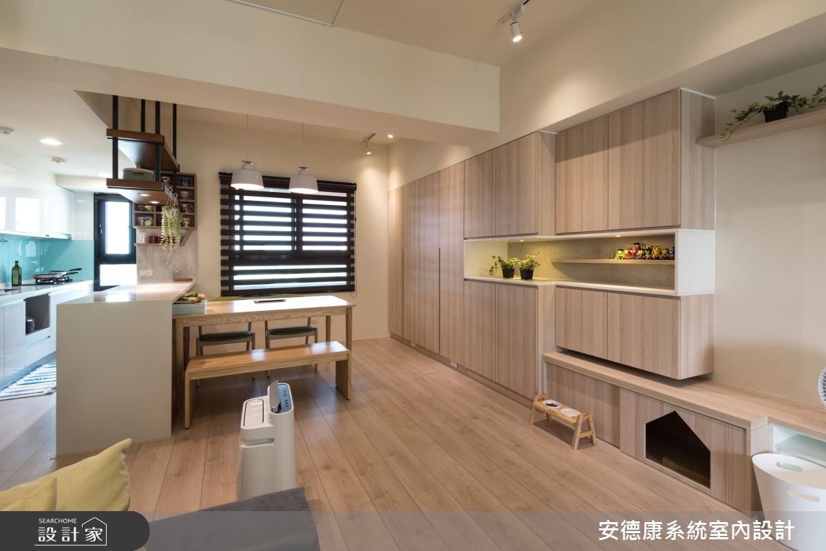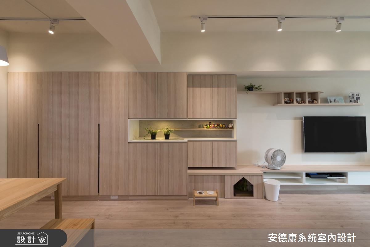 以自然、簡約的北歐態度描繪28坪的家屋氛圍,乾淨、無刻意裝修的空間基底下,藉由大量的木紋質感系統櫃設置,加上整片木地板舖陳,形塑暖調的溫馨情誼;除了玄關處引入戶外光線,天花板還搭佐鐵件吊燈,局部櫃體結合嵌燈,灑下柔和、淡雅的光感;還特別替屋主的愛貓打造一處生活空間,貓屋與系統櫃一體成形,融入北歐風格的室內設計裡。