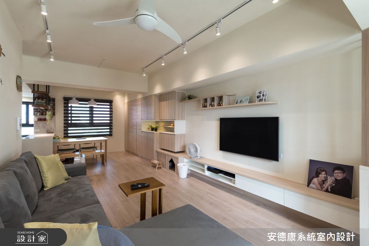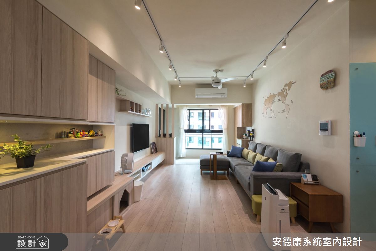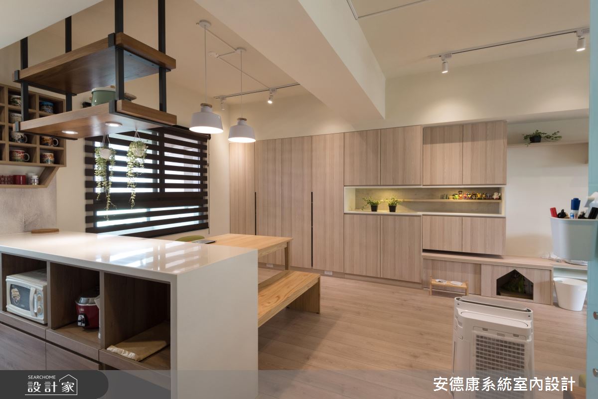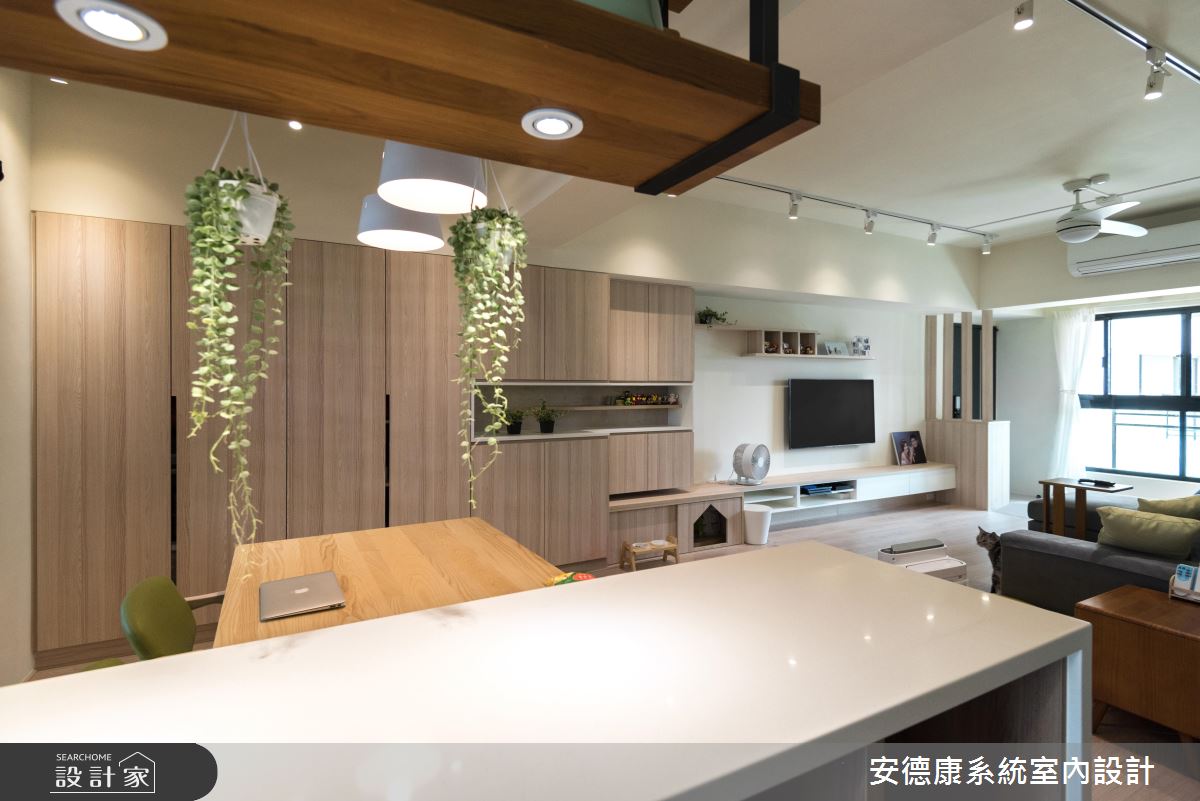 以自然、簡約的北歐態度描繪28坪的家屋氛圍,乾淨、無刻意裝修的空間基底下,藉由大量的木紋質感系統櫃設置,加上整片木地板舖陳,形塑暖調的溫馨情誼;除了玄關處引入戶外光線,天花板還搭佐鐵件吊燈,局部櫃體結合嵌燈,灑下柔和、淡雅的光感;還特別替屋主的愛貓打造一處生活空間,貓屋與系統櫃一體成形,融入北歐風格的室內設計裡。