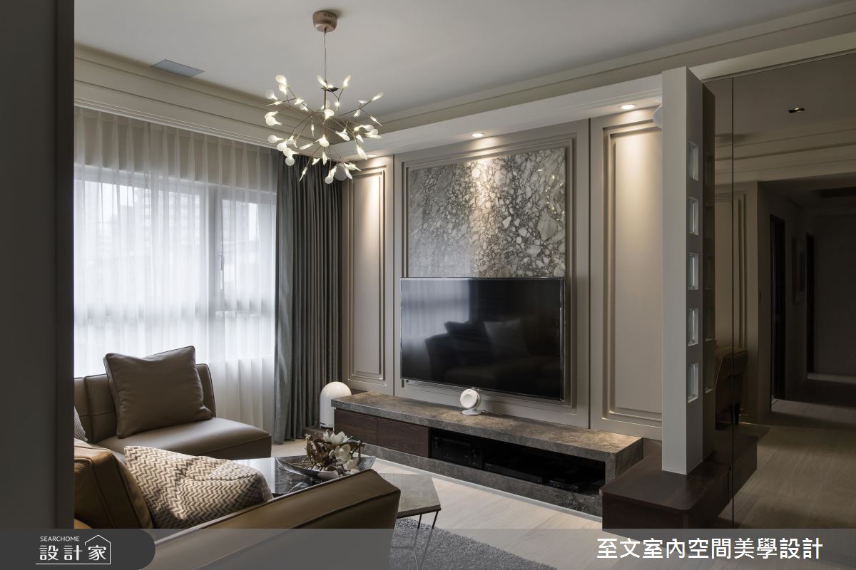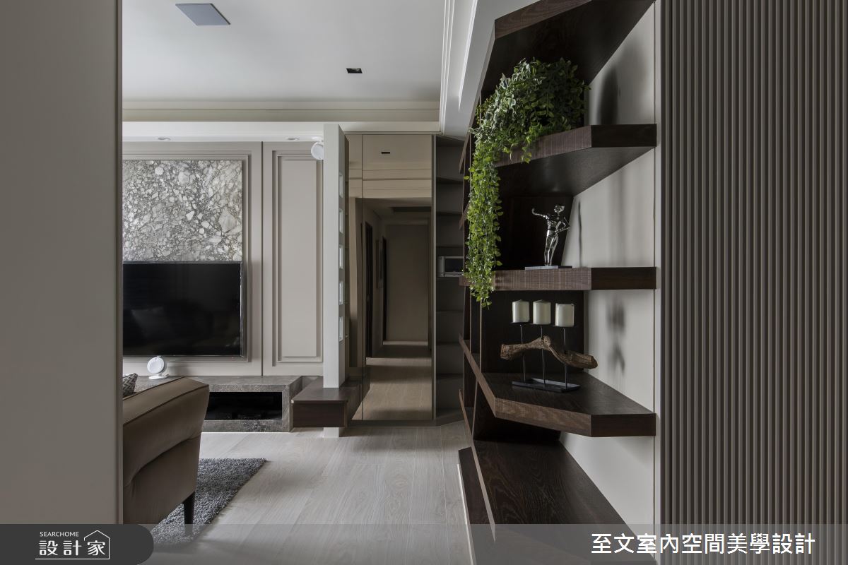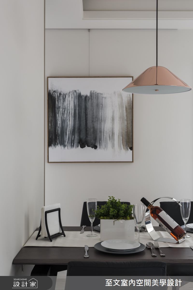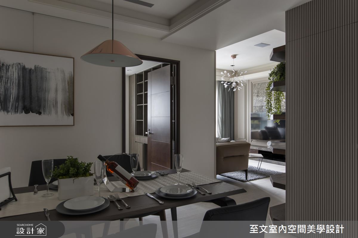 步入居宅,於入口處規劃美感與穿透感兼具的隔屏,搭配鏡面牆設計,延續開闊的空間感,成為家人們返家時沉澱情緒的寧靜場景;廳區內,則透過大地色系作為主軸,以醇厚褐色調沉靜心緒,搭配窗面納入溫柔採光,呈現溫潤恬靜的氛圍,電視牆則採用質感大理石表現視覺質感,佐以立體的線條刻劃,讓主牆表情更顯深刻,並在客廳立面安置一面展示牆,加入開放式的層架設計,隨時提供屋主展示與收納的生活情趣,而天花上方的一盞造型吊燈,也提供了照明之餘的藝術裝飾意義;餐廳區,則回歸洗鍊的純白基底,與客廳形成開放流動的動線,並在牆面加入極簡畫作的妝點,讓人文氣息呼之欲出!