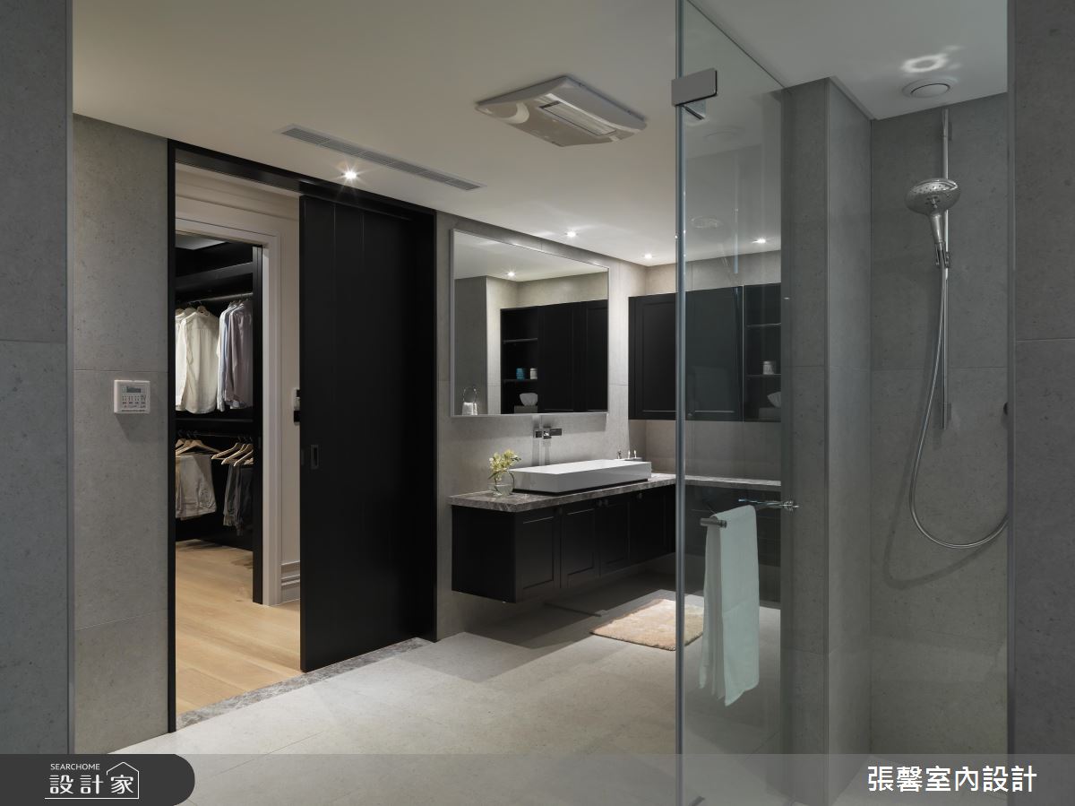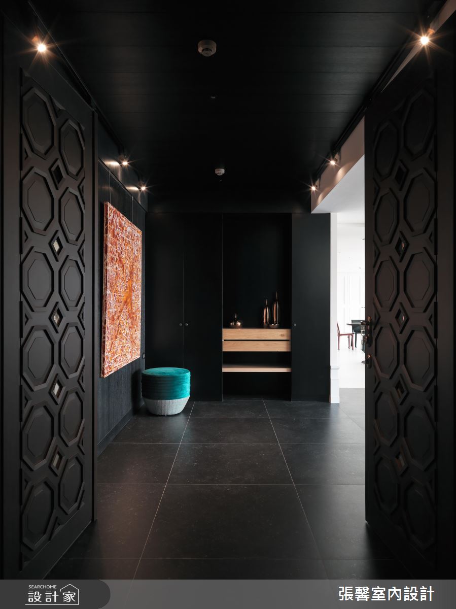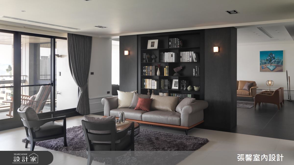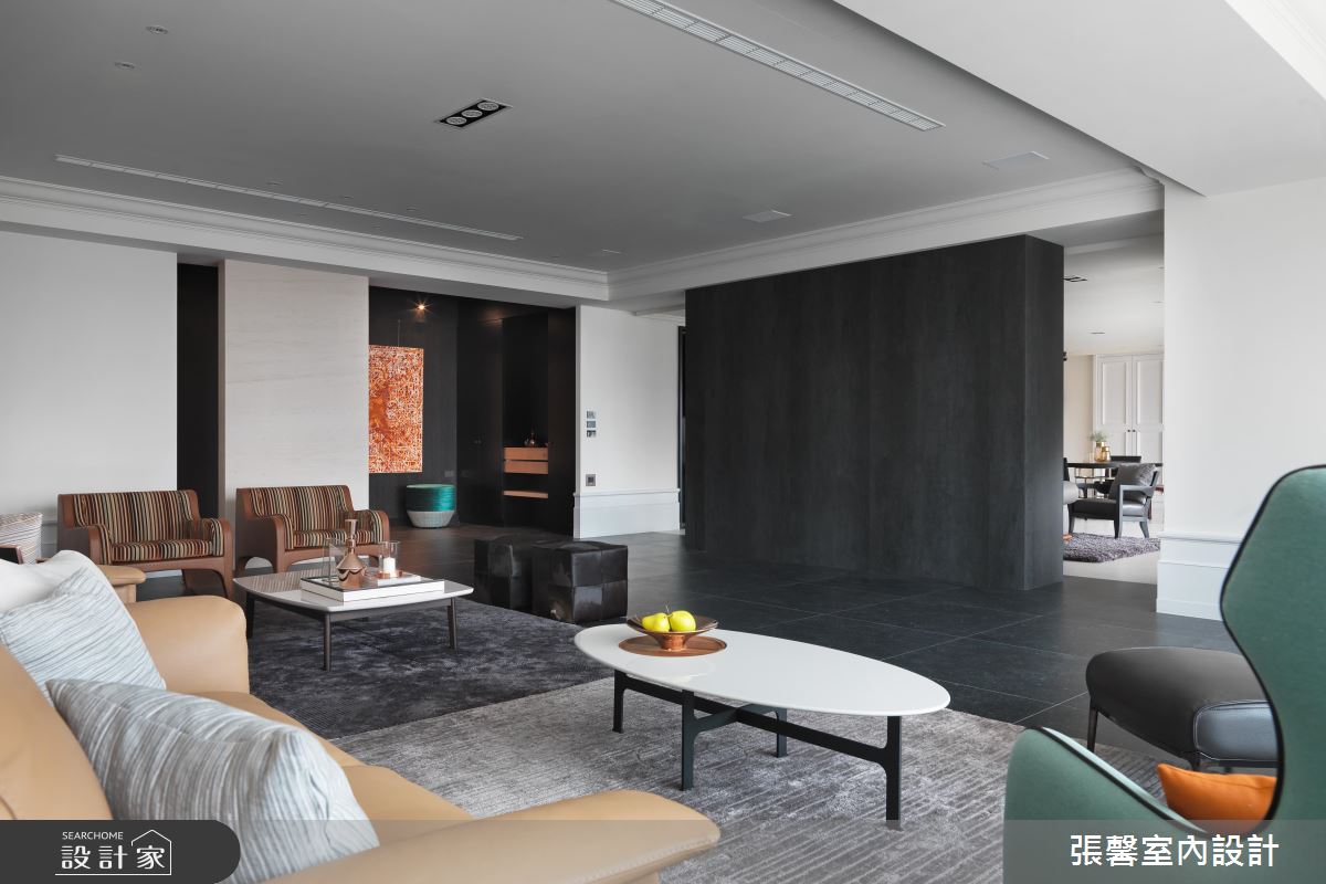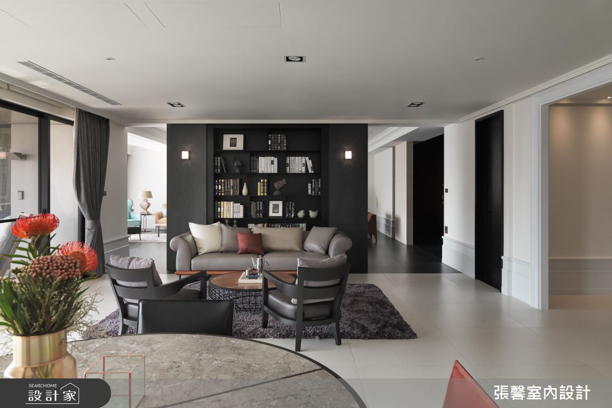 自然紋路的深色地坪從玄關處蔓延開來,大門盡頭以木作平台創造出視覺端景,另一側則以絨布質感的古典穿鞋椅,搭配大面藝術畫作,明亮、大膽的用色替內斂、低調的空間增添無限生氣。大量的白色調成為公領域基底,延伸出大尺度的豪宅氣勢,並藉由黑色調描繪出視覺層次,進而達到流暢的動線轉折;公領域裡,嚴選暖色調的家具家飾配搭,注入家的人文質感,沉穩原木質感的書牆成為客廳與書房的分水嶺,這道屏隔機能的牆體,留出兩側行走動線,除了創造日常生活的便利,更延伸不同的場域造景;書牆處擺設質感沙發、單椅,構築一處與家人談心、閱讀的書香領域。