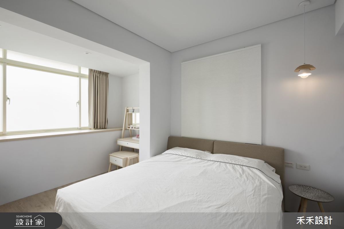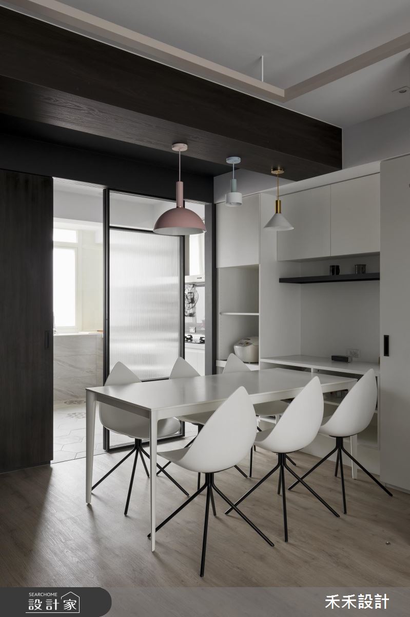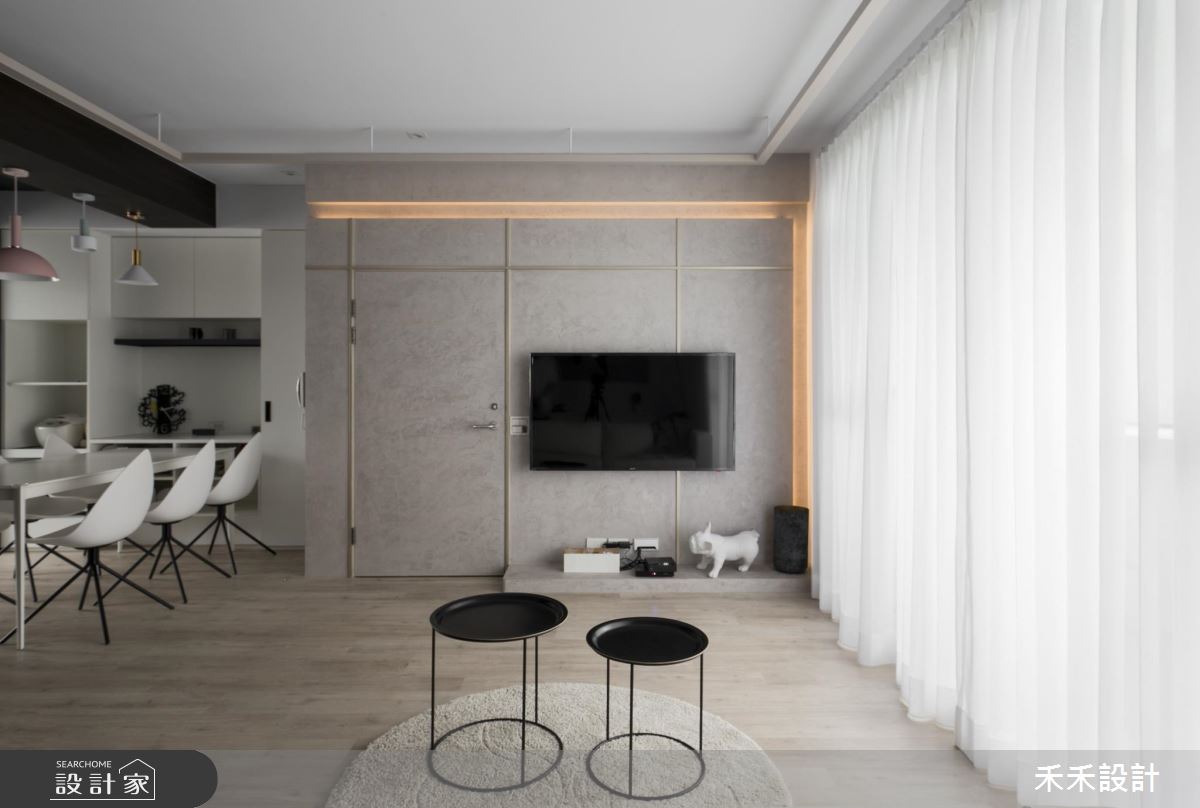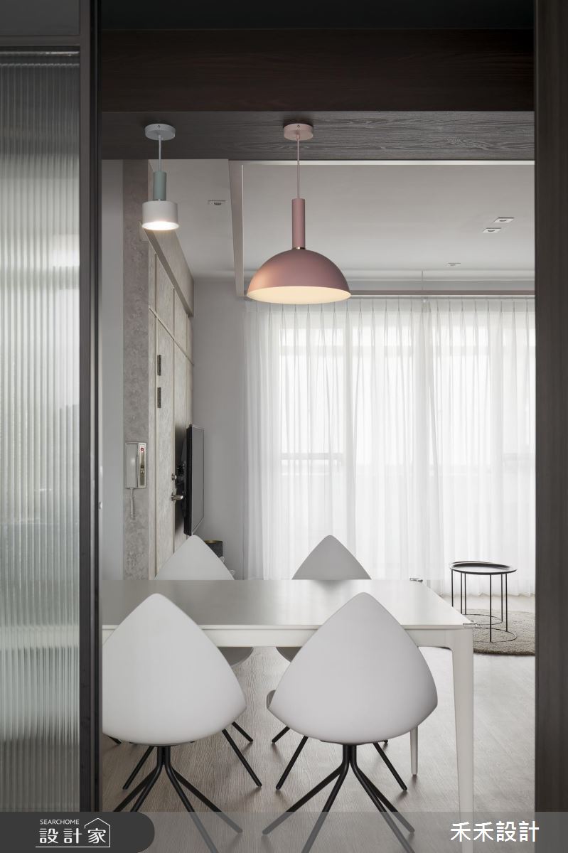 設計師拉大客廳電視牆,運用淺色義大利漆的延伸,再貼上香檳色烤漆線條,成功拉寬電視牆的尺度,並加入透光窗簾篩落日光,替廳區帶來滿室明亮,同時在牆面巧思加入滑動式縠倉門設計,點出質樸的 Loft 況味;餐廚區,則經由寢臥與公領域的區塊調整,獲得更大的空間感,不僅建構出家人的聯繫情感之地,也重拾更大的收納空間,並於素白基底之上,懸吊馬卡龍色的燈具畫龍點睛,帶出粉嫩的半空焦點;主臥內,則簡化一切色彩與複雜設計,陳列造型簡潔的床架及桌椅,且引入大量光線,展現一目了然的通透性,型塑優雅的無印感氣質!