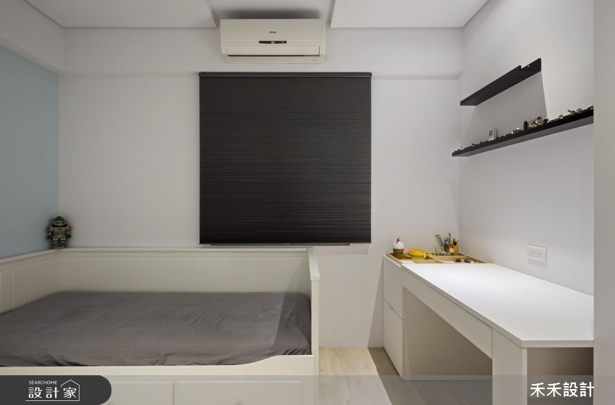 男孩房雖略為縮小,但也充分運用坪效,像是善用凹陷畸零角安置書桌,並搭配著帶有收納機能的床組,讓空間雖小卻實用性滿分!