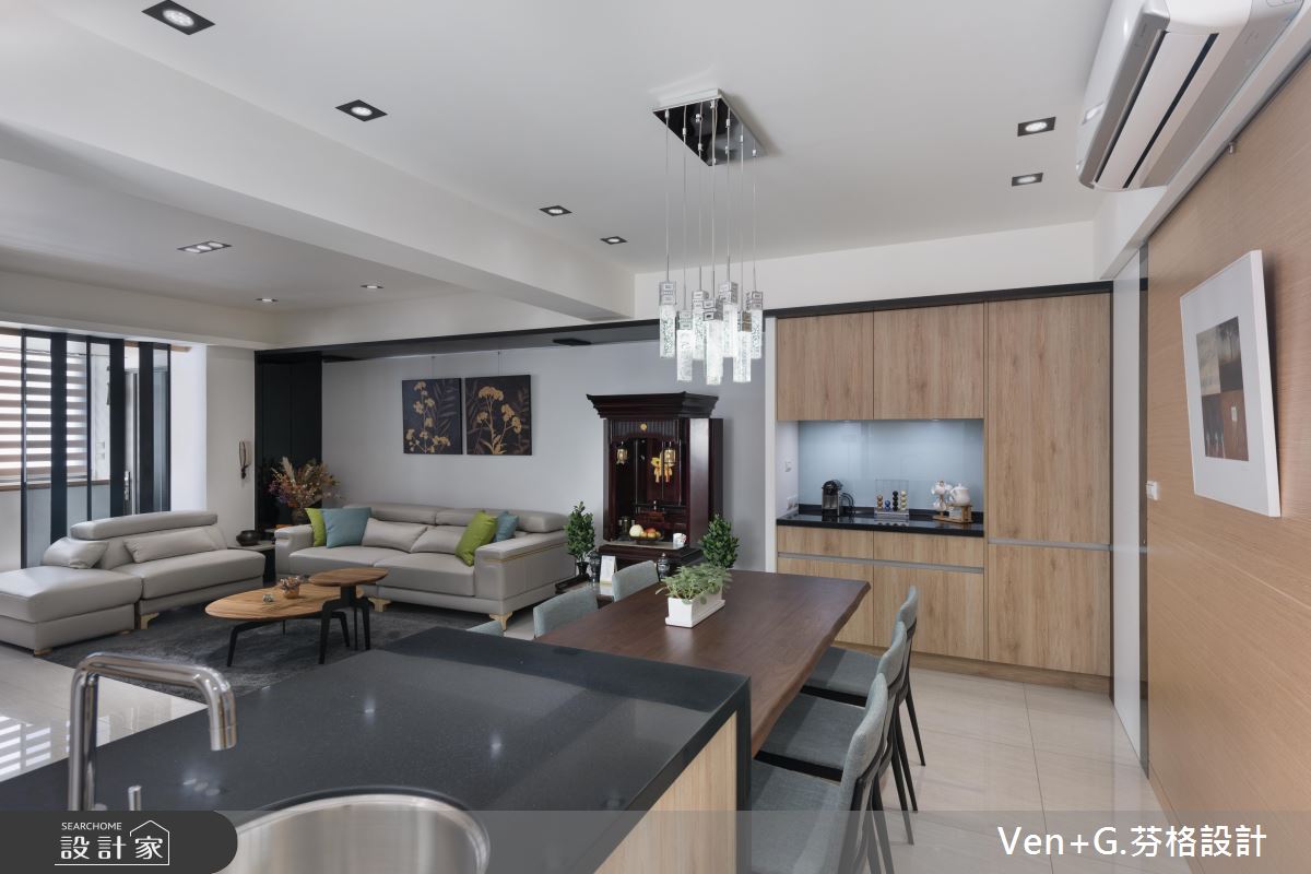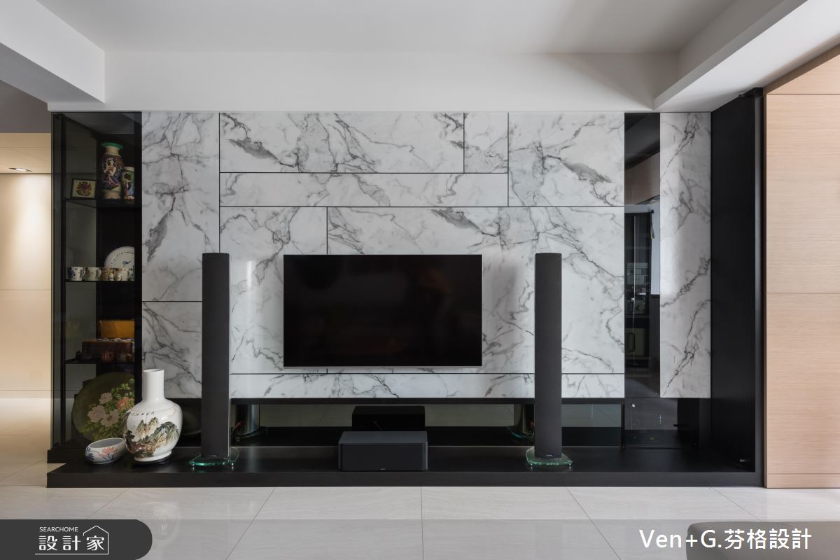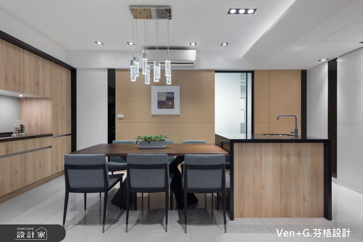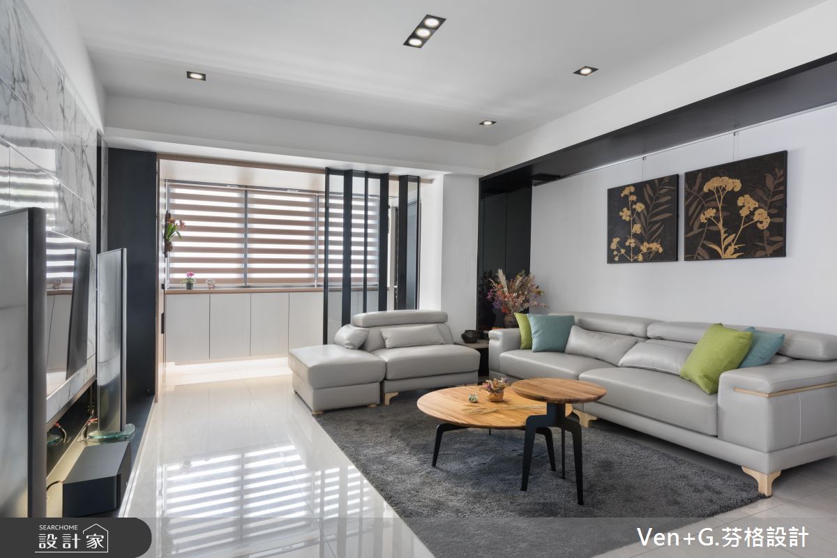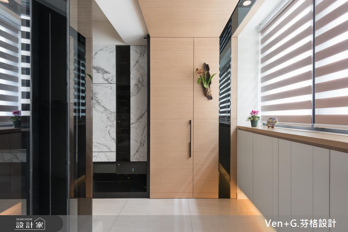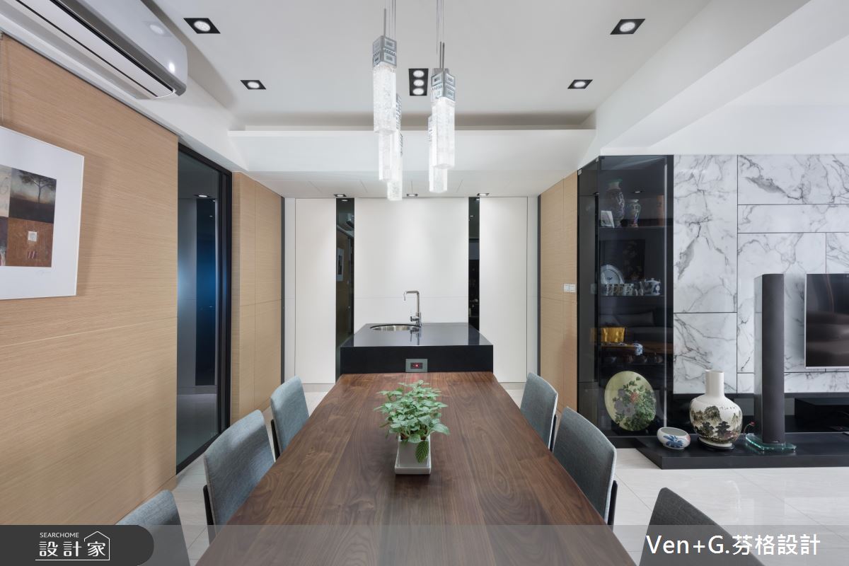 玄關區,利用木皮鋪陳天花,並於牆面加入完整收納機能,再規劃鐵件格柵穿插玻璃,做出廊道動線的導引,形成與客廳的穿透連結,達成放大空間效果;電視牆藉由用白色仿大理石飾板型構大器印象,呈現猶如潑墨山水畫的景象,旁側則嵌上玻璃櫥窗營造展示情境,讓主牆表情顯得輕盈更具層次;並變更廚房的位置,讓客餐廚之間的動線更為流暢,以中島吧檯結合餐桌的設計,增添空間的使用機能,並透過白色、木皮、鐵件等低彩度元素,營造自然人文風格,且刻意於周邊隱飾臥室的通道口,讓格局架構顯得完整不零亂!