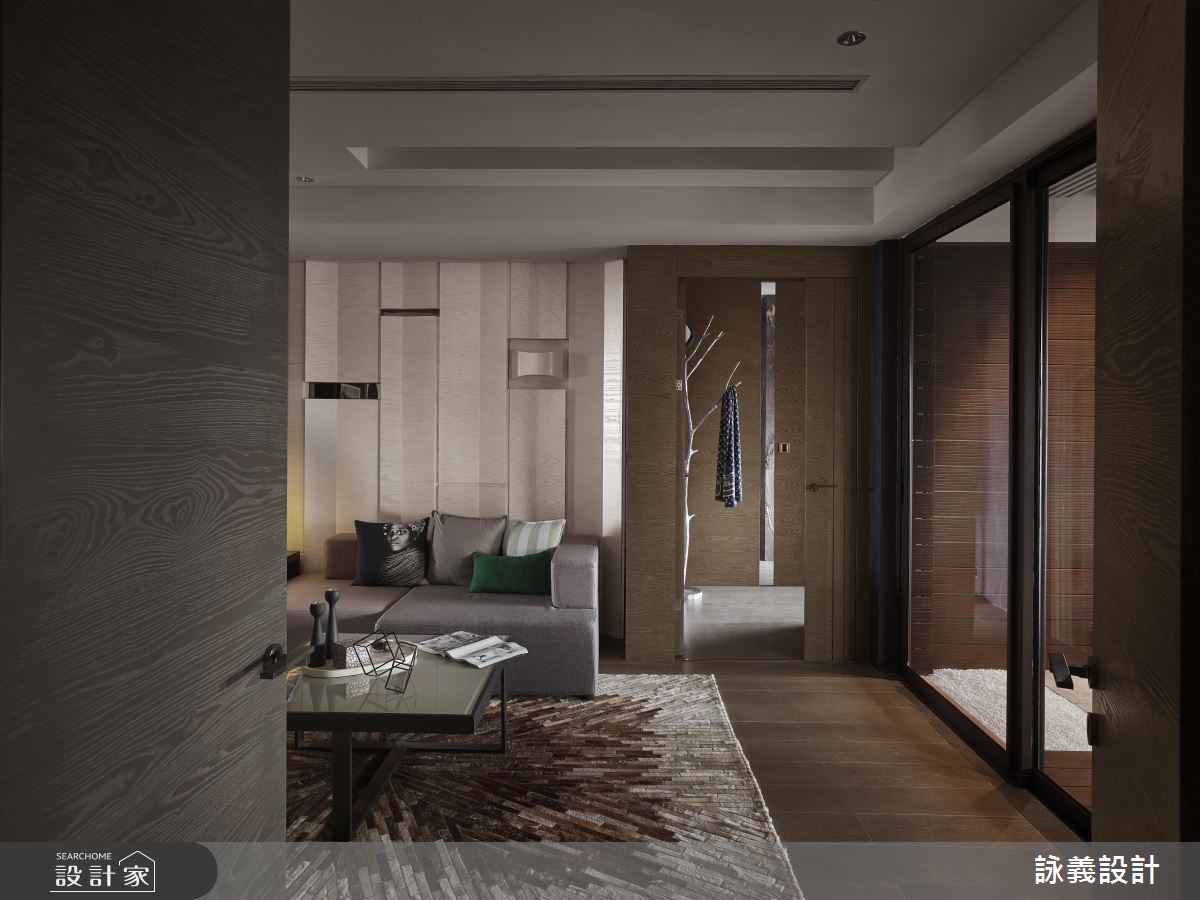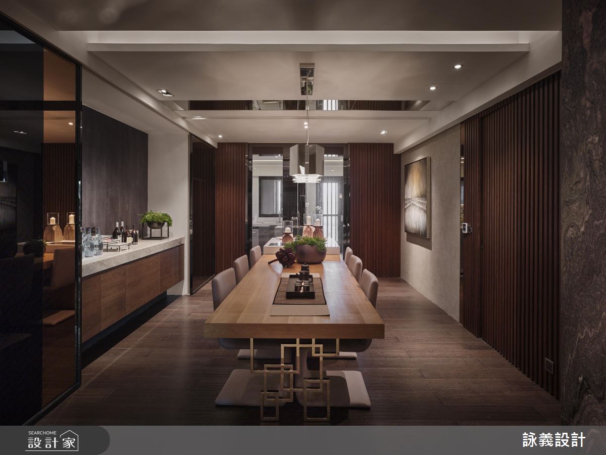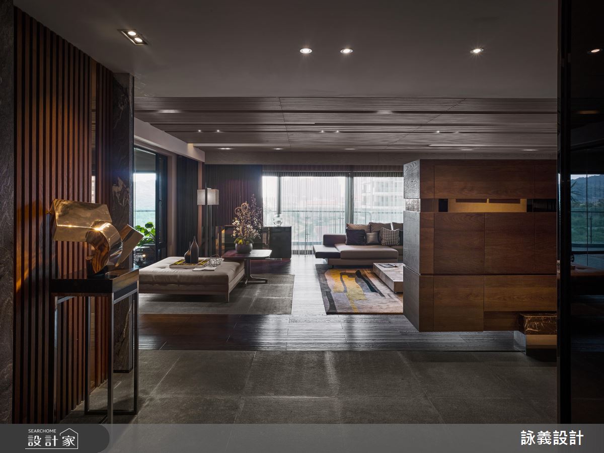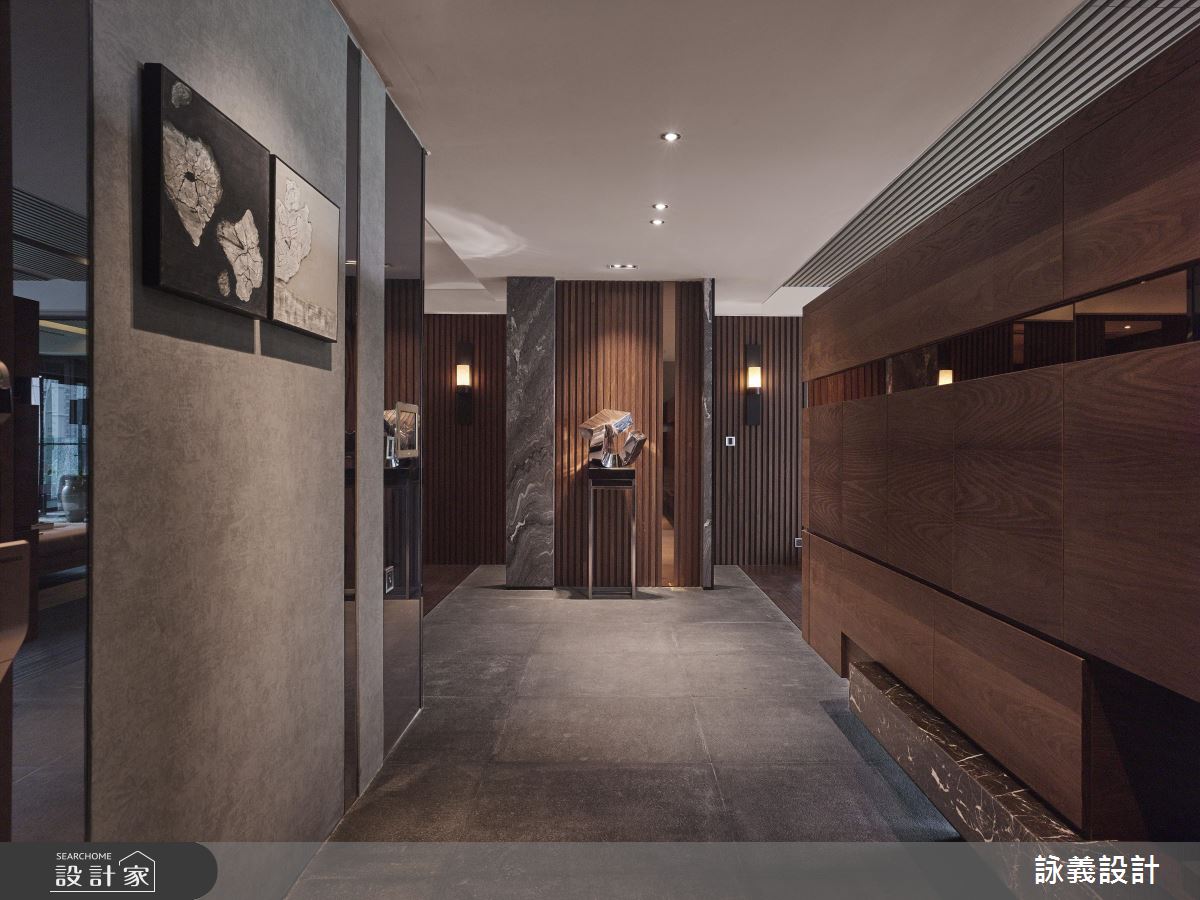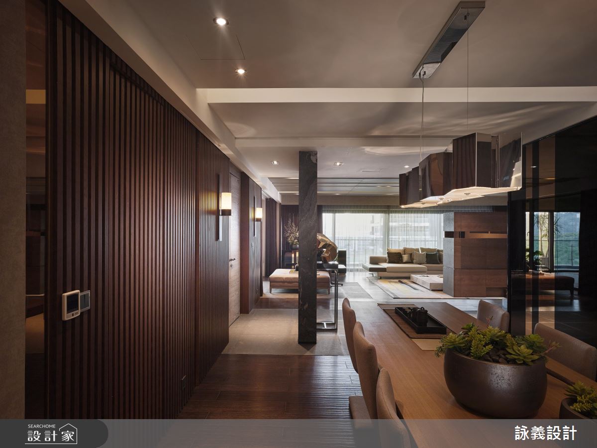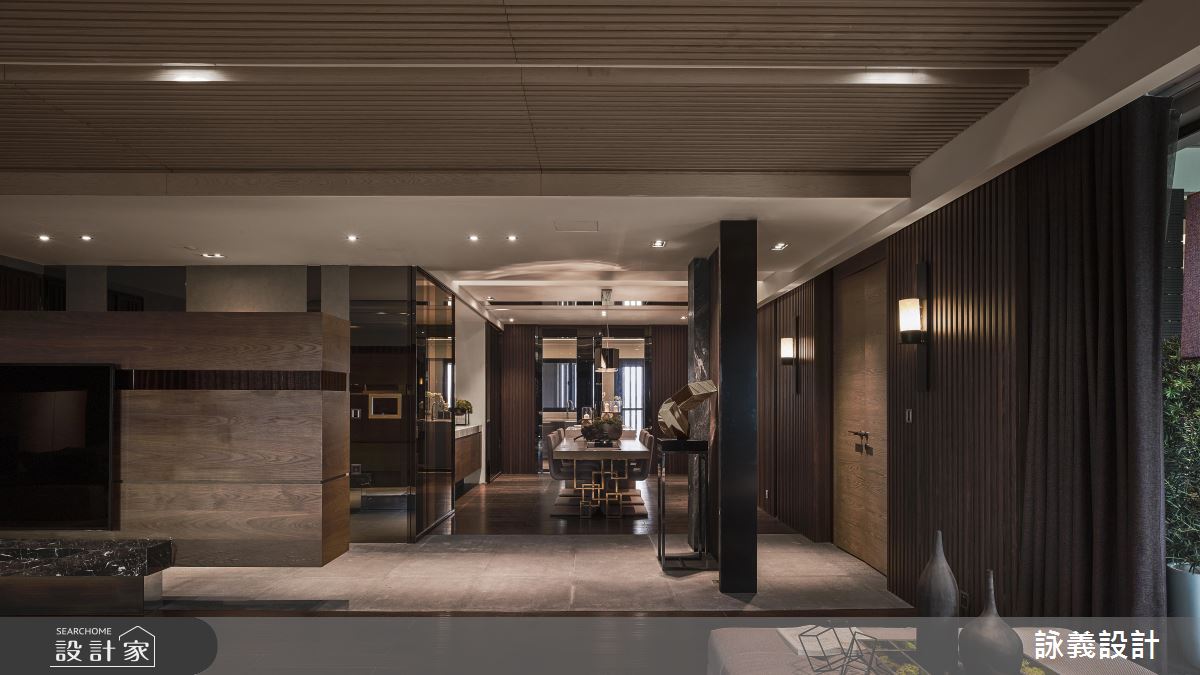深色石材鋪陳玄關地坪,天花板以嵌燈為照明,導引一條通往公領域的索引,電視牆背面以巨型木作堆疊出屏風機能,兩側鏡面的材質的妝點,視覺延伸感讓空間營造出更開闊氣度,視覺的盡頭以木作隔柵與石材打造出風格立面,細緻感的矮櫃上擺設藝術雕塑品,形塑端景造型;天花板以細長的木紋線條鋪陳,視覺不斷延伸、堆疊,形塑壯闊氣度,加上大面採光的優勢,自然光映照在天花板鏡面質材,創造出豐富的光影變化;玄關端景牆的另一側為餐廳,深色木紋地板鋪陳與隔柵壁面造型,加上原木餐桌與木作櫃體設計,鮮明的紋理與色澤調和出溫潤的用餐氛圍。