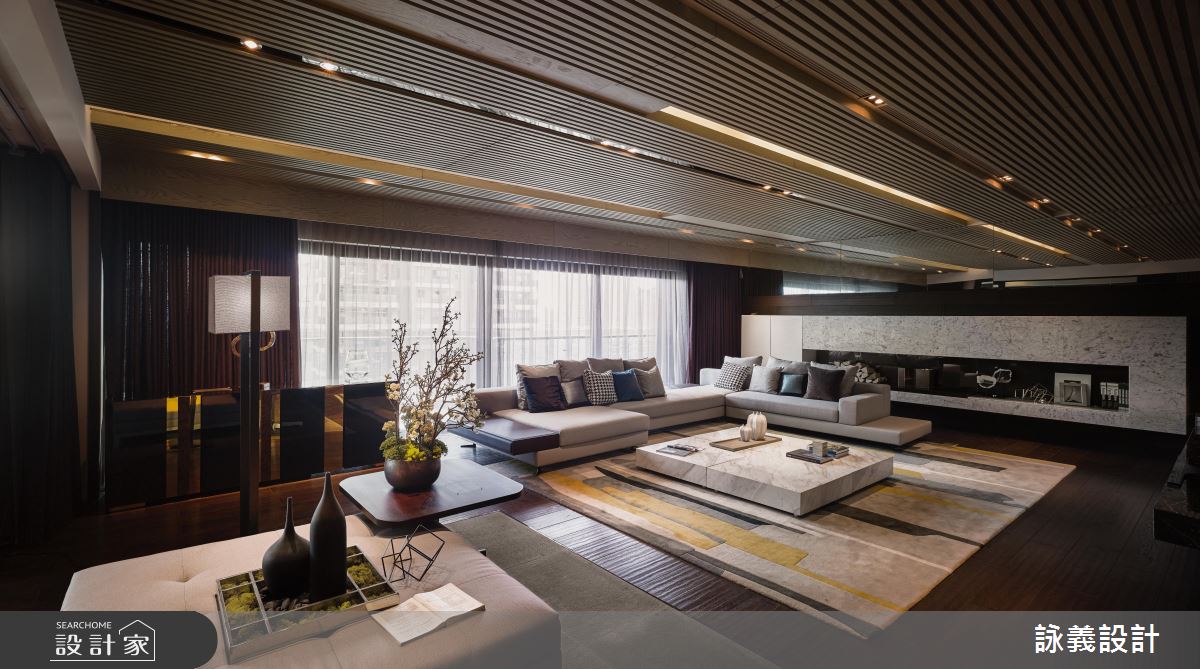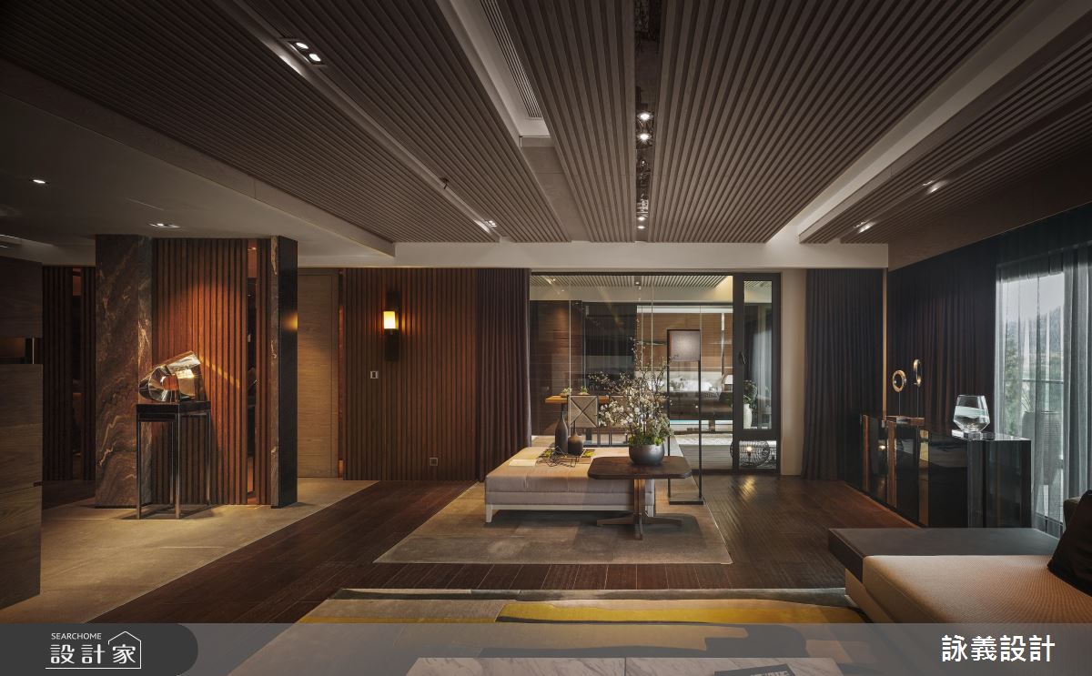 沉穩的大地色系鋪陳開來,細膩的木紋結構堆疊出壯闊的天花板造型,與隔柵造型的格屏、壁面造型相互呼應,且延伸一室漸層的美學風采;搭佐石材、鏡面與鐵件的現代感質材,俐落的線條描繪出獨特的屋主性格,更豐盈室內居家設計的視覺展現。