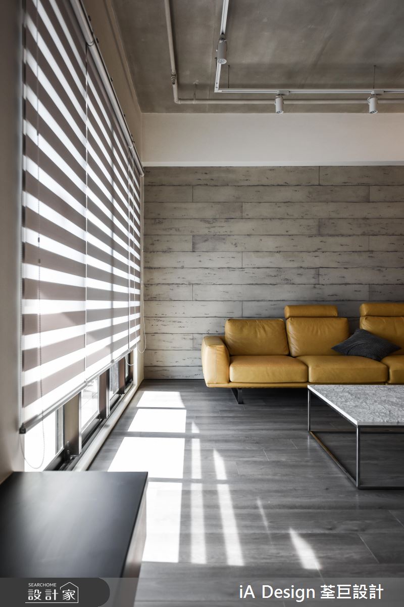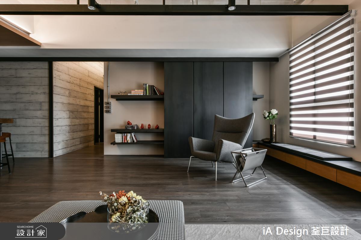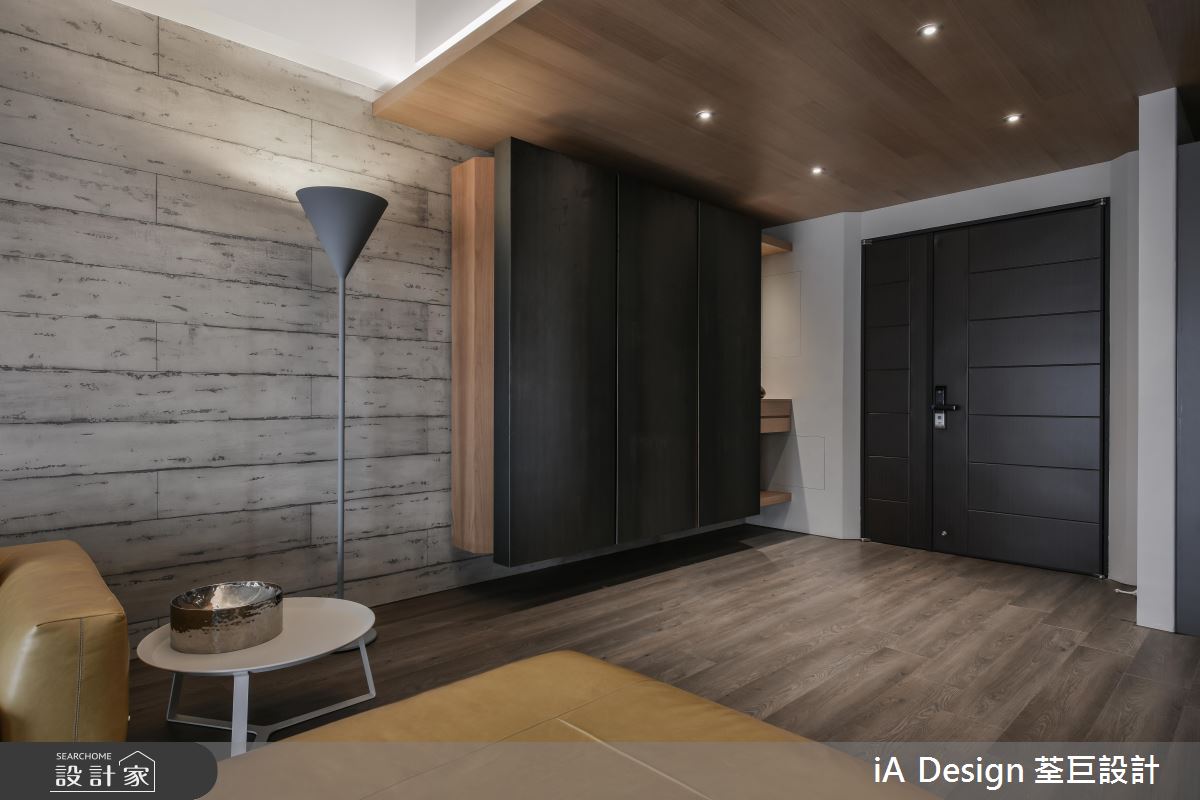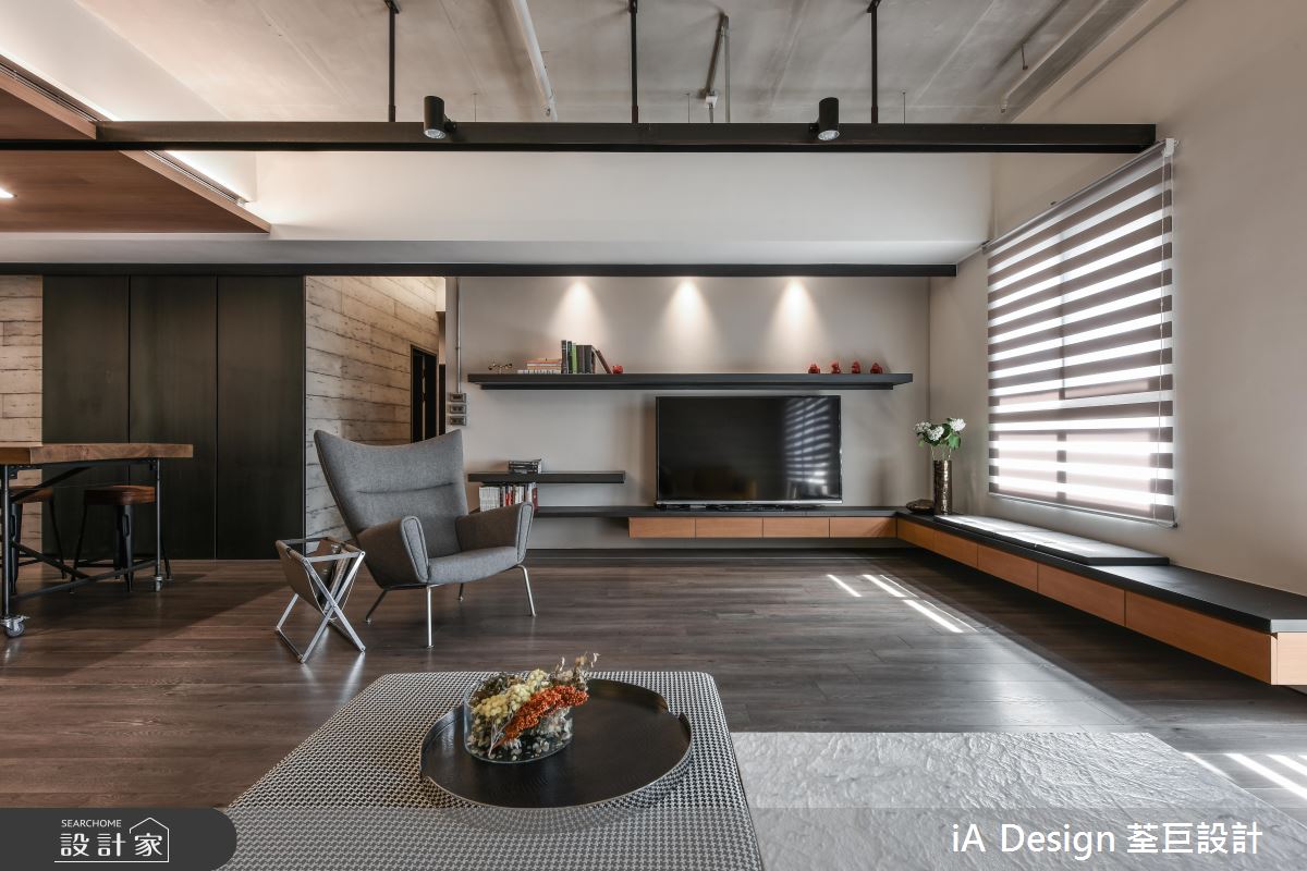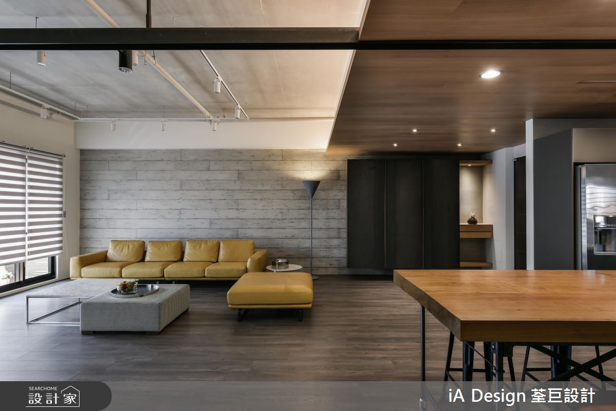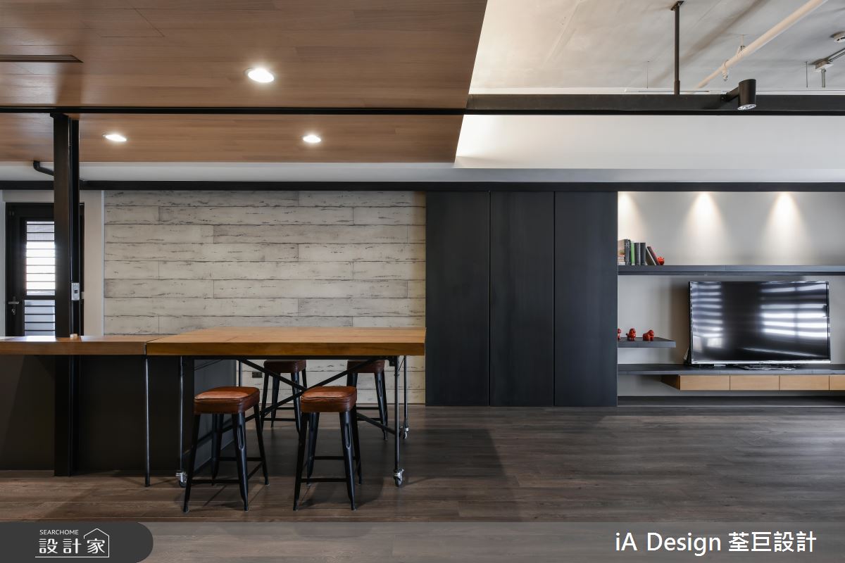 入門處,規劃大型玄關牆櫃,刻意採以黑色板材做櫃門,顯出沉靜紓壓的場景;空間內,則鋪陳大面積溫潤木地板,並納入充沛採光,保留大量留白,造就俐落開闊的視野,電視牆更規劃黑色層板置物架,既達成收納作用,又兼具展示裝飾效用,同時於天花配置長型軌道燈,刻意裸露局部管線,挹注粗獷有型的工業格調,搭襯黃色皮沙發畫龍點睛,增添視覺時尚元素;有別於客廳天花的簡約架構,來到餐廳,則轉換為木作天花,提示了空間過渡的界定,彰顯用餐區域的溫潤氛圍,並安排中島與餐桌齊平的高度,拉長場域空間感,而可活動式的餐桌設定,更提供了彈性多變的使用情境!
