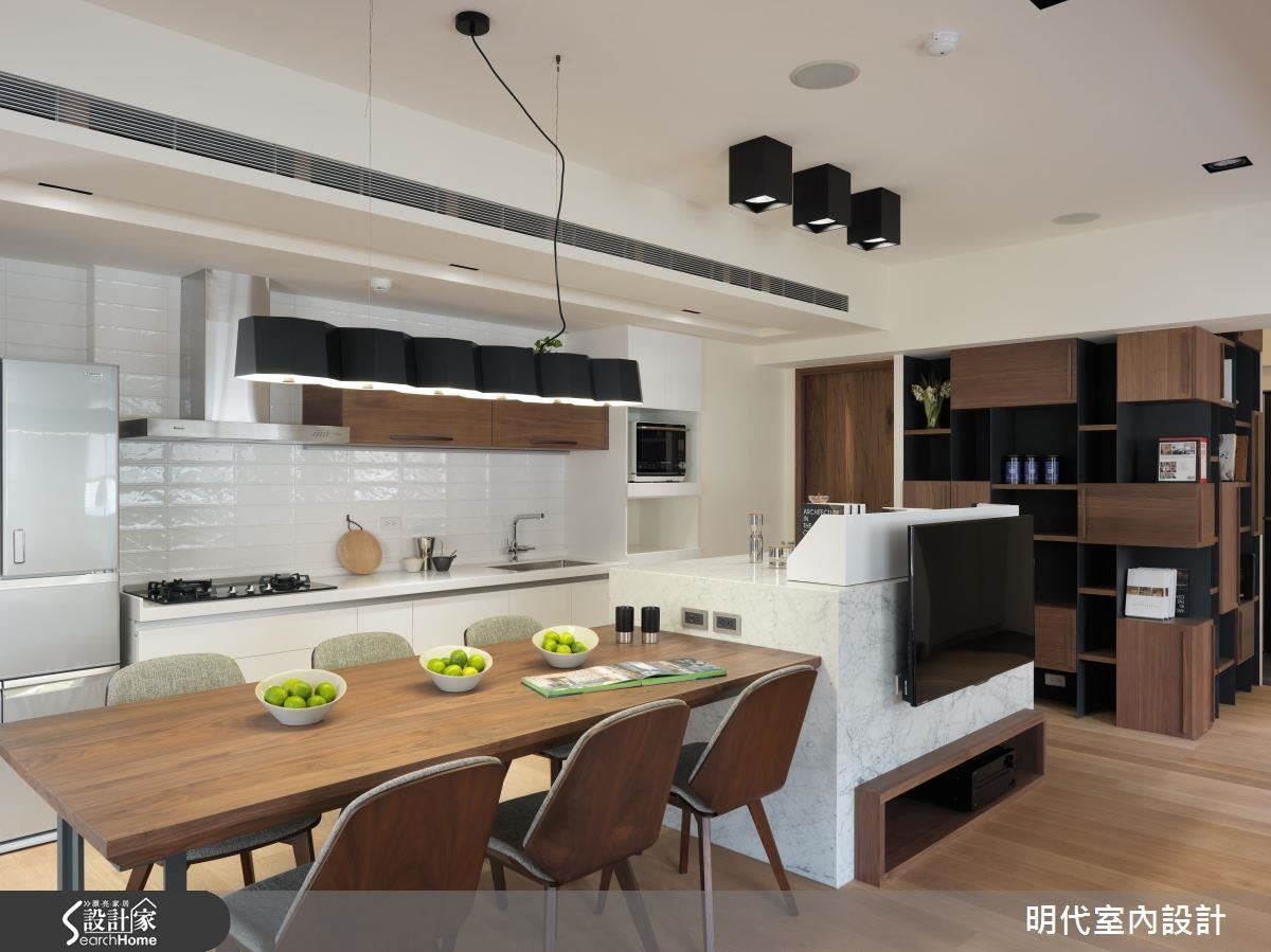 拆除舊有廚房和客房的隔間牆,把客廳、餐廳、廚房和閱讀區共同規劃為寬敞的公共區域,中央擺上一座中島,形成口字型雙動線,並結合餐桌和書桌、吧檯和電視牆機能於一體,滿足需求,也維持了空間的寬闊感。