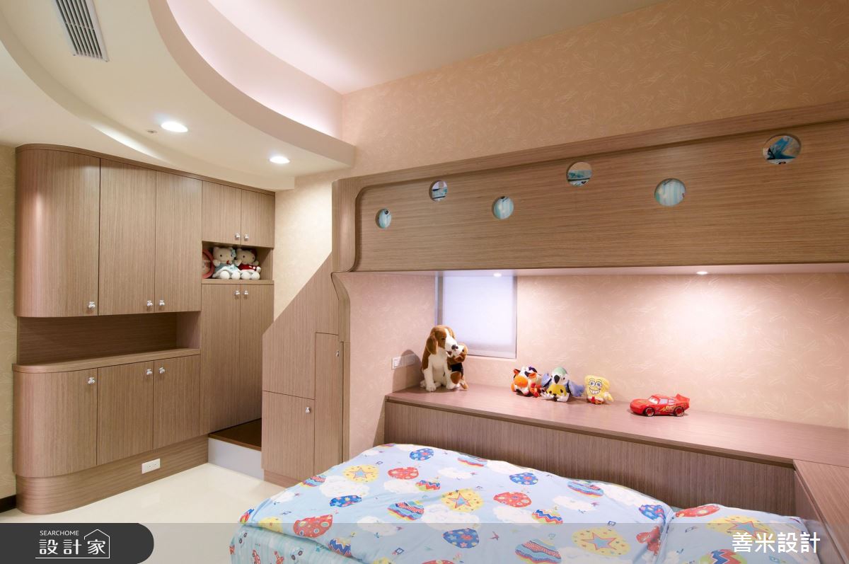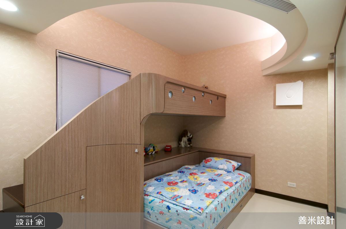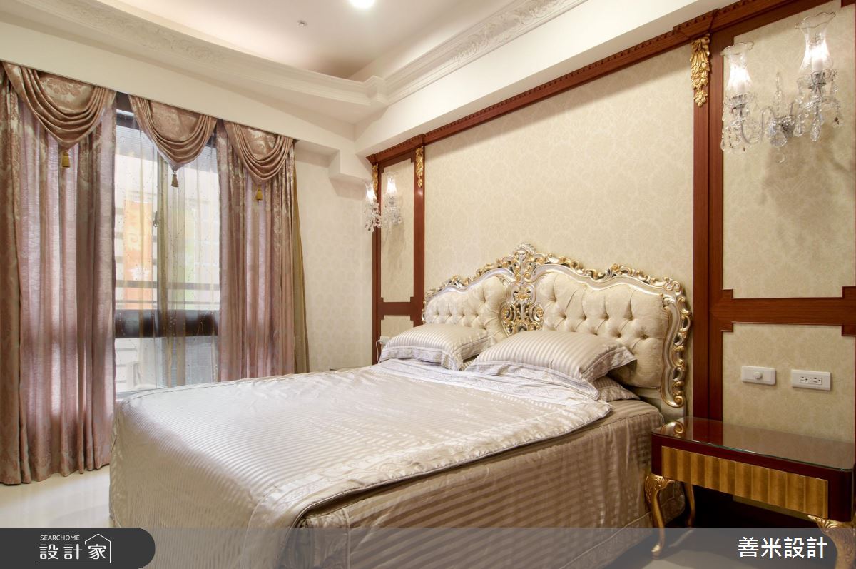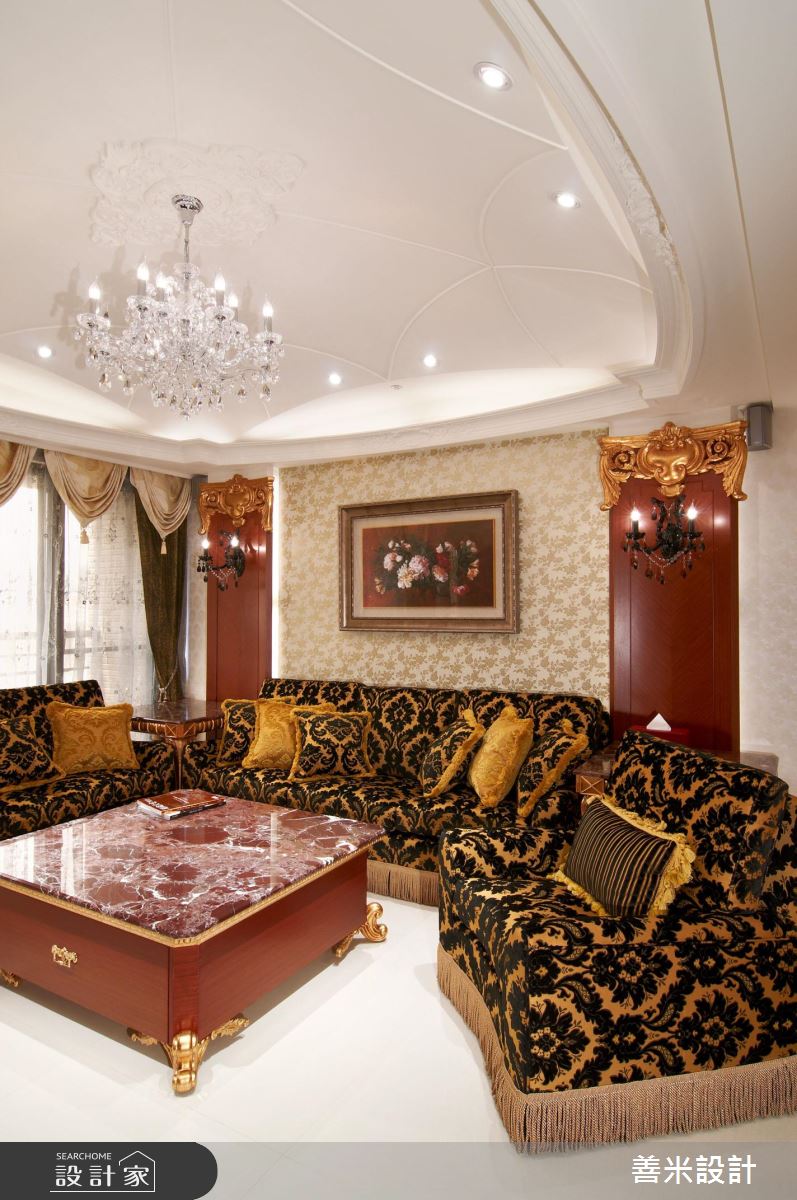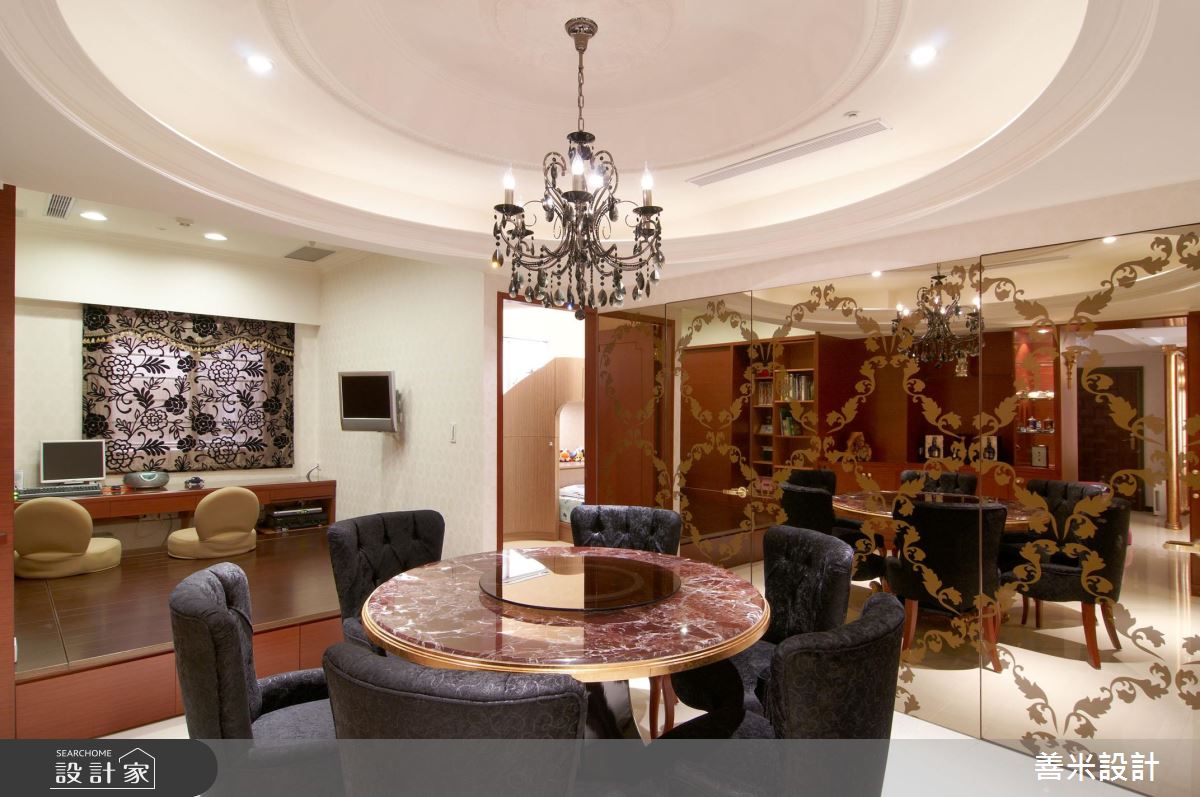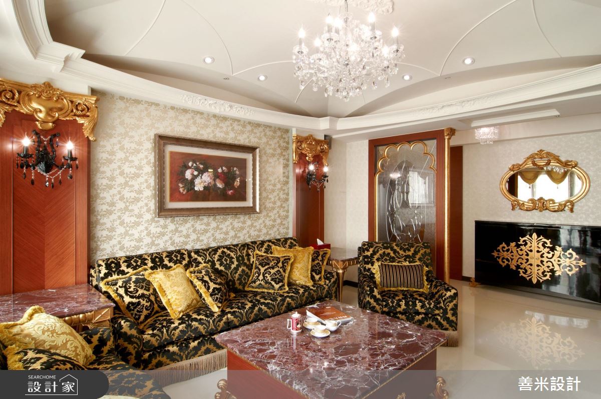 考量到一進大門會看到客廁入口,於是利用展示櫃、雙面餐櫃加以美化,不僅化解風水疑慮,也添注收納機能;空間整體引用古典風定調,天花板上加入一盞燭台式水晶燈,沙發則用鮮明的金、黑配色,採以黑雲石大理石建構電視牆,搭配暗紅色的實木家具凸顯出尊貴感;餐廳領域,則懸吊黑色水晶燈,和客廳的白色水晶燈形成對比,而大片經噴砂處理的鏡面,以及繁複的紗簾設計,則在在展現設計師對於細節的注重;轉進主臥,可見到床頭雕樑畫棟般的設計,配上細緻壁紙、實木衣櫃等,承襲著美好的古典風韻,也兼顧舒適與實用性;兒童房,除了配置機能床組,更技巧性地於櫃體周邊加入弧型導角,和天花線條相得益彰,創造空間中的流線趣味感!