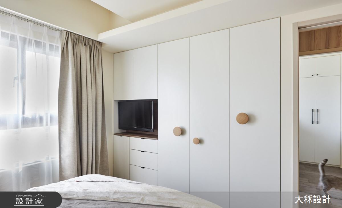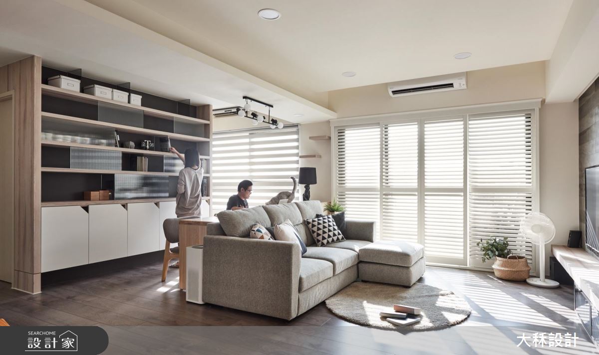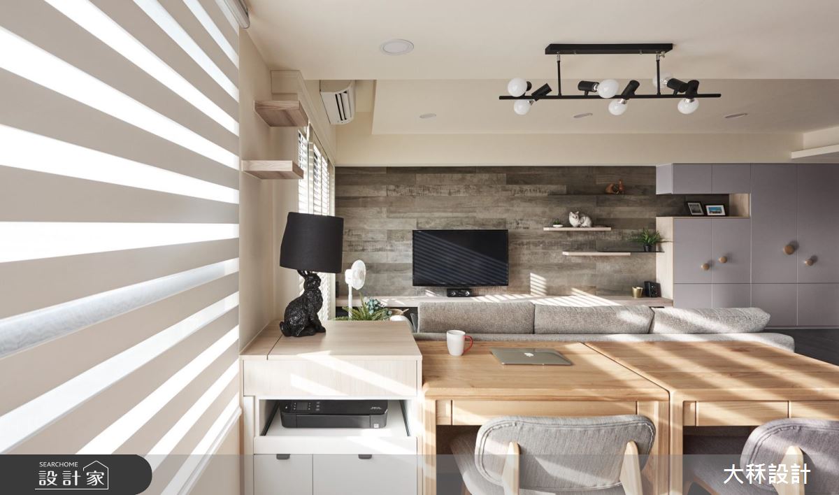 客廳區,讓電視背景牆呈現仿舊的木作色彩,與地坪形成微妙呼應,形成空間視覺的連貫性,並整合視聽櫃與鞋櫃,串起整道立面的機能表情,同時在牆面安嵌展示層板,既提供裝飾作用,也成為家裡貓咪活動的貓跳板,而廳區也刻意不設桌几,保留一大塊留白場地,成為主人與貓咪共同玩耍的場域,搭配著百葉窗扇導入和煦陽光,創造出清新舒適的居家風景;而原先的主臥房則拆除改為書房,與客廳相互串聯,僅以一排書桌做出界定,締造無時無刻的互動情境,書櫃規劃也蔚為特點,上層以開放式書架結合玻璃門片,下方則是整排封閉式櫃體,啟動更多元的儲物功能;臥室內,更善用每一吋坪效,將衣櫃和客廳加以結合,以一體成型的規劃不佔用多餘空間,充分發揮小而實用的機能效益!