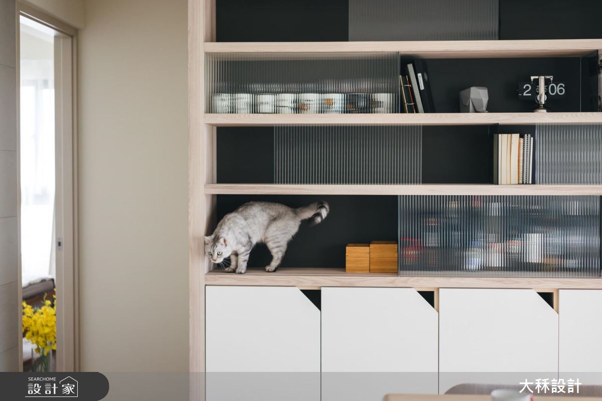 為了讓屋主的寵物貓咪可在室內自在活動,規劃了許多符合貓咪活動習慣的小細節,例如錯落的層板,或將燈槽內特別封平,讓貓咪可在上方自由走動,且顧及貓咪的衛生習慣,刻意將貓砂盆特別隱藏於櫃內,打造出人貓均感舒適的生活視野!